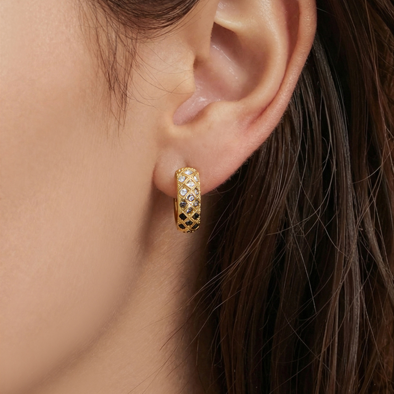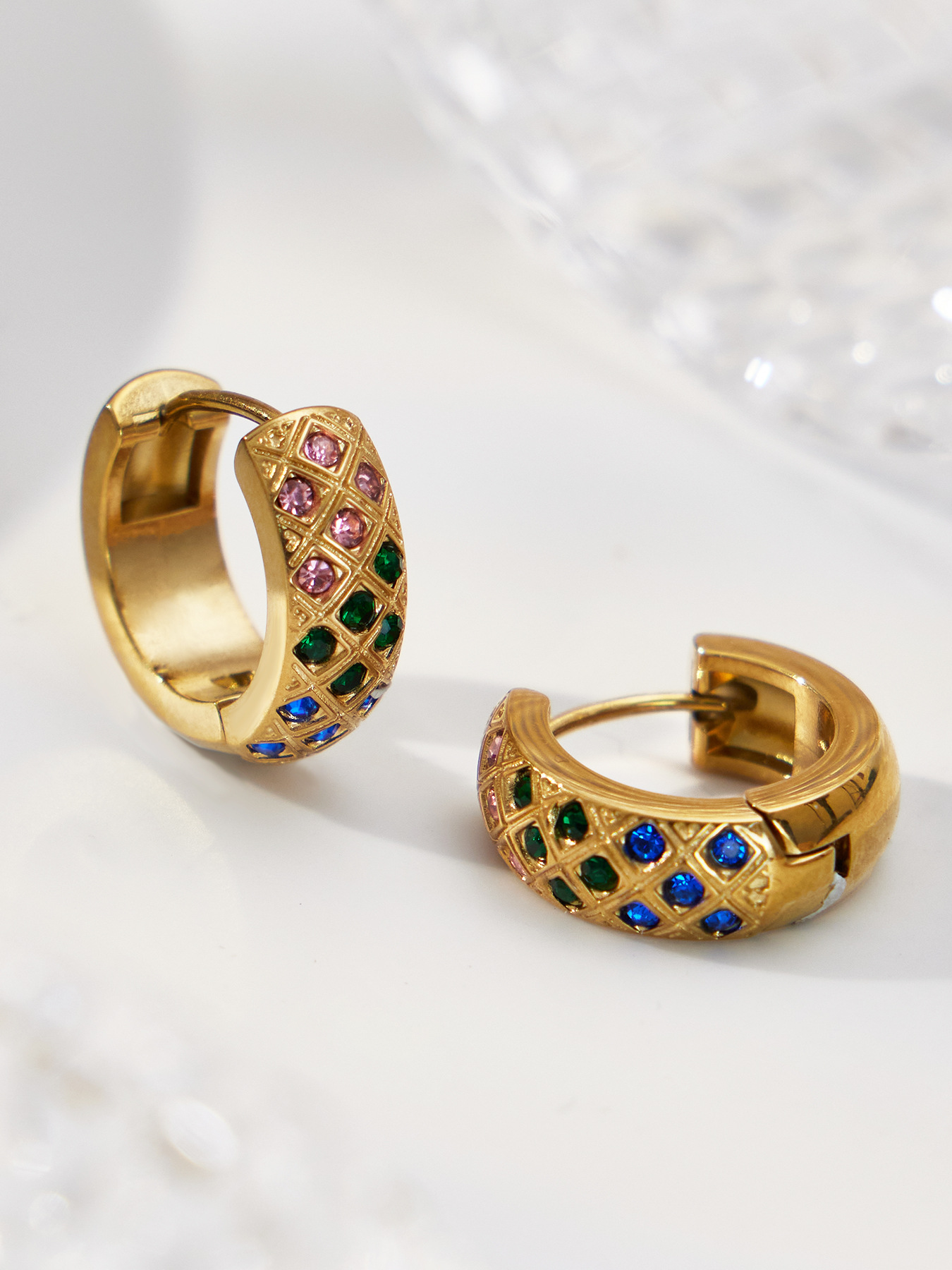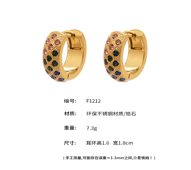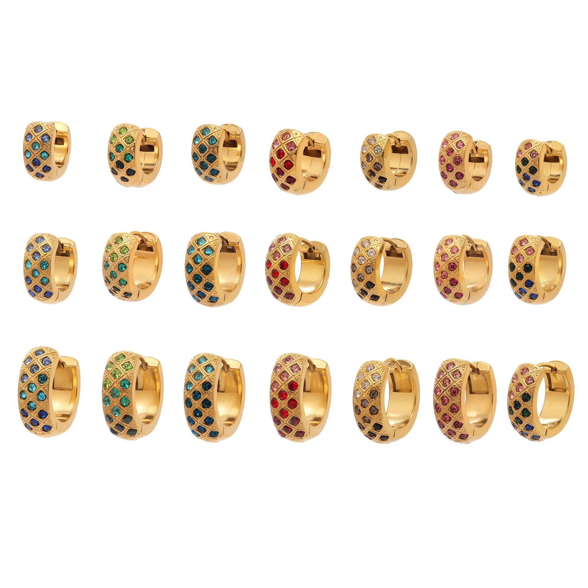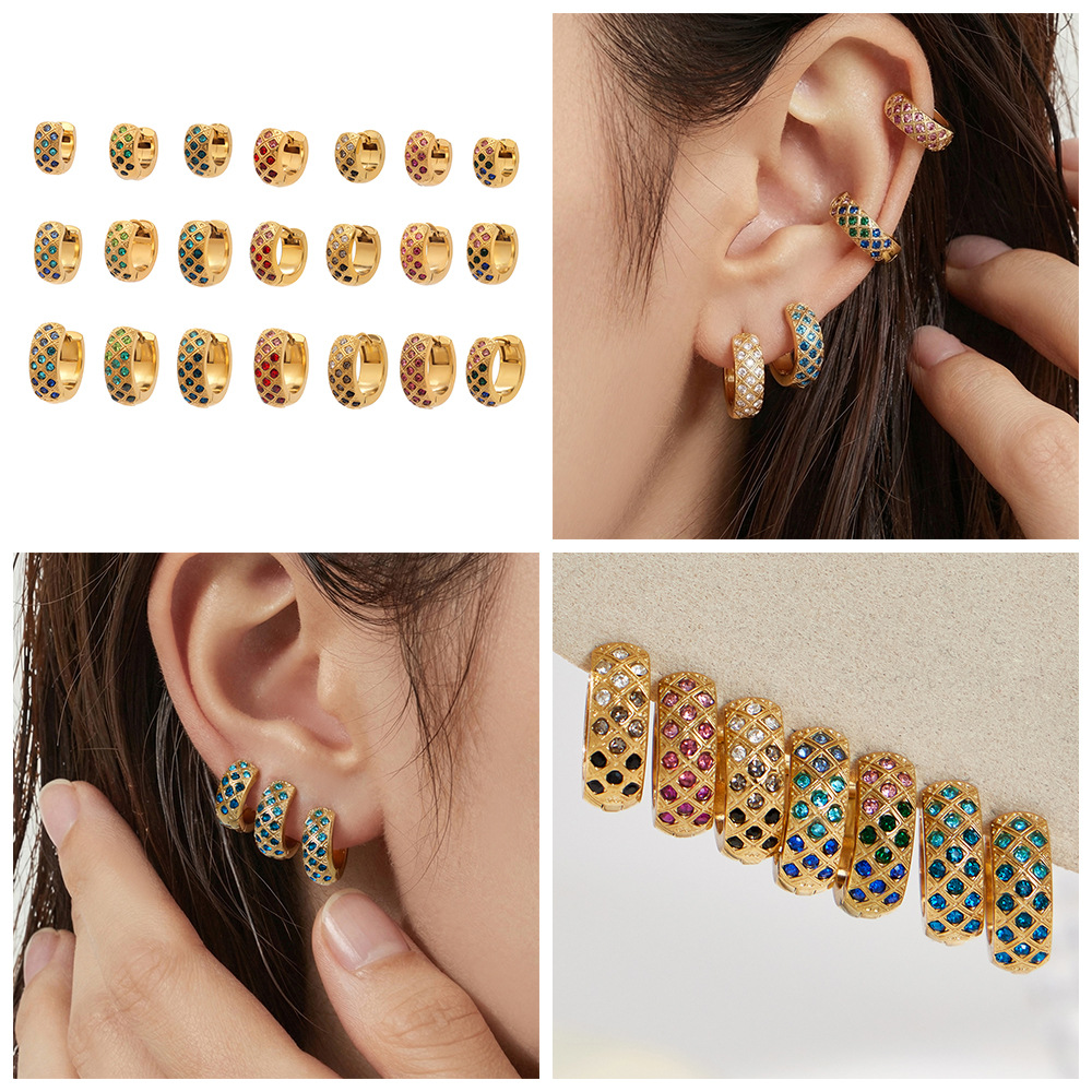 谜丽 新款不锈钢彩锆菱格纹耳圈镀18k真金时尚精致轻奢多尺寸耳扣