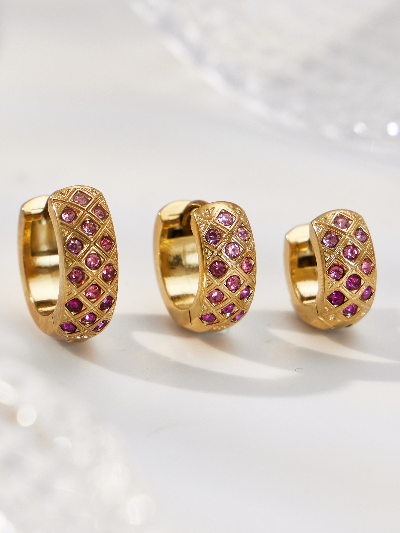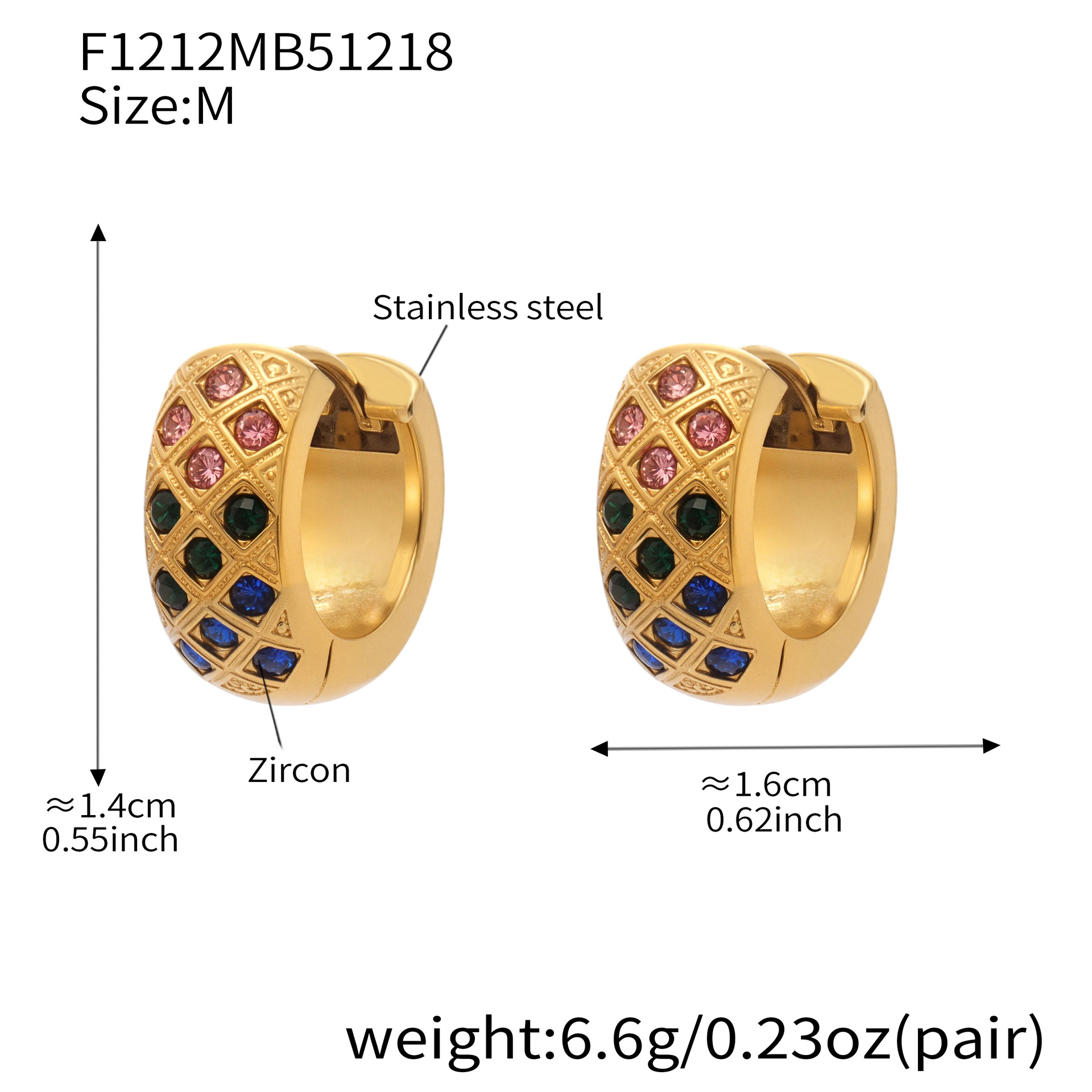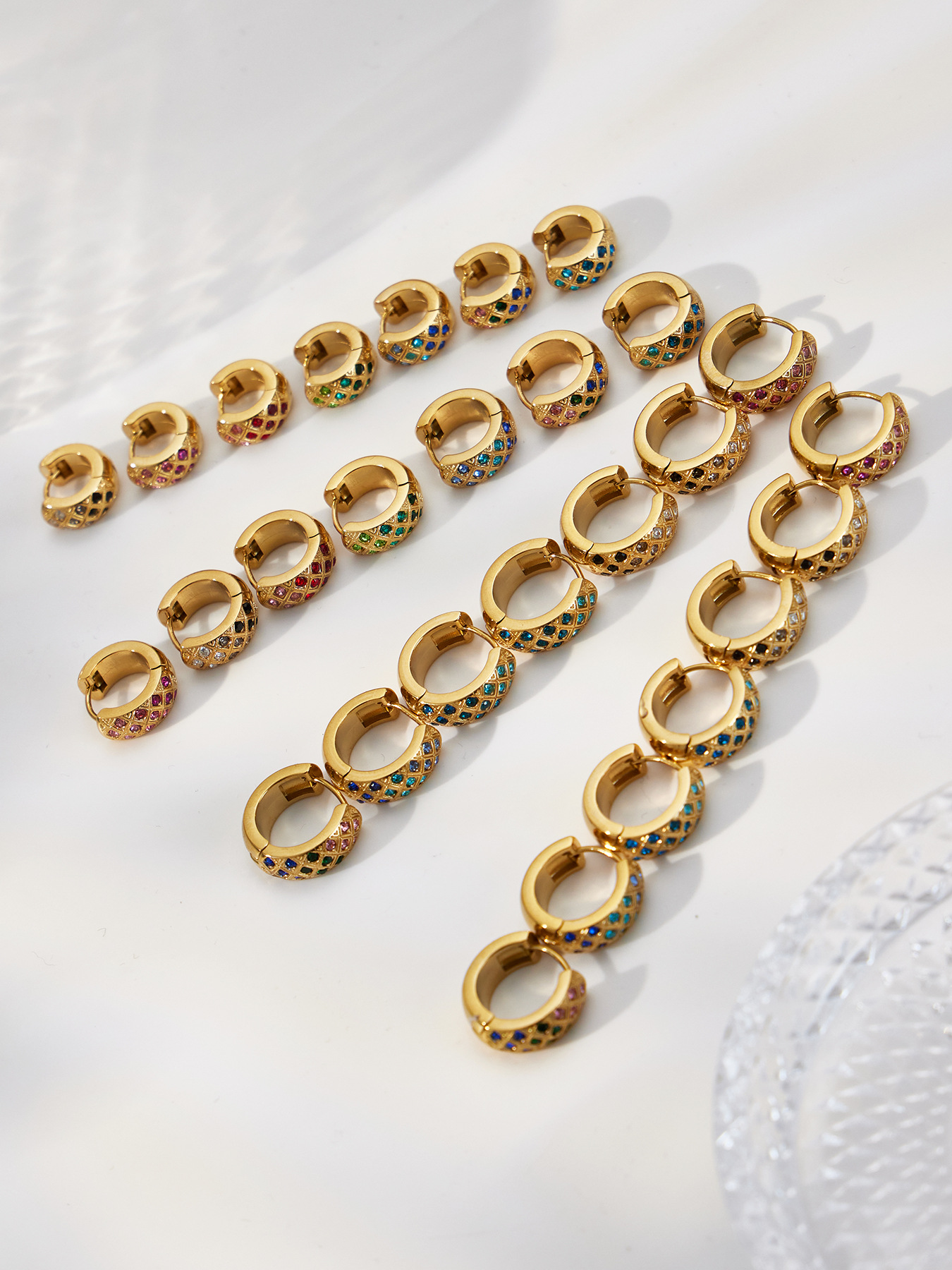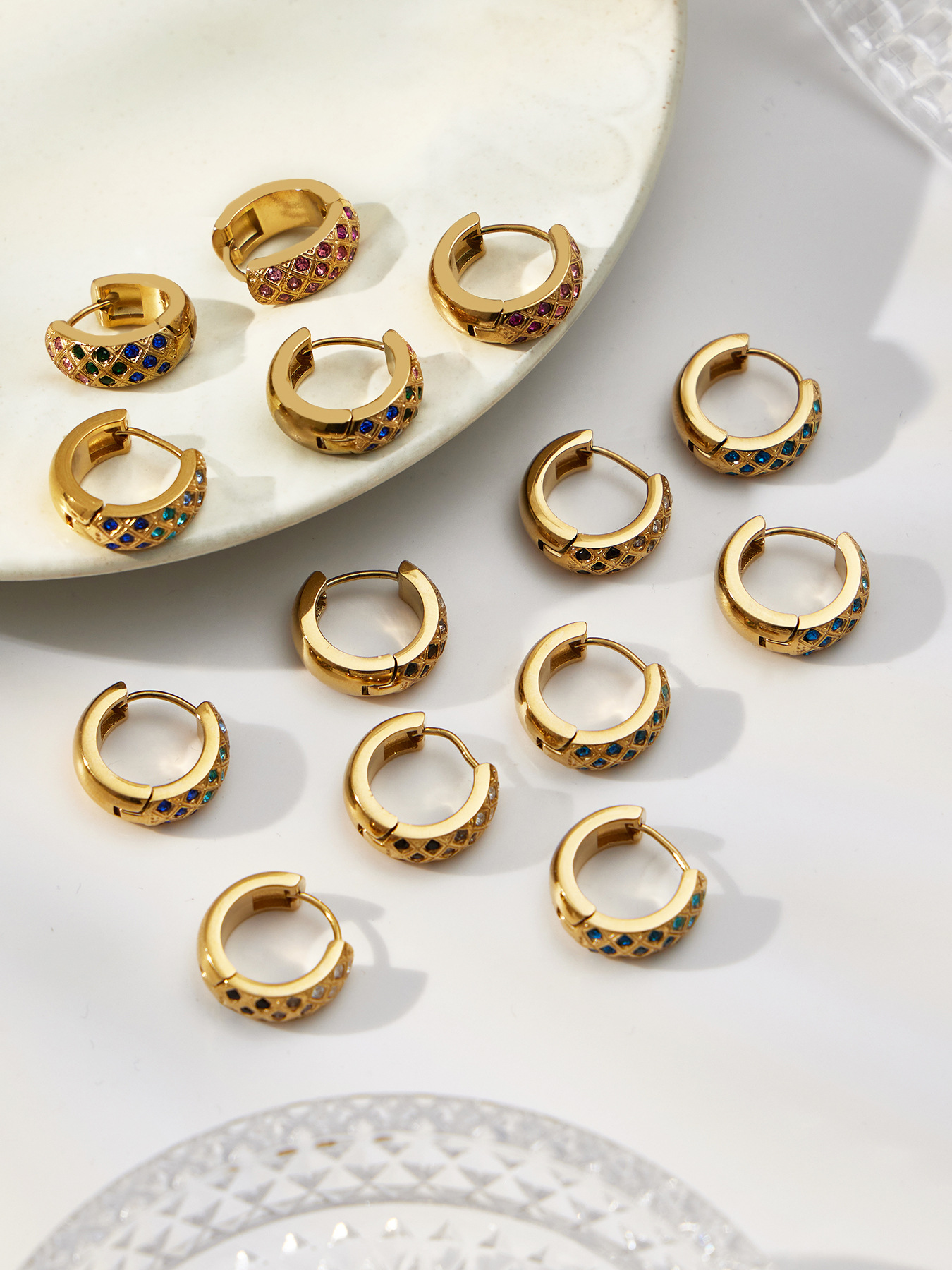 谜丽 新款不锈钢彩锆菱格纹耳圈镀18k真金时尚精致轻奢多尺寸耳扣