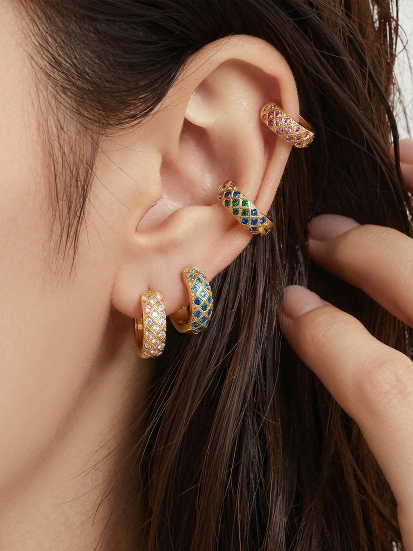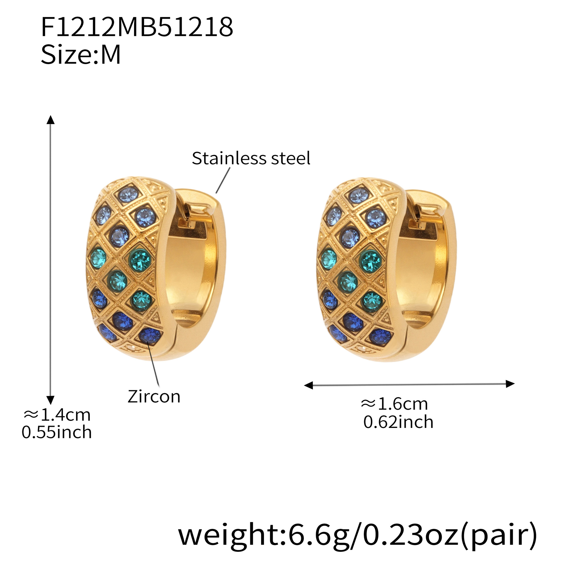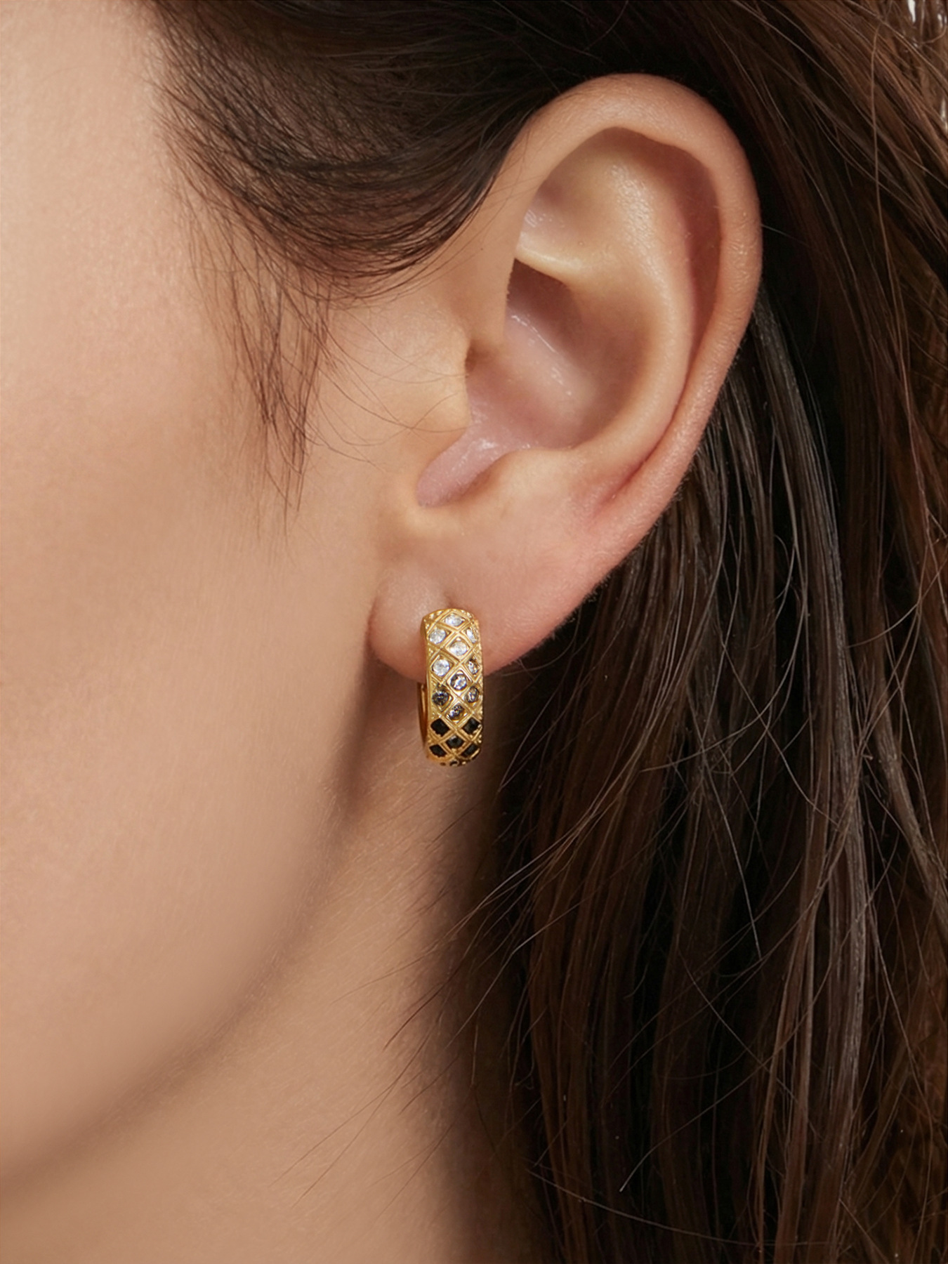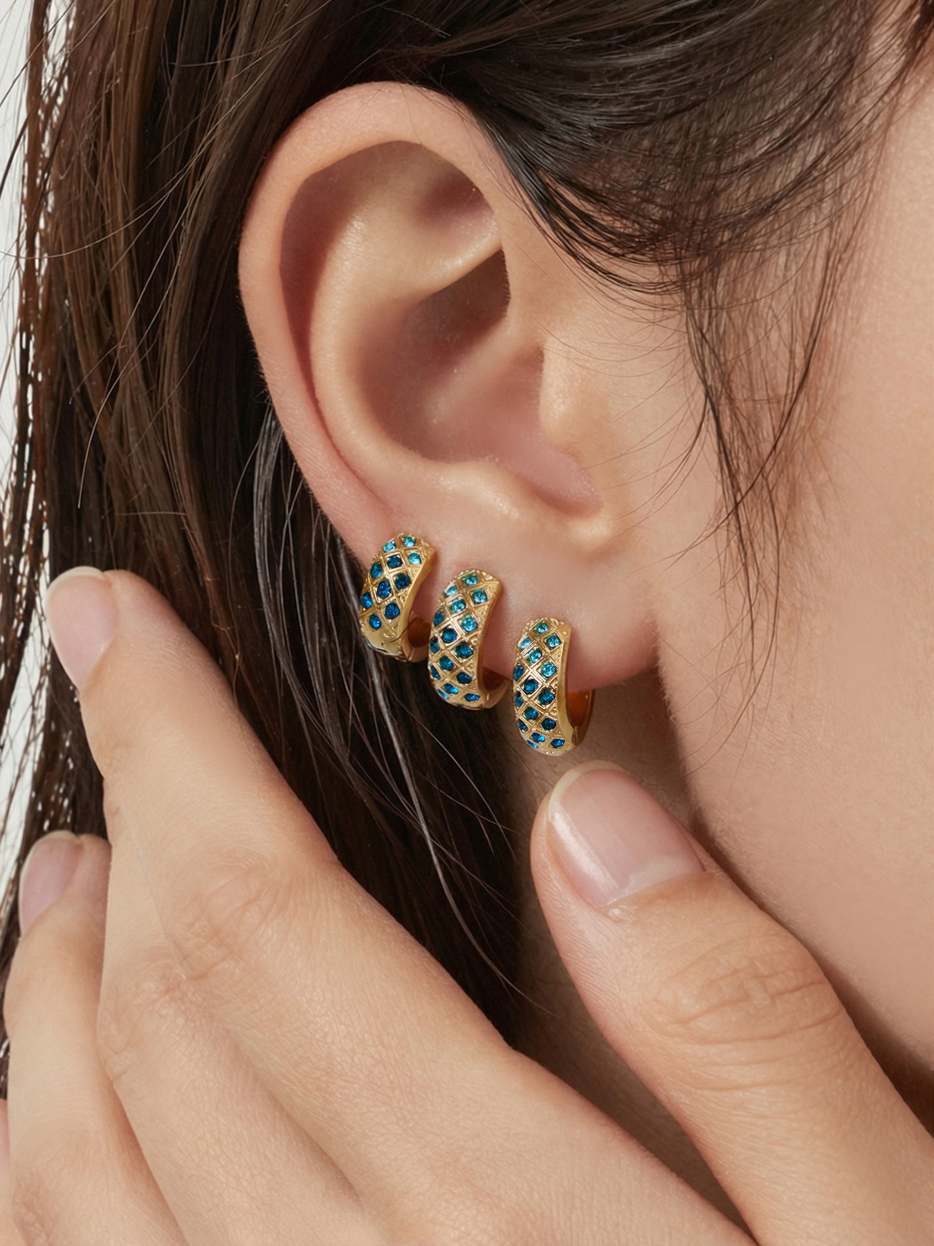 谜丽 新款不锈钢彩锆菱格纹耳圈镀18k真金时尚精致轻奢多尺寸耳扣