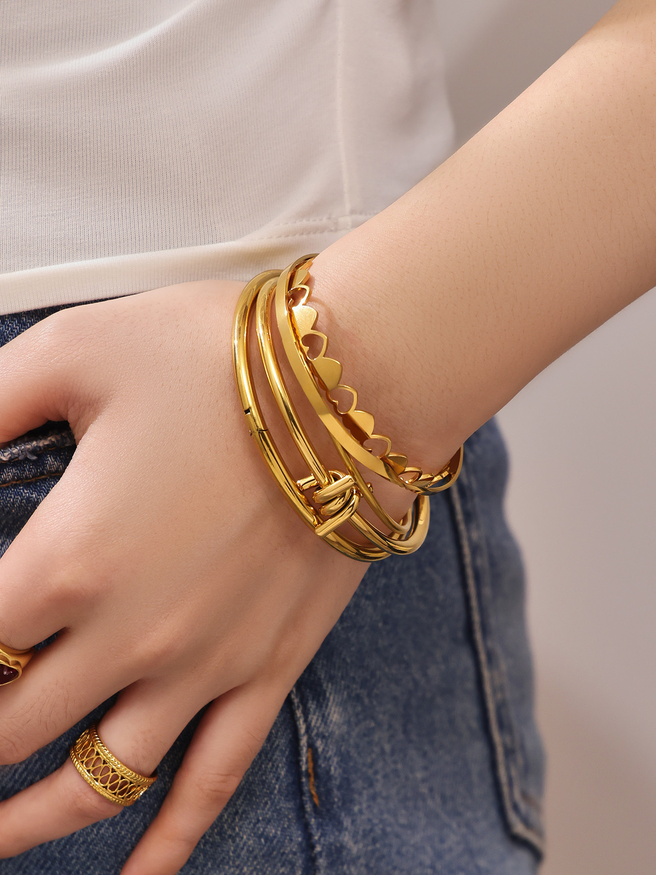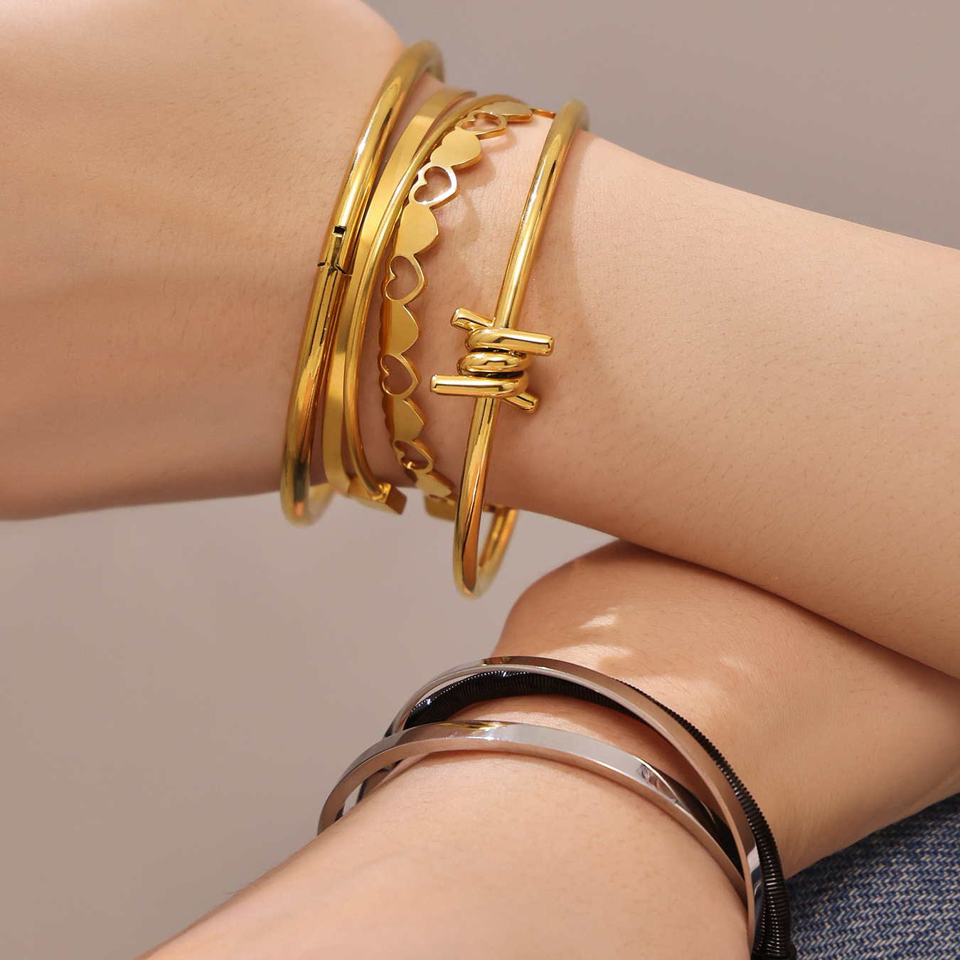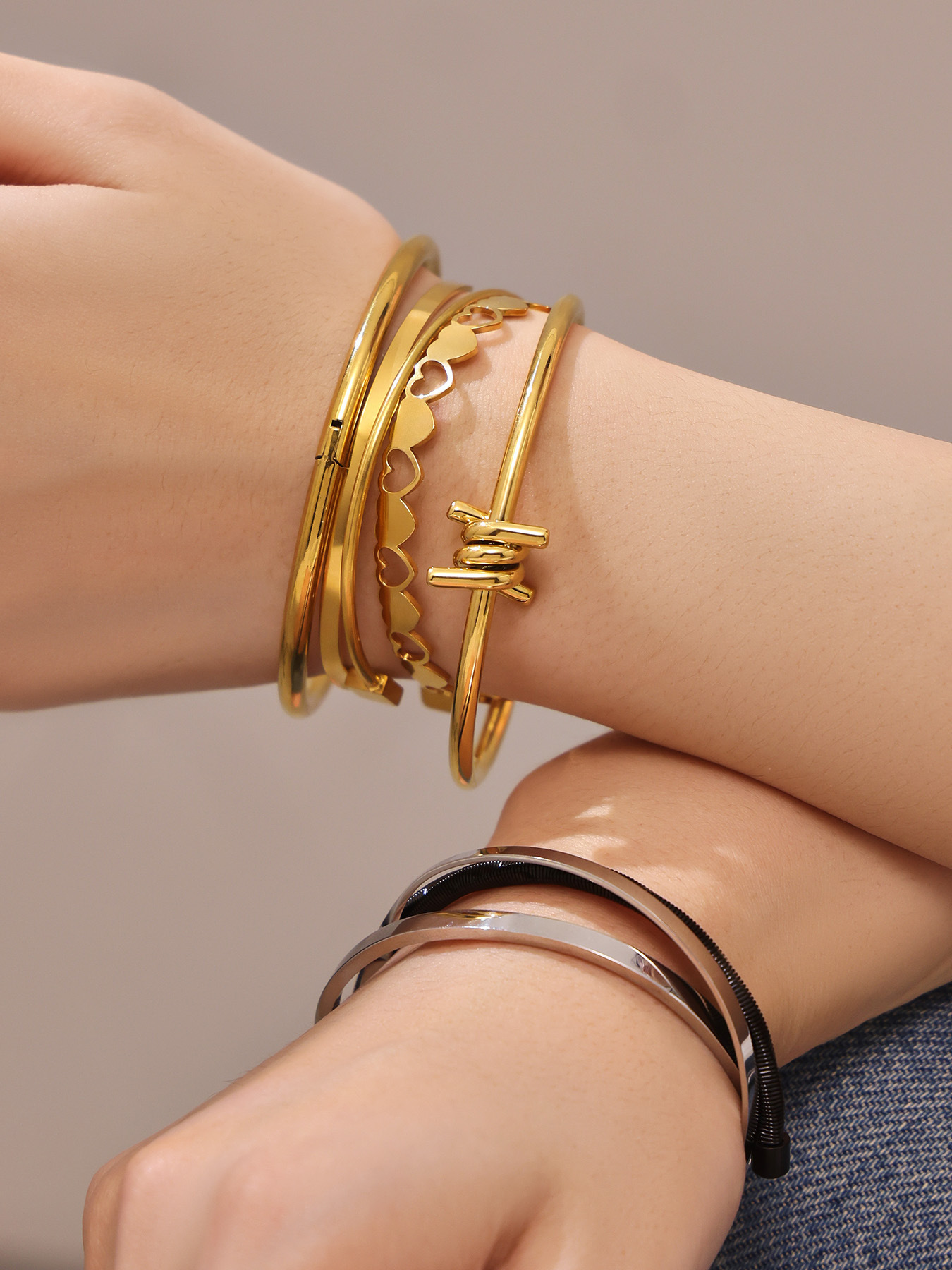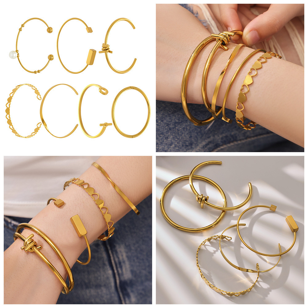 谜丽不锈钢心连心手镯女简约ins风镂空设计几何手环组合镀18k真金