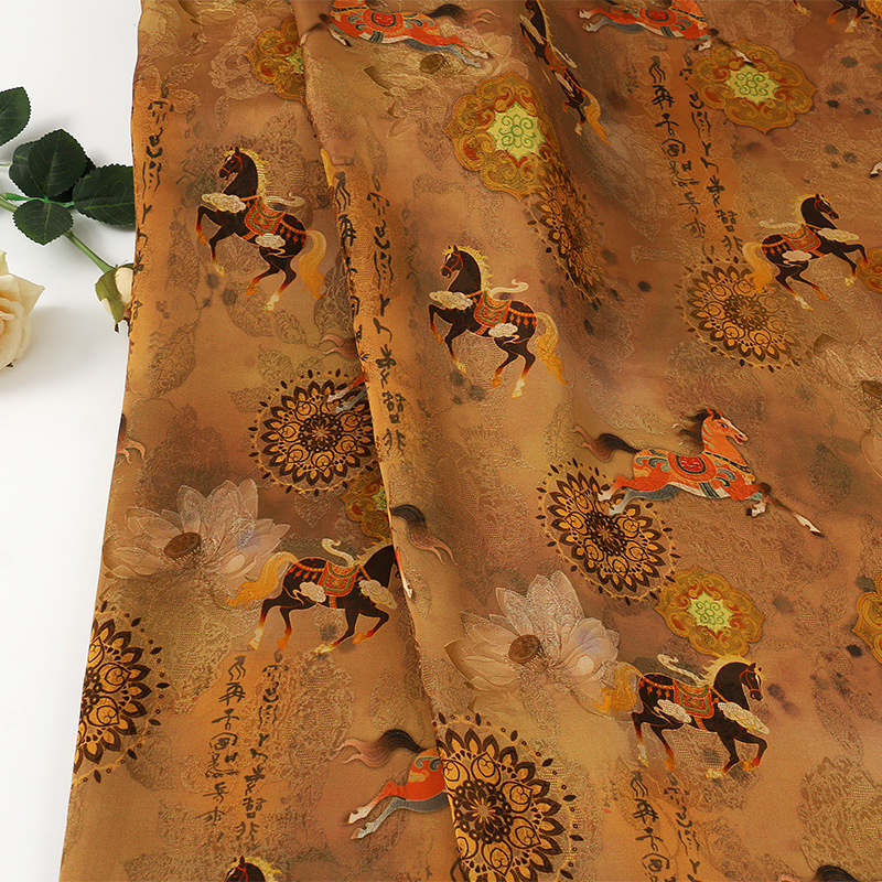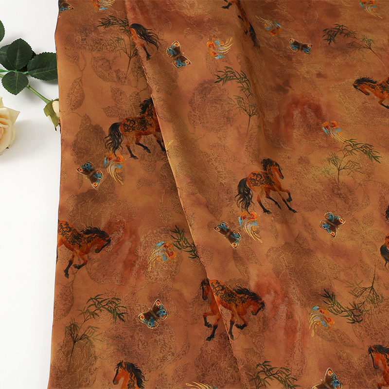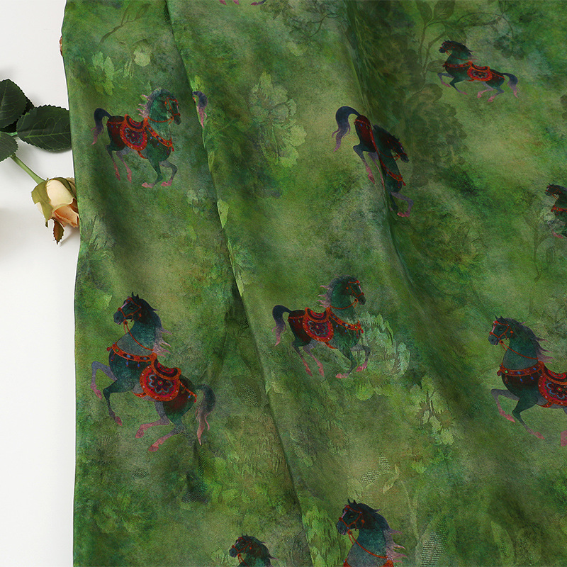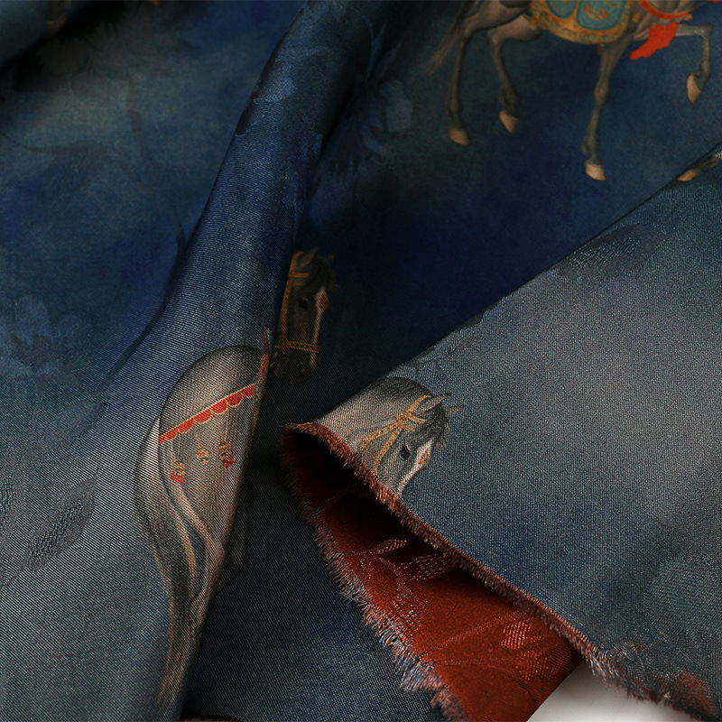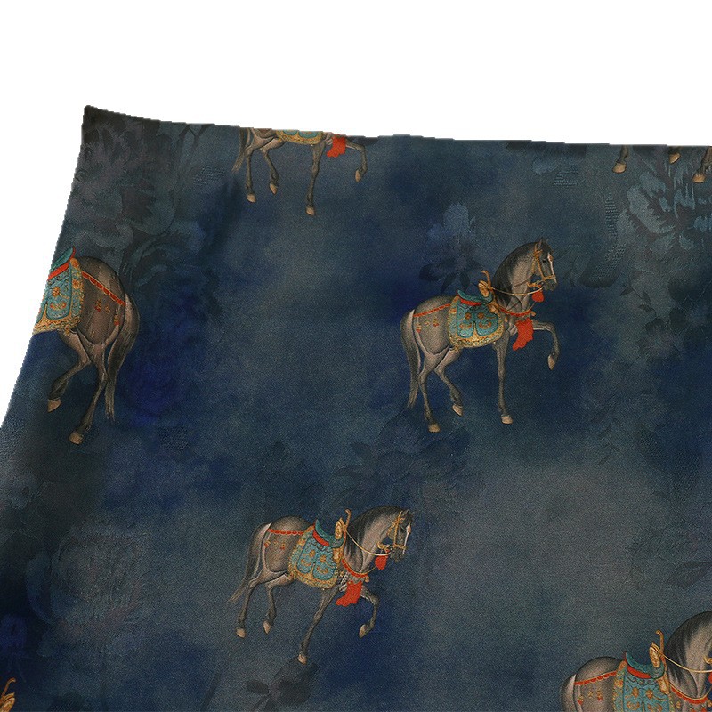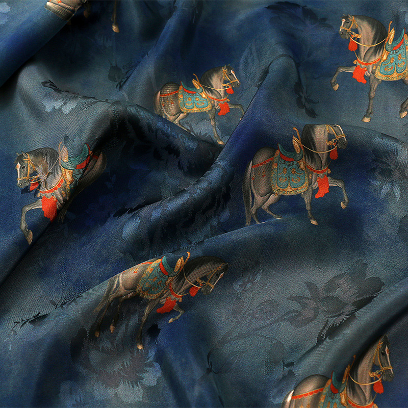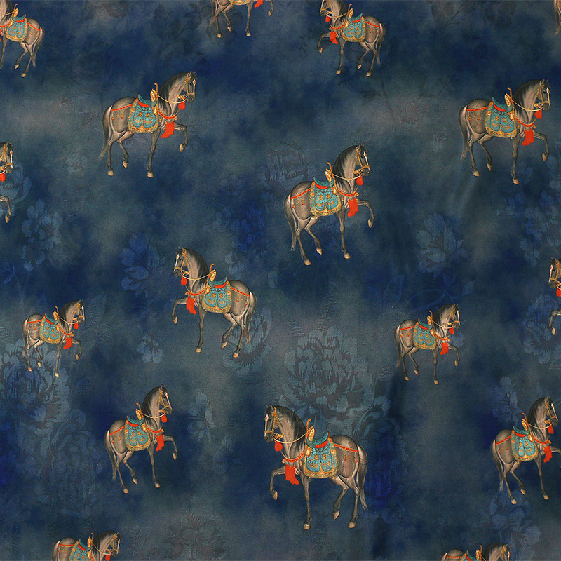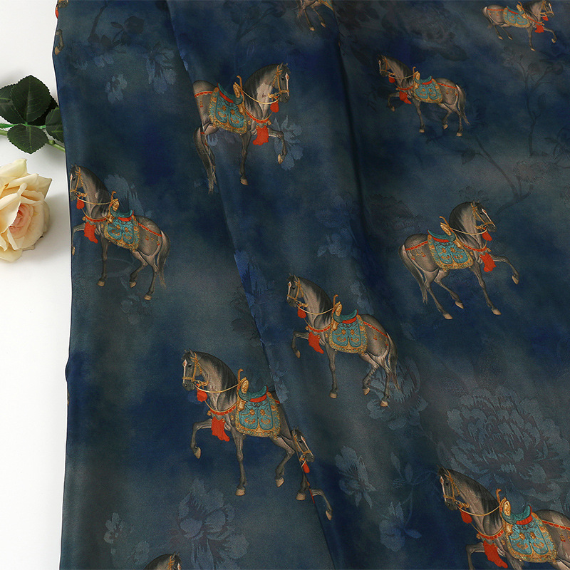 墨蓝骏马全人丝香云纱印花面料 国风旗袍连衣裙服装 仿缎面花布