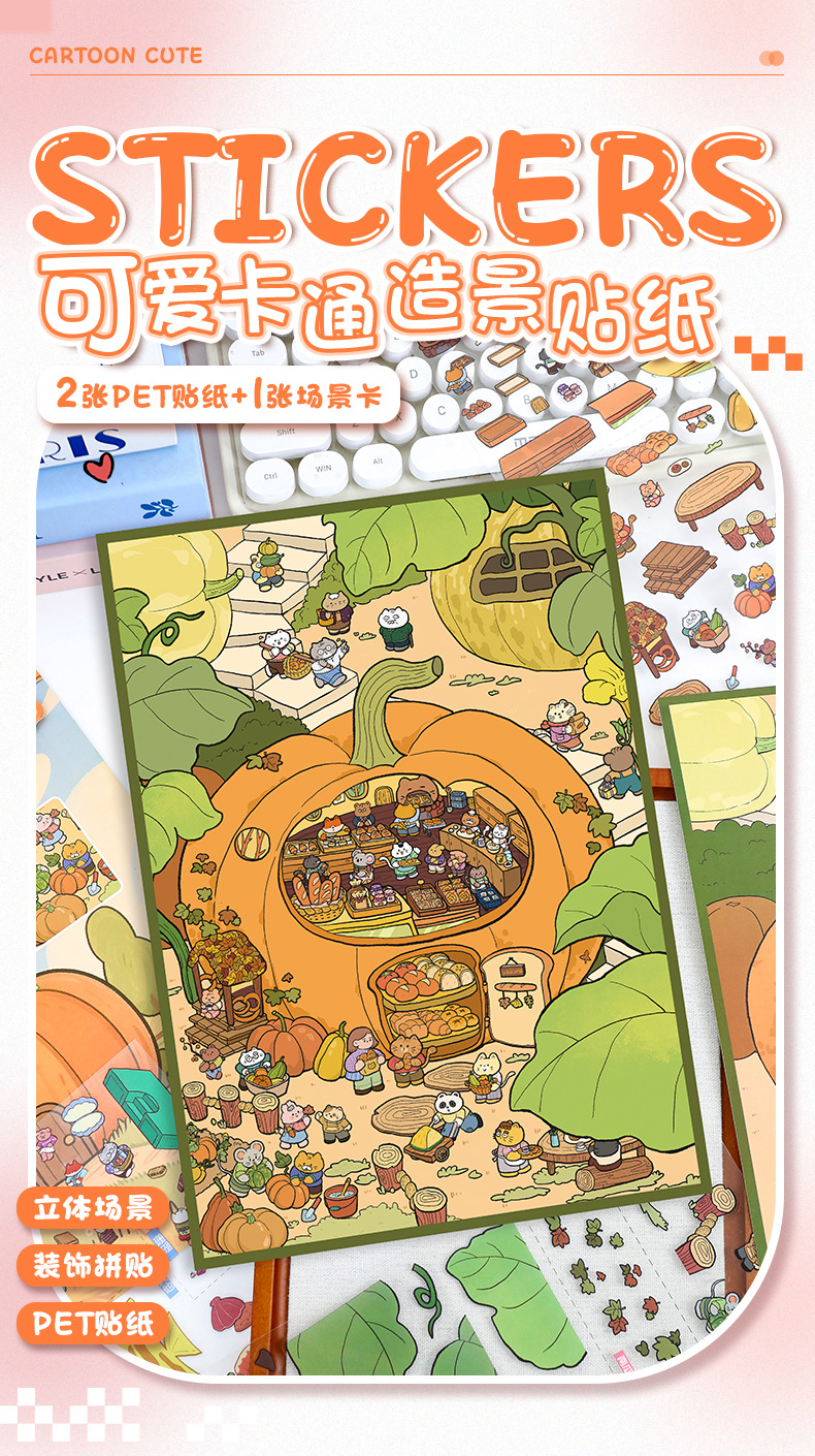 56.0艺蓝造景贴纸可爱场景拼贴大号3D立体场微缩场景贴纸手帐贴画