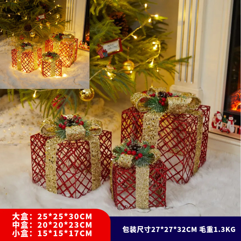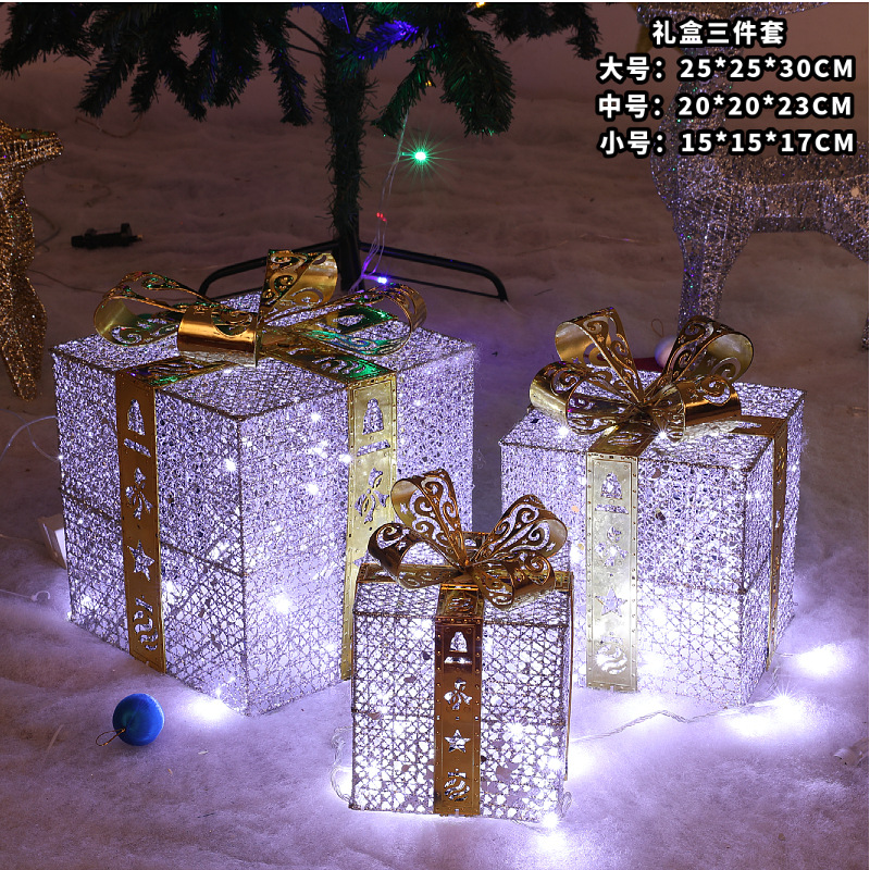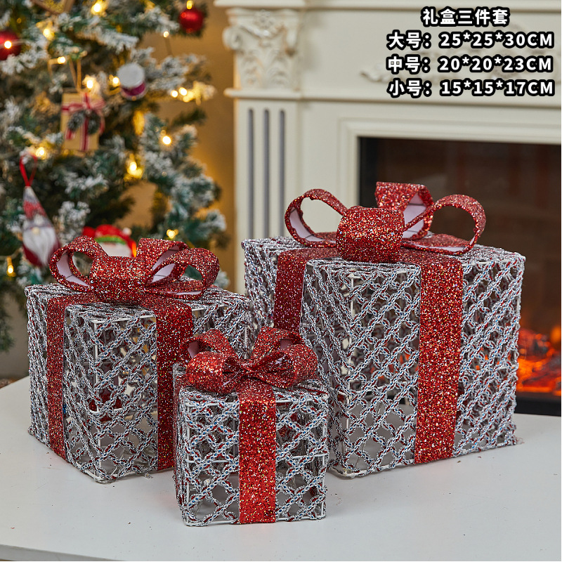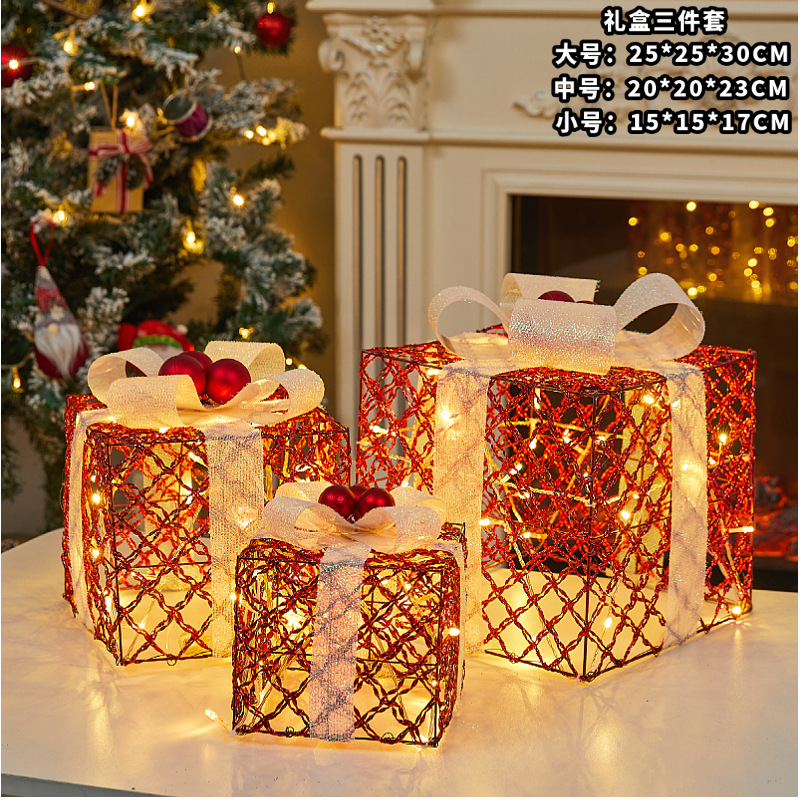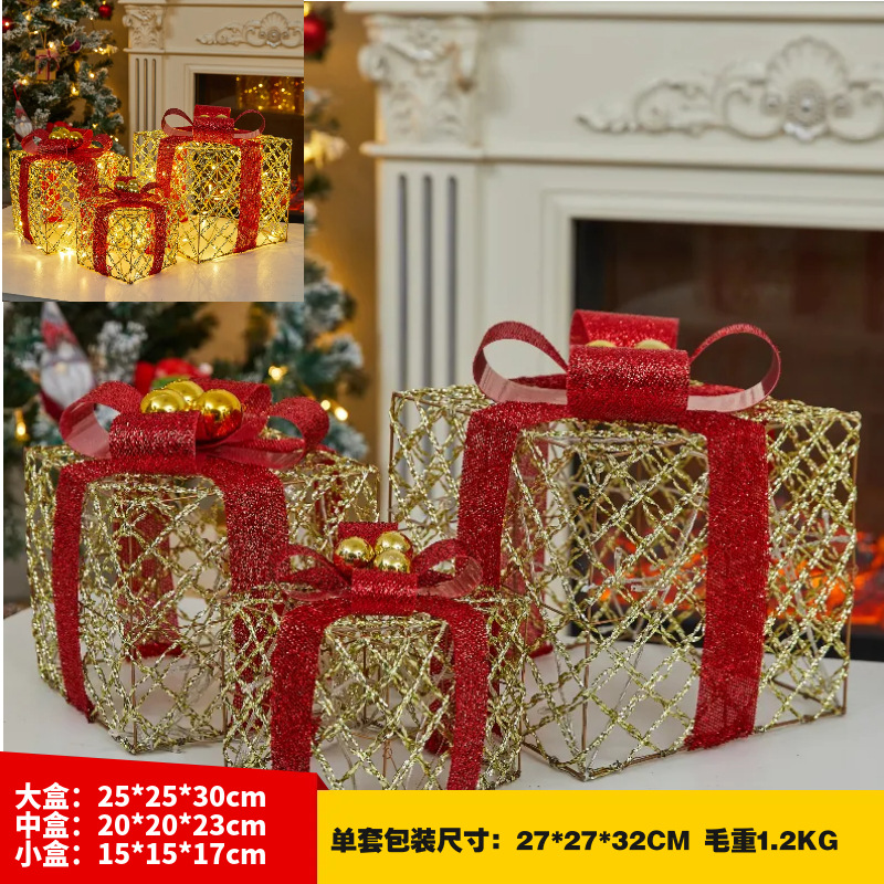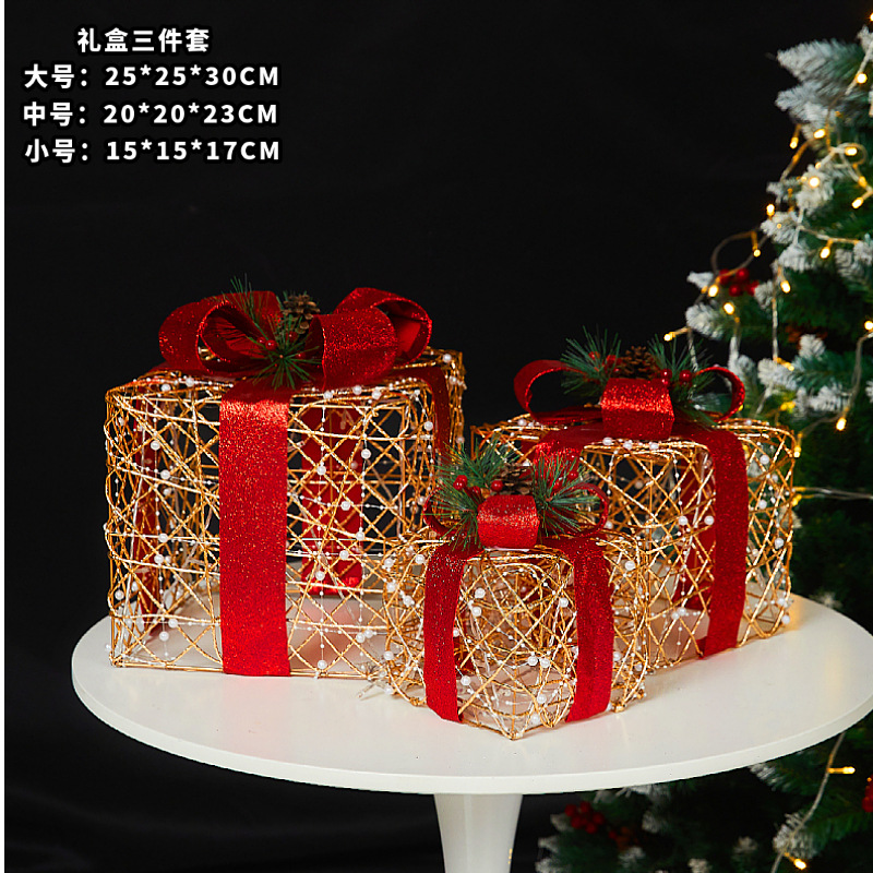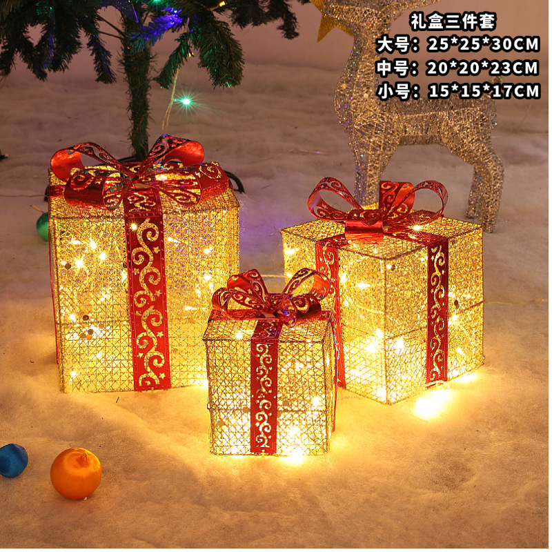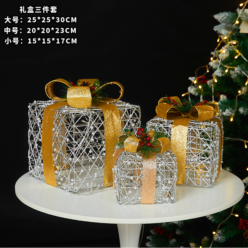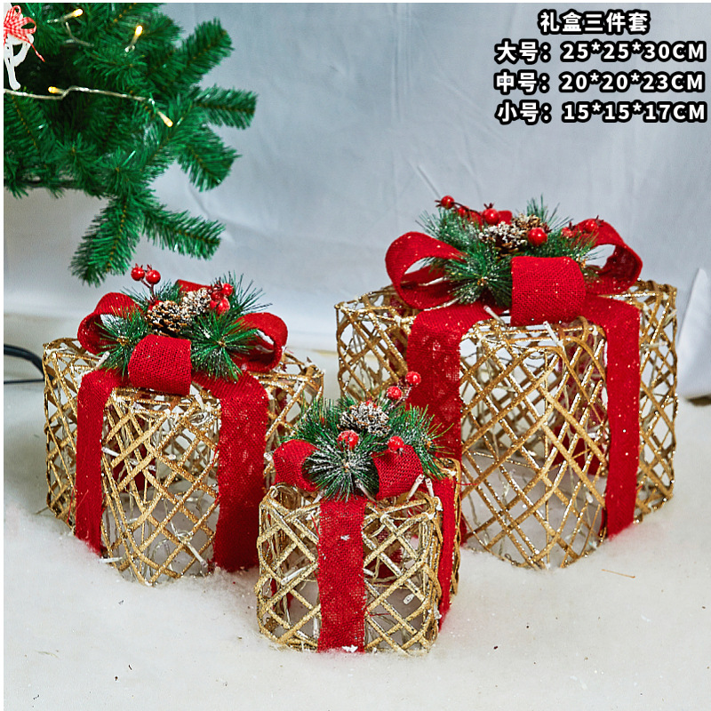 圣诞节装饰礼品盒三件套堆头摆件铁艺礼物盒发光圣诞用品场景布置