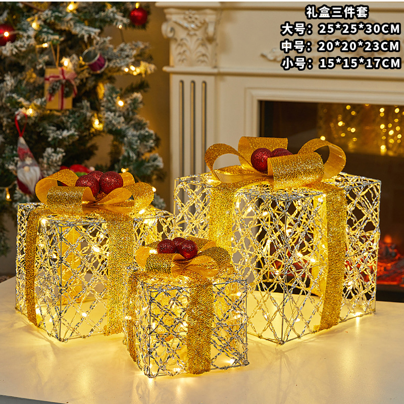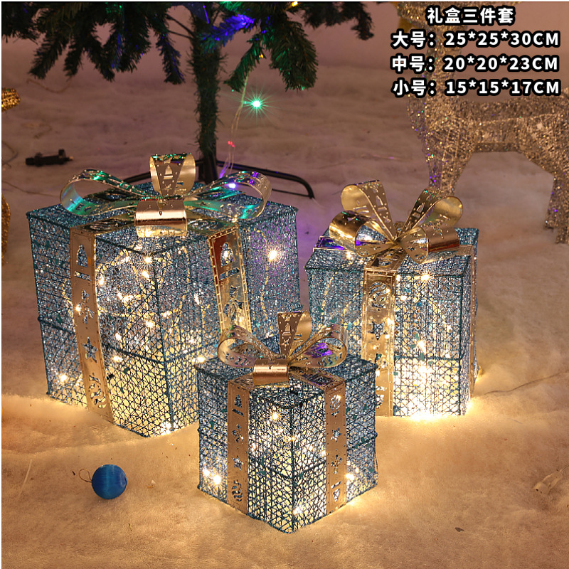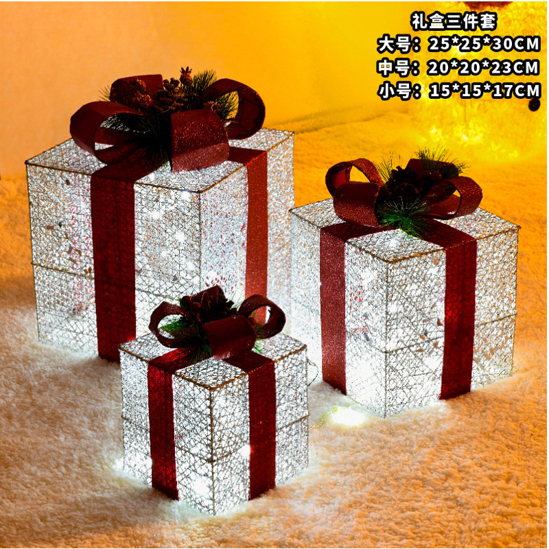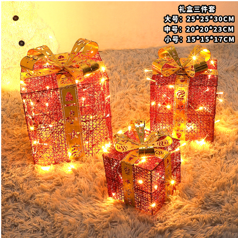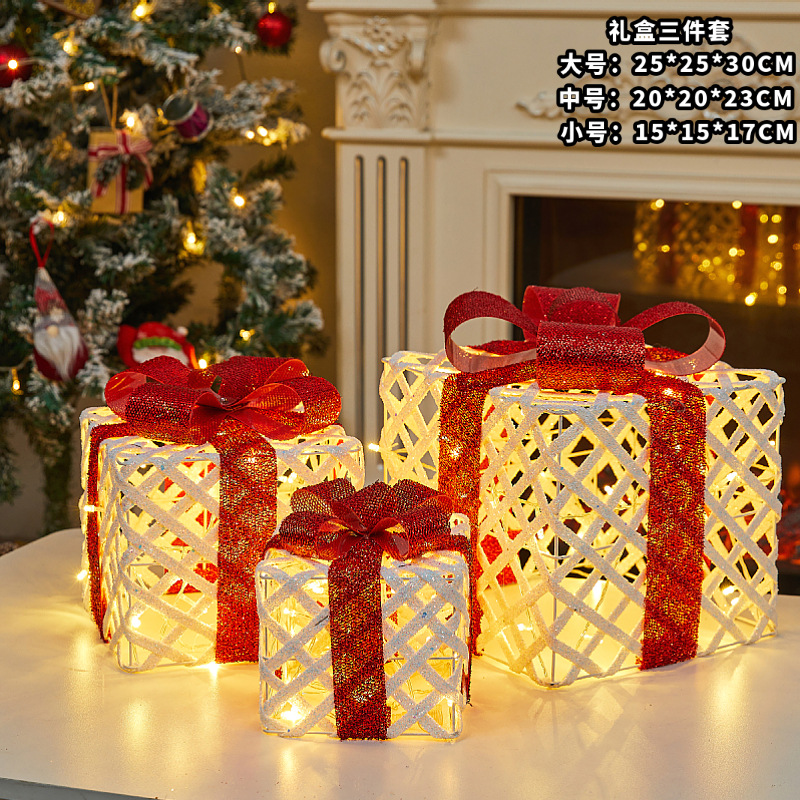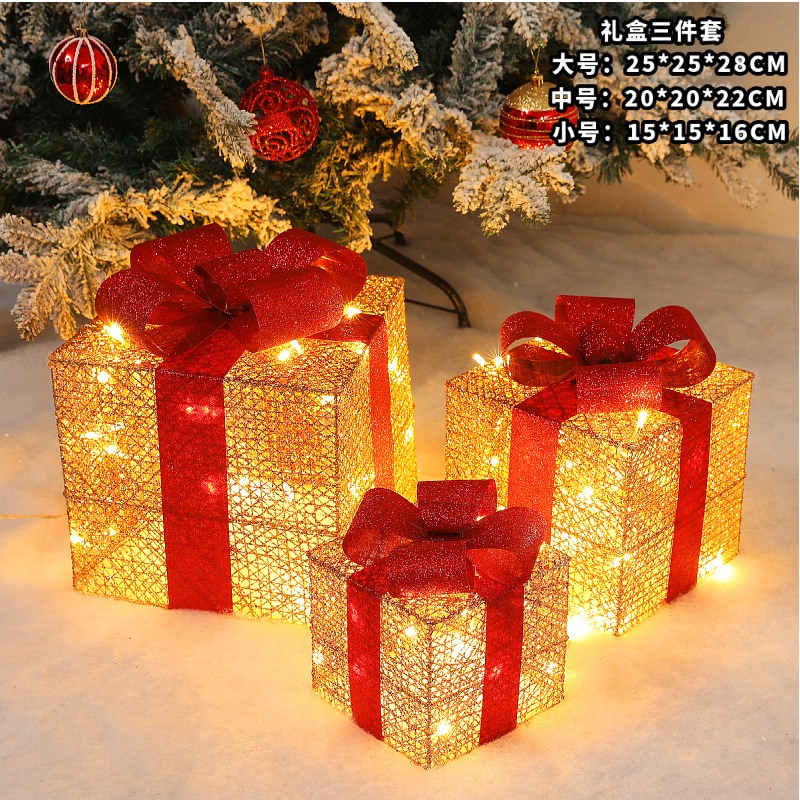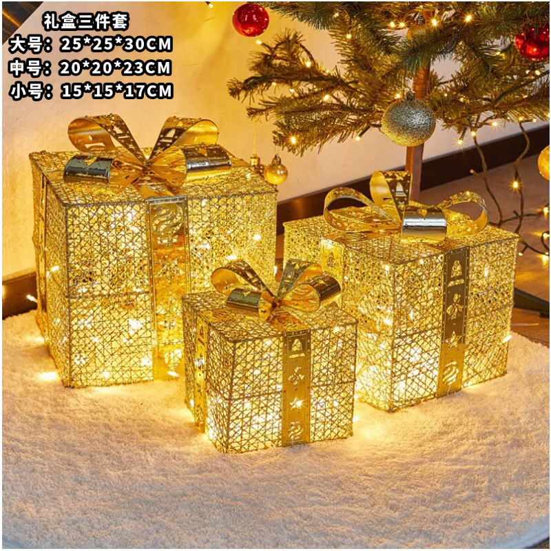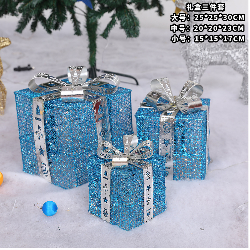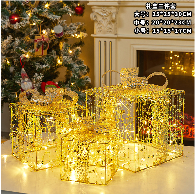 圣诞节装饰礼品盒三件套堆头摆件铁艺礼物盒发光圣诞用品场景布置