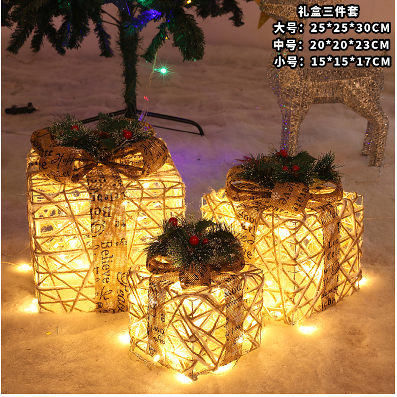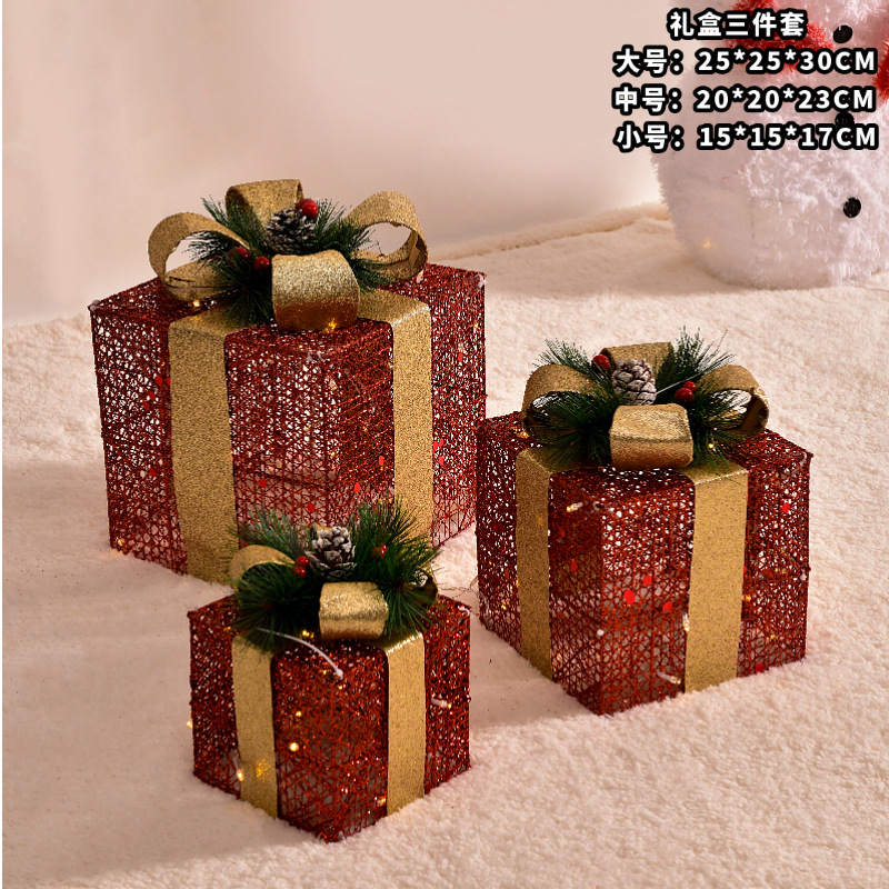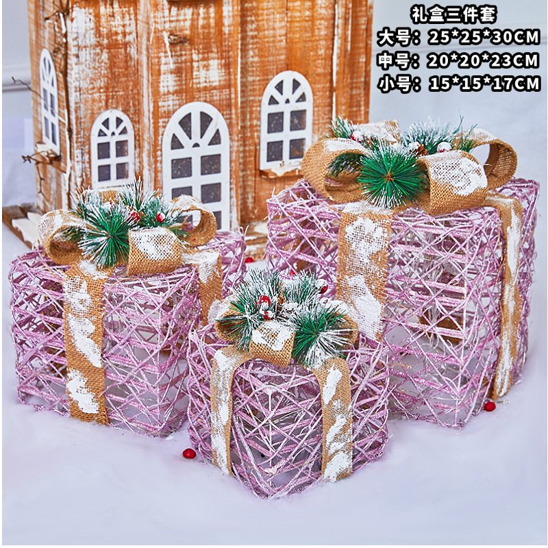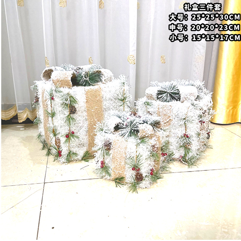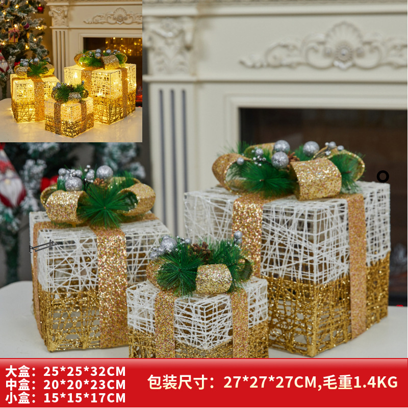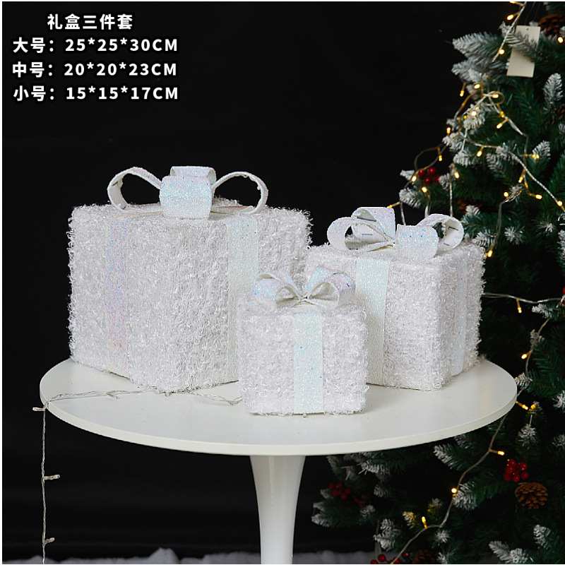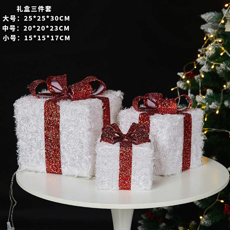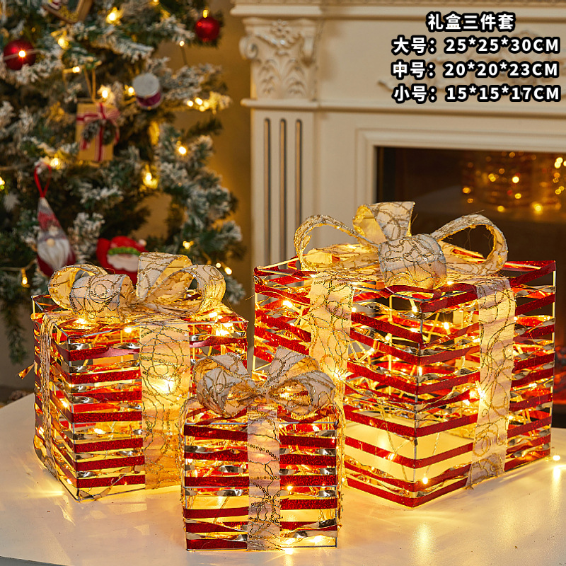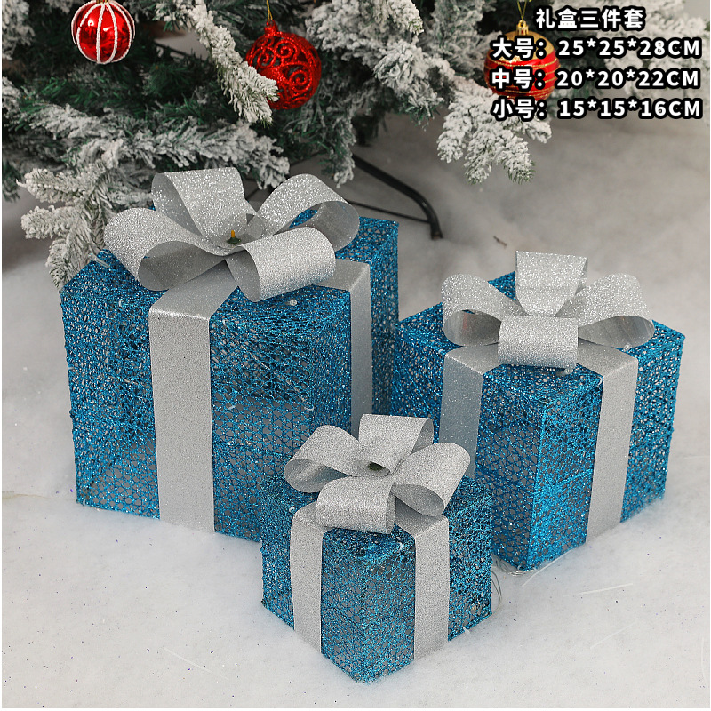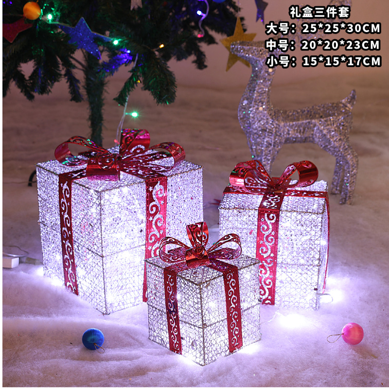 圣诞节装饰礼品盒三件套堆头摆件铁艺礼物盒发光圣诞用品场景布置