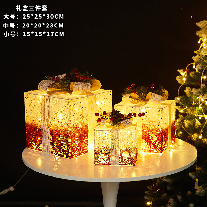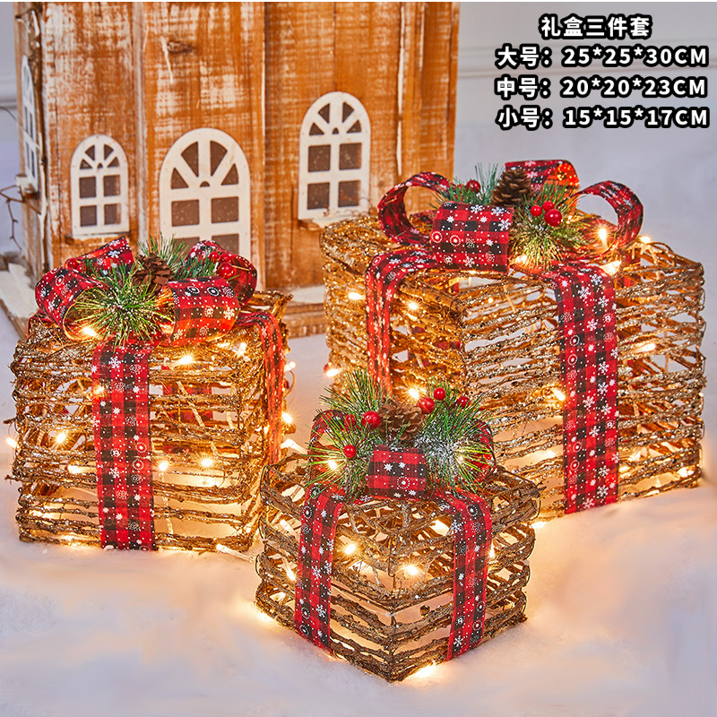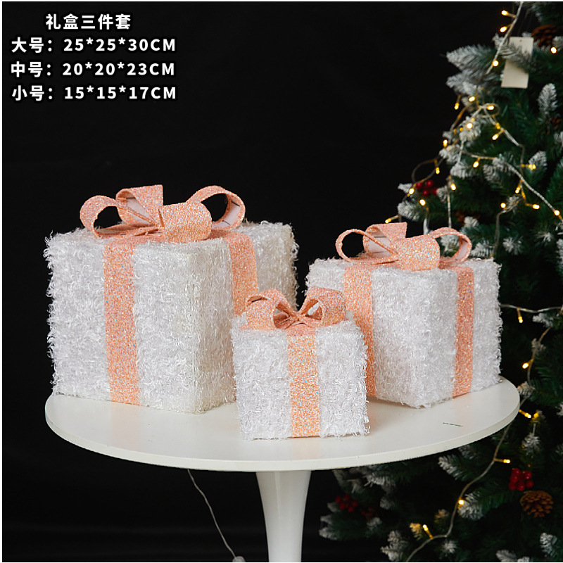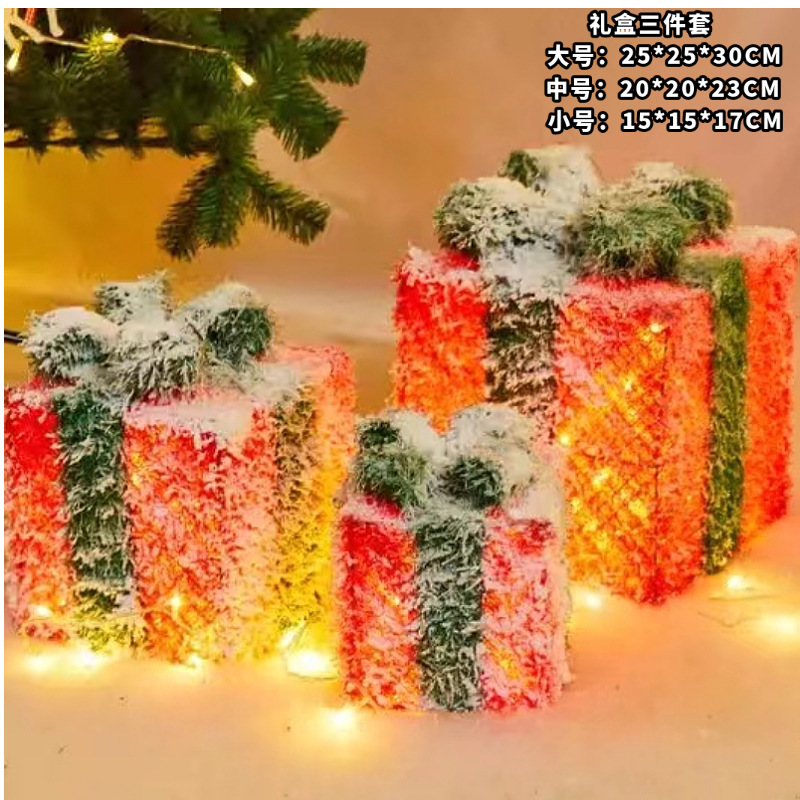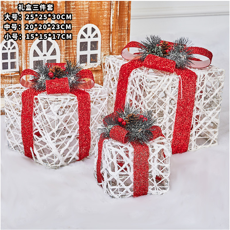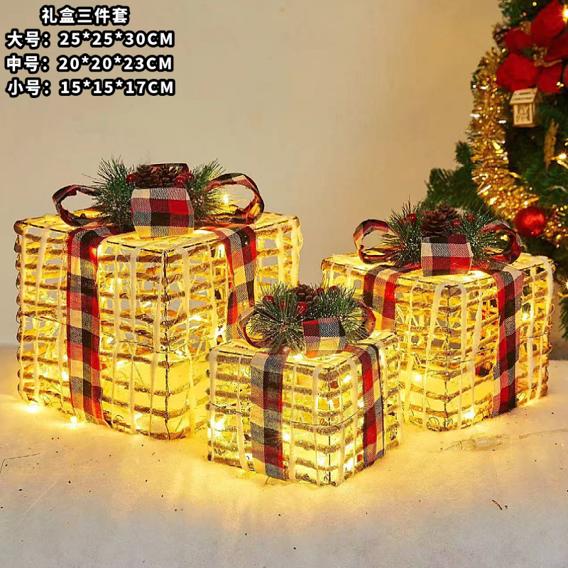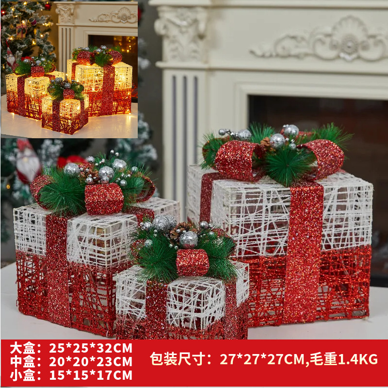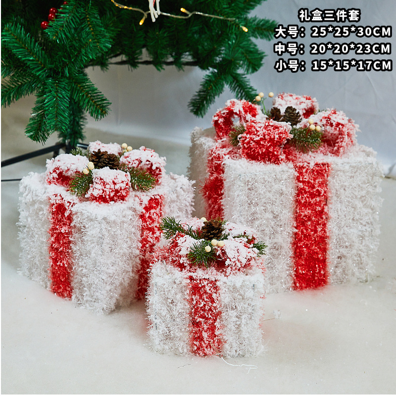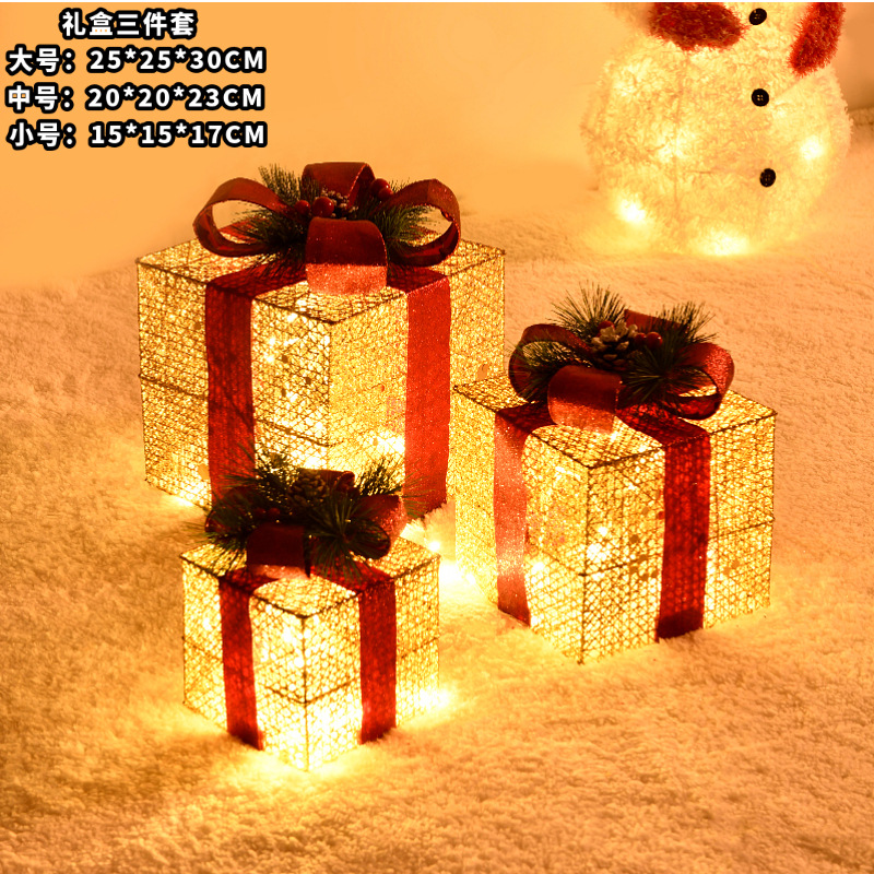 圣诞节装饰礼品盒三件套堆头摆件铁艺礼物盒发光圣诞用品场景布置