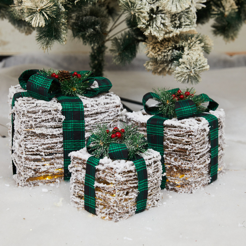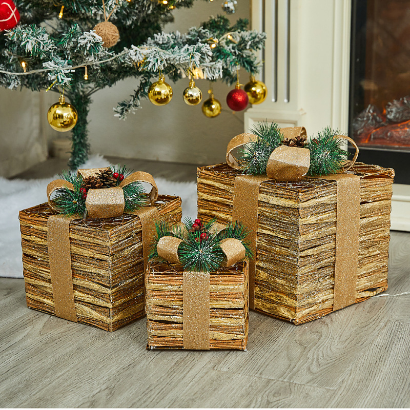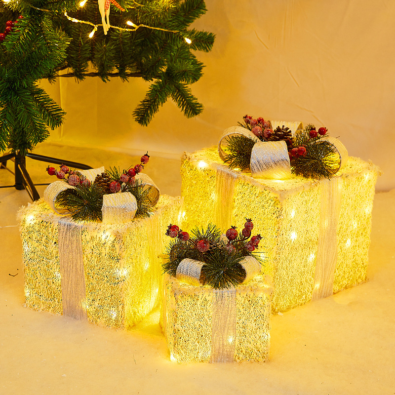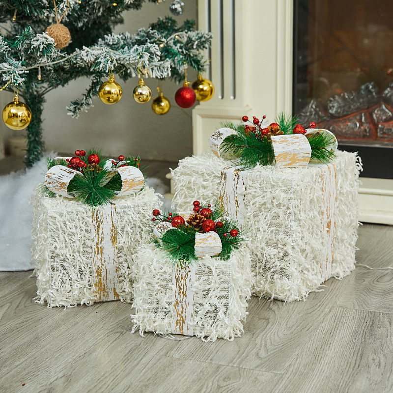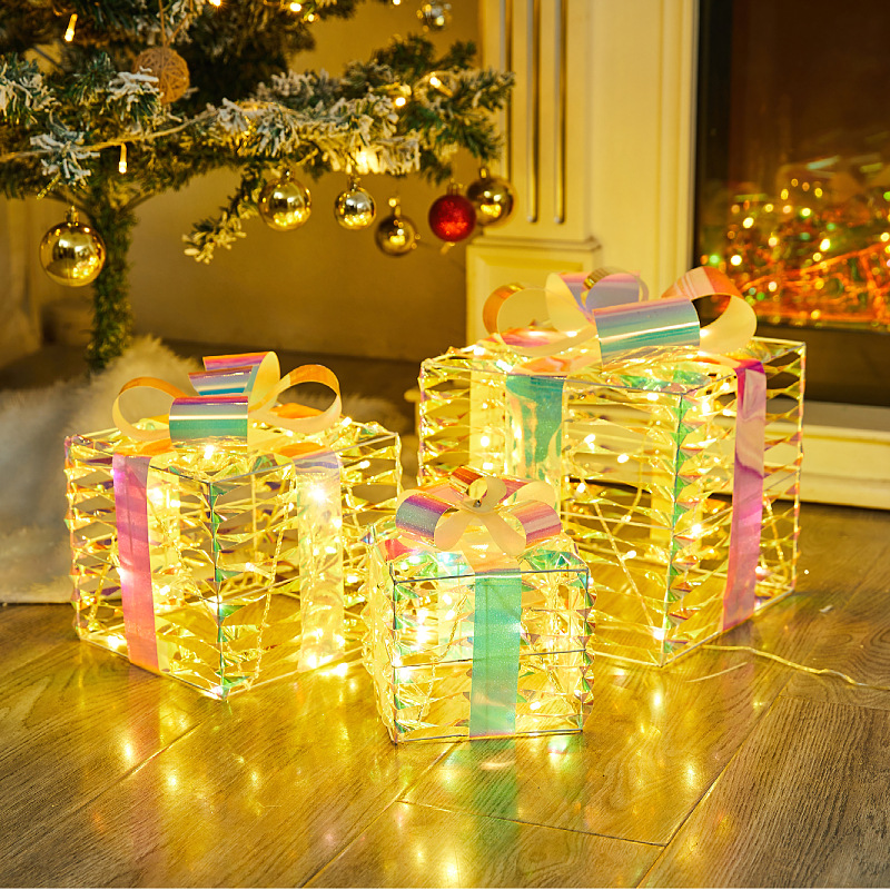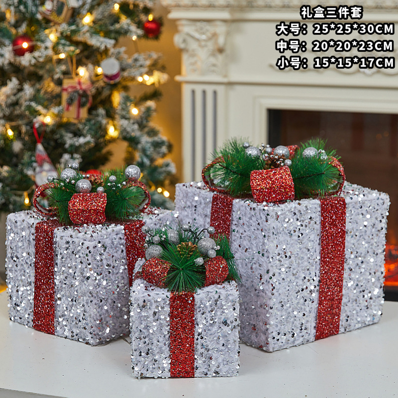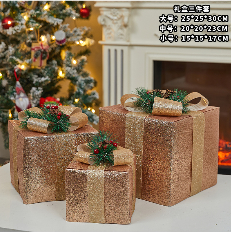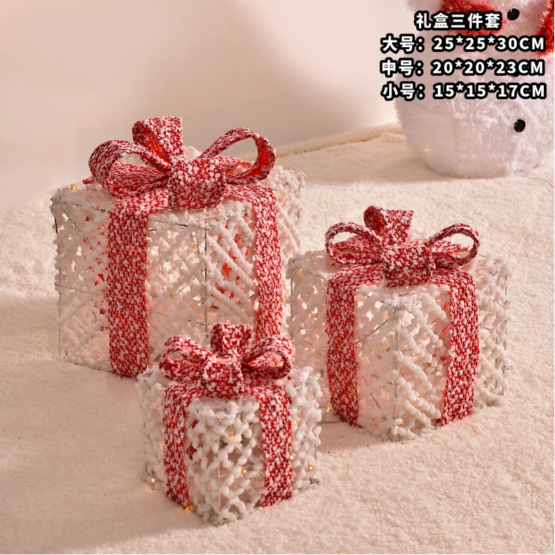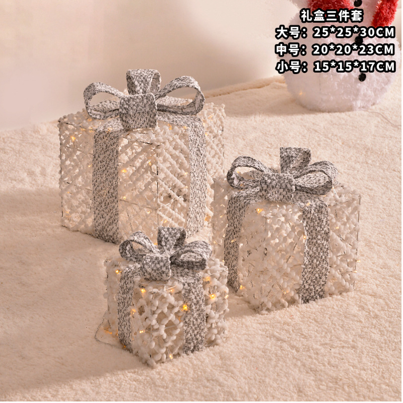 圣诞节装饰礼品盒三件套堆头摆件铁艺礼物盒发光圣诞用品场景布置