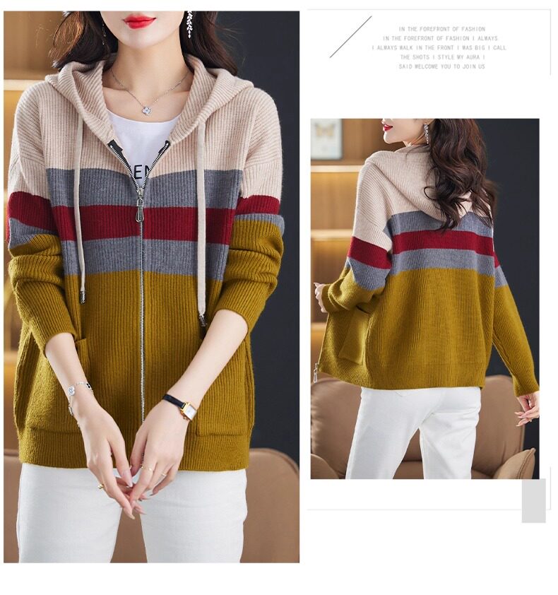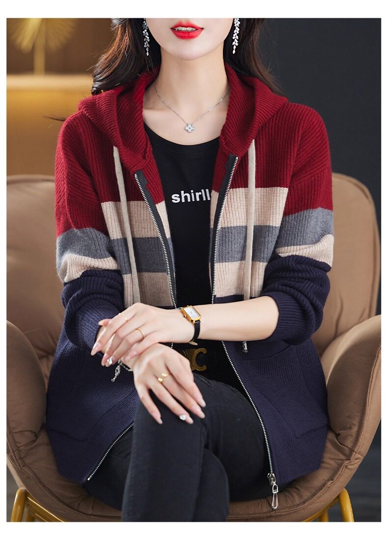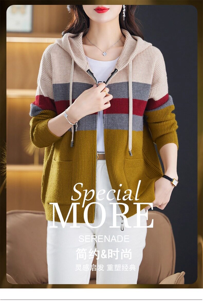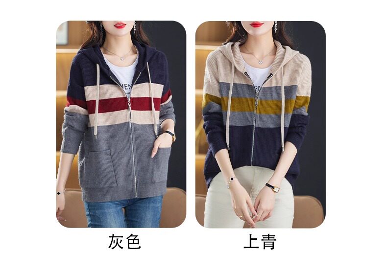 2025春秋季款拼色条纹双拉链连帽针织开衫女宽松显瘦毛衣上衣外套