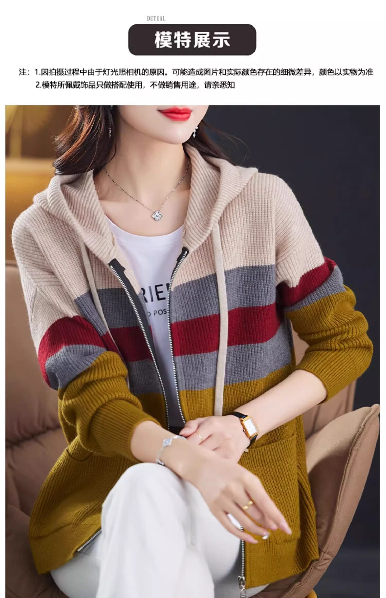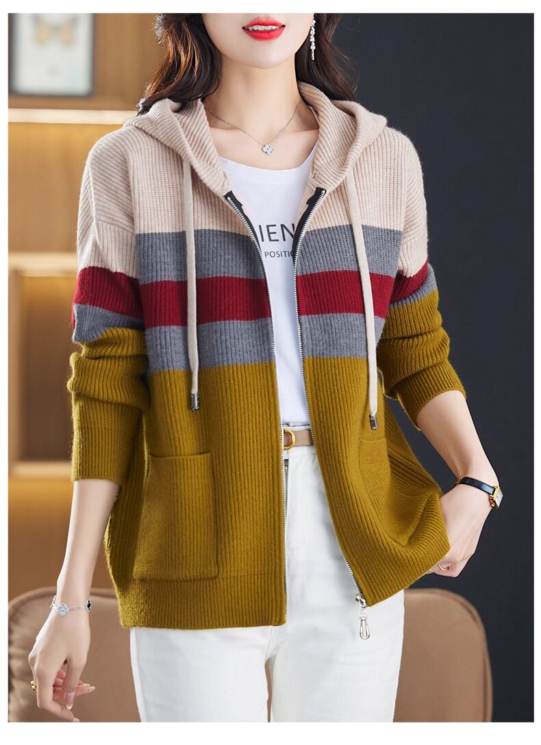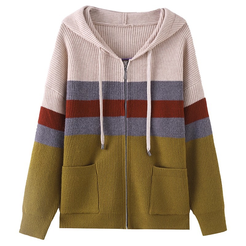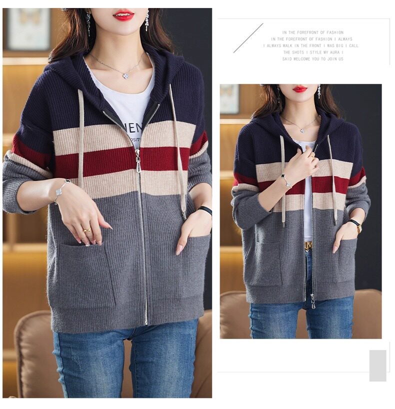 2025春秋季款拼色条纹双拉链连帽针织开衫女宽松显瘦毛衣上衣外套