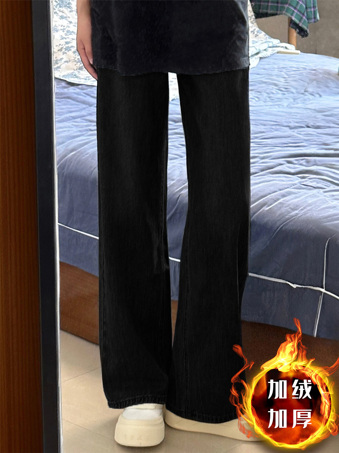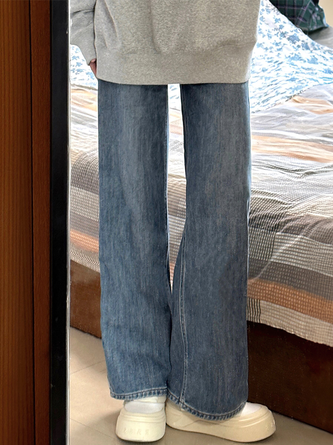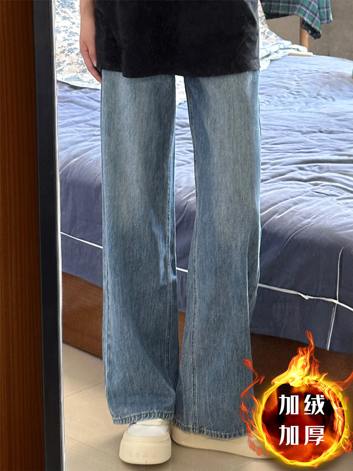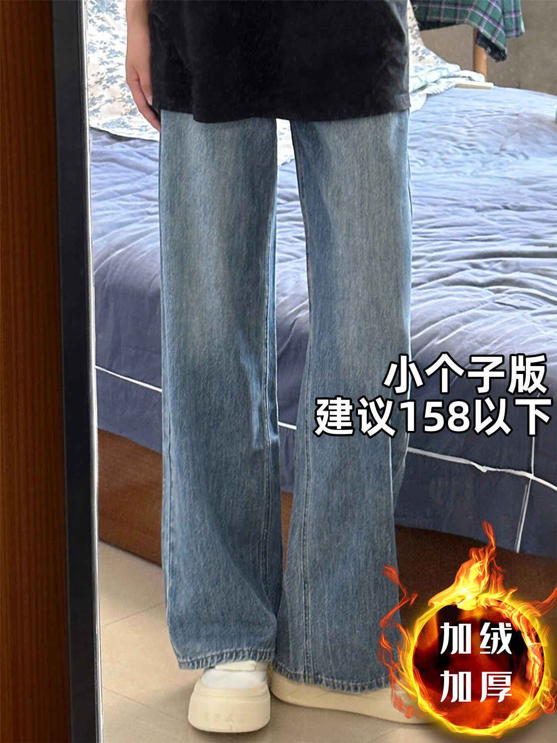 复古蓝直筒牛仔裤女秋冬加绒胖妹妹mm高腰宽松显瘦梨型身材阔腿裤