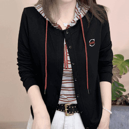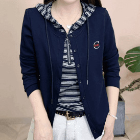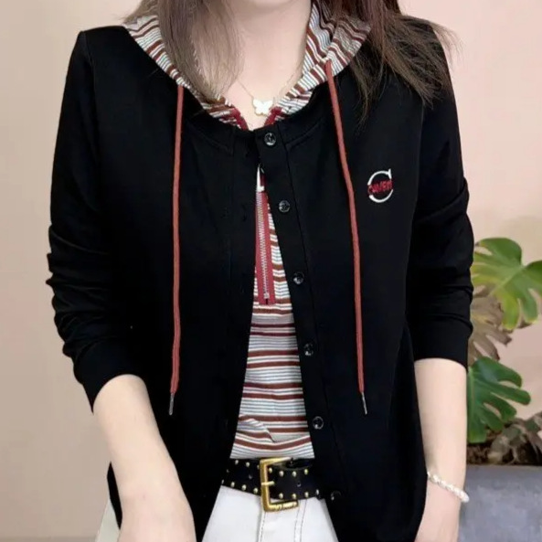 秋季新款条纹拼接假两件连帽长袖卫衣2025洋气妈妈装显瘦减龄上衣