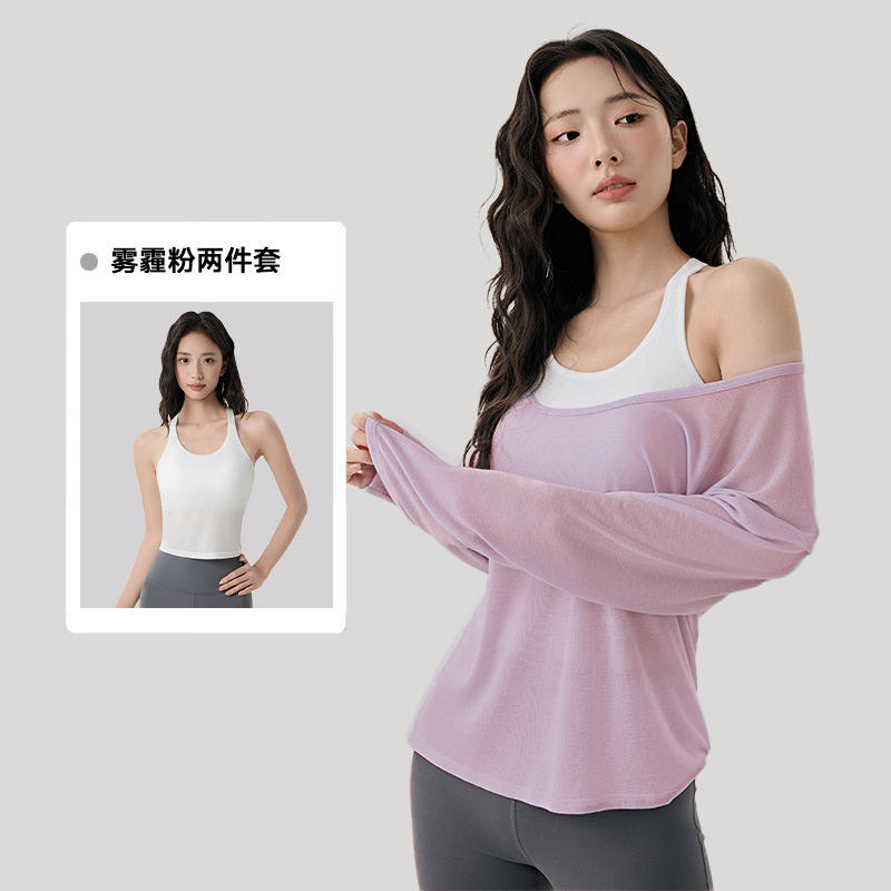 瑜伽服女套装高级感叠穿两件套透气长袖罩衫普拉提带胸垫运动背心