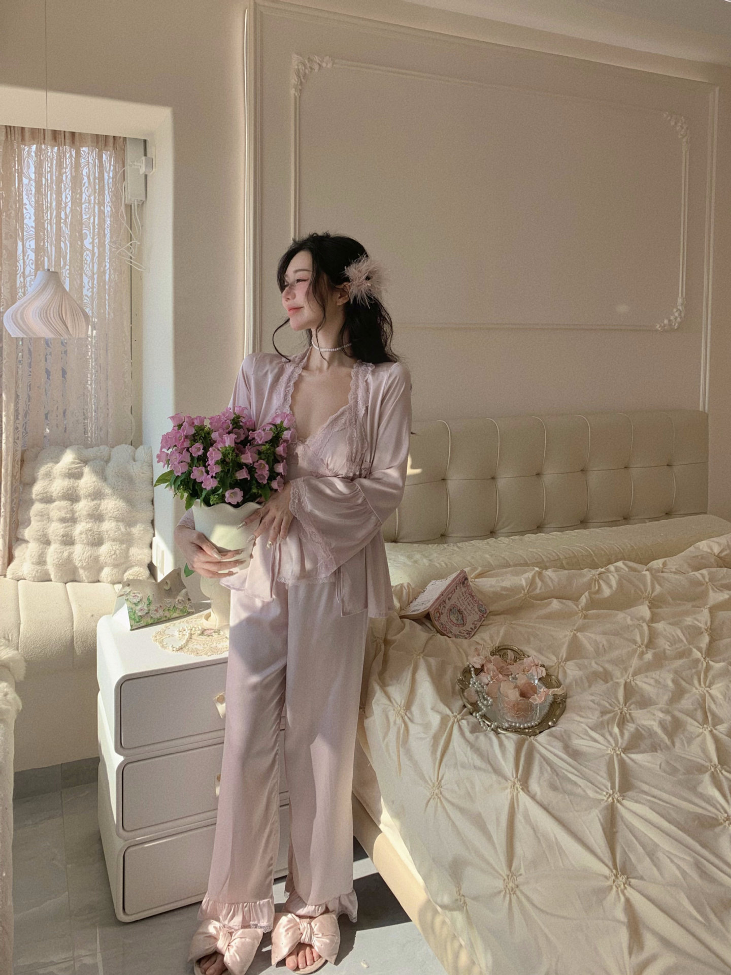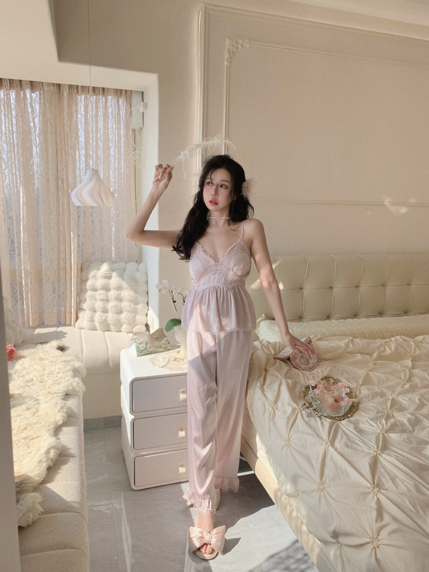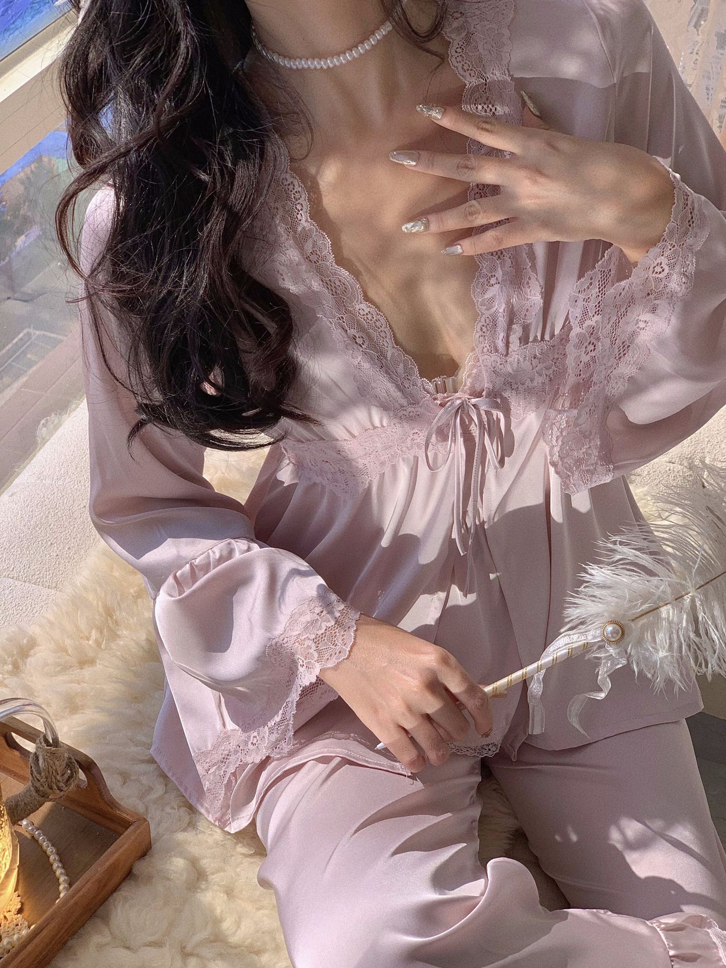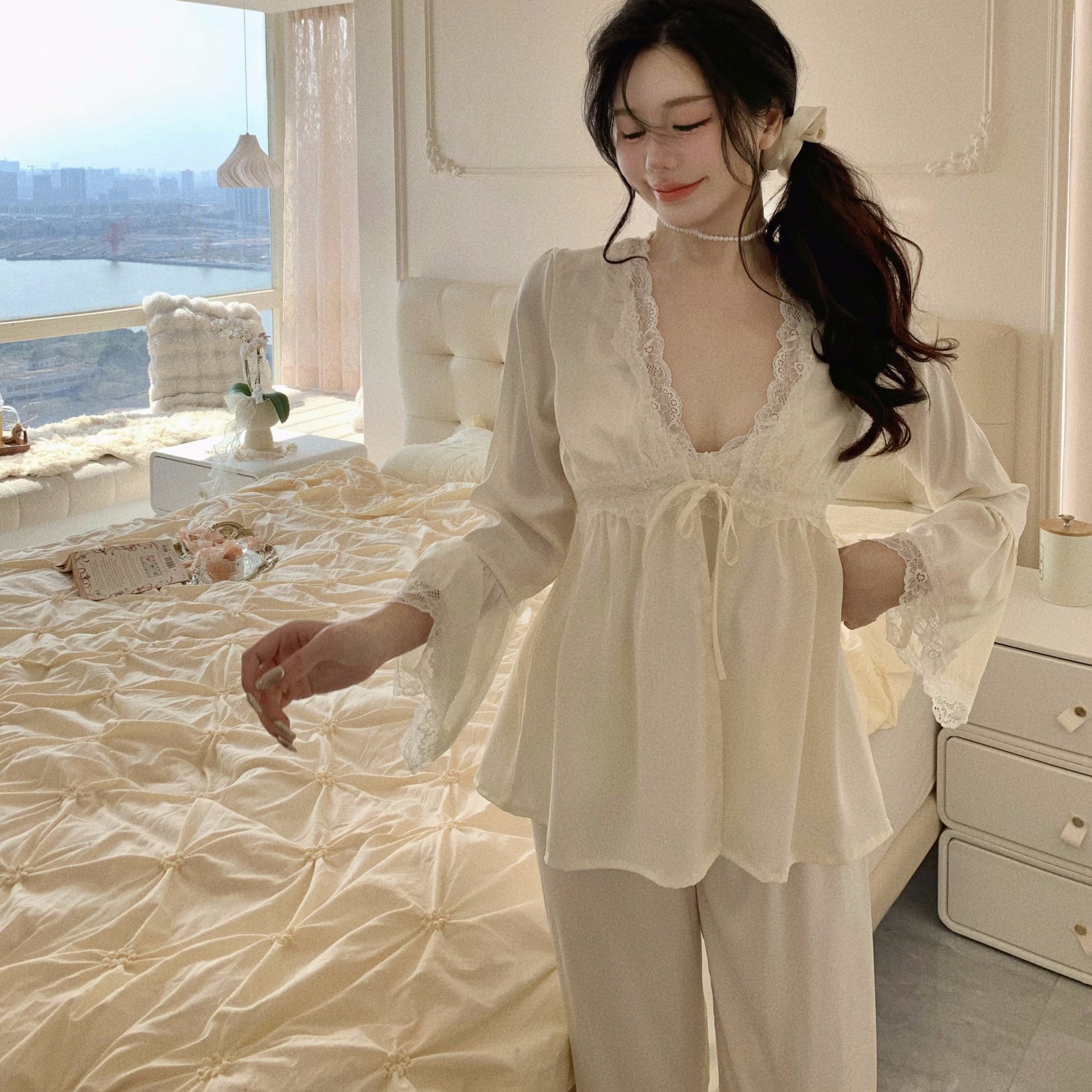 【心动信号】秋吊带性感睡衣赵露思同款家居服法式蕾丝三件套长袖