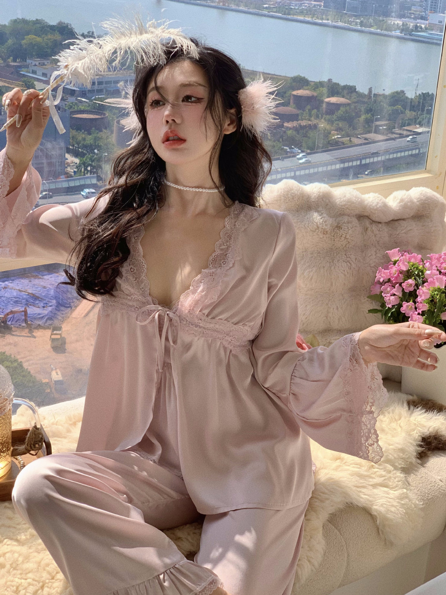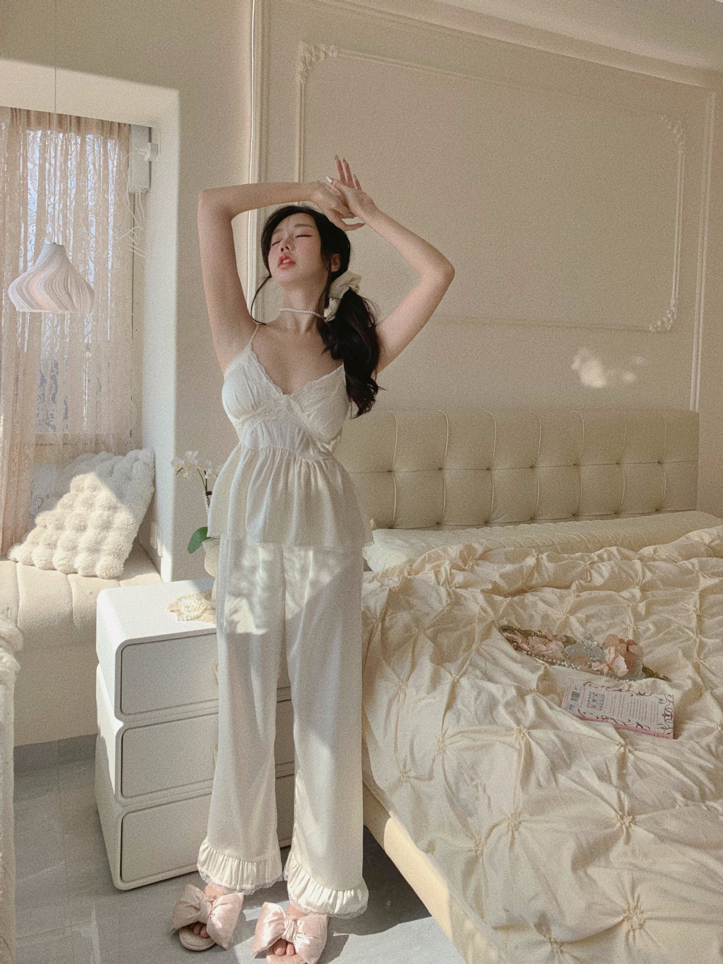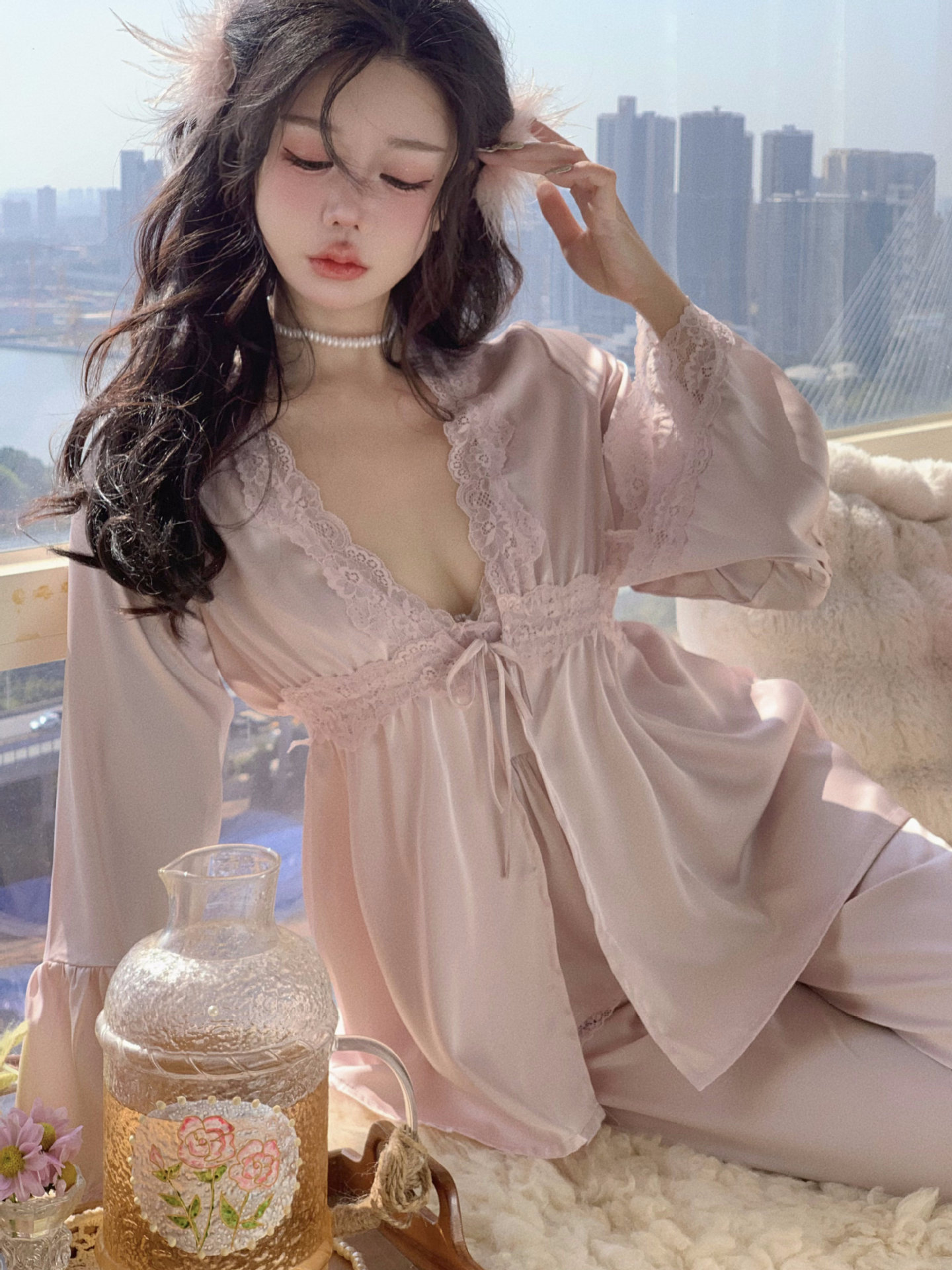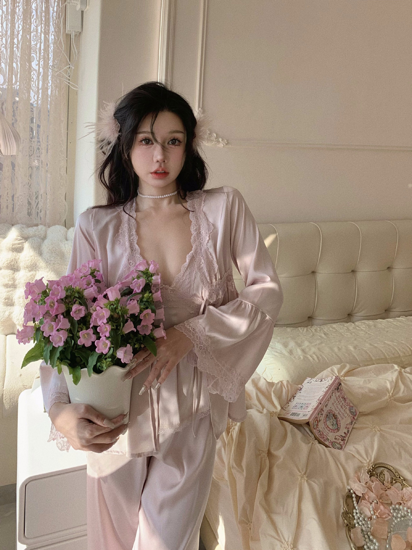 【心动信号】秋吊带性感睡衣赵露思同款家居服法式蕾丝三件套长袖