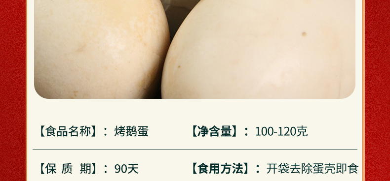 | baked goose egg 15 pieces(烤鹅蛋15枚) | USD $5.76 | 88716 piece available |