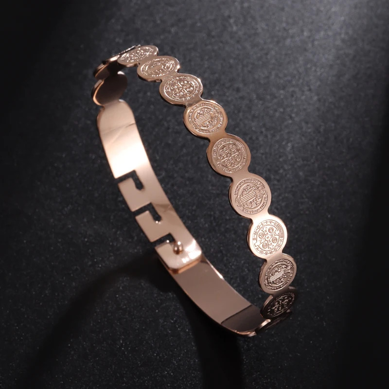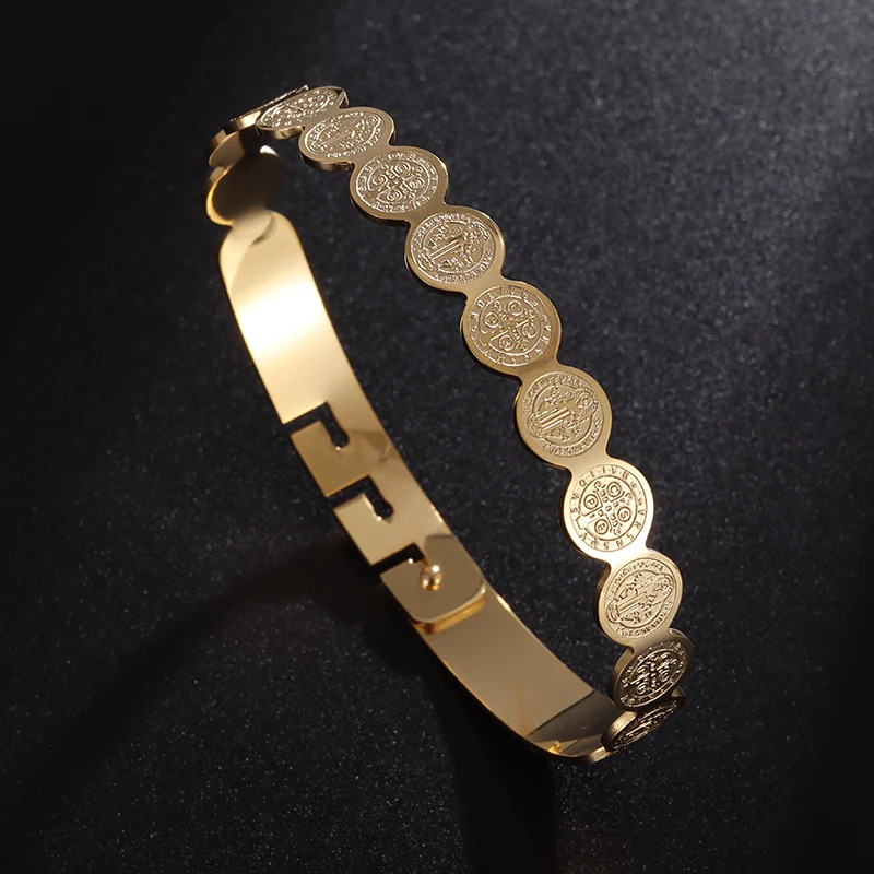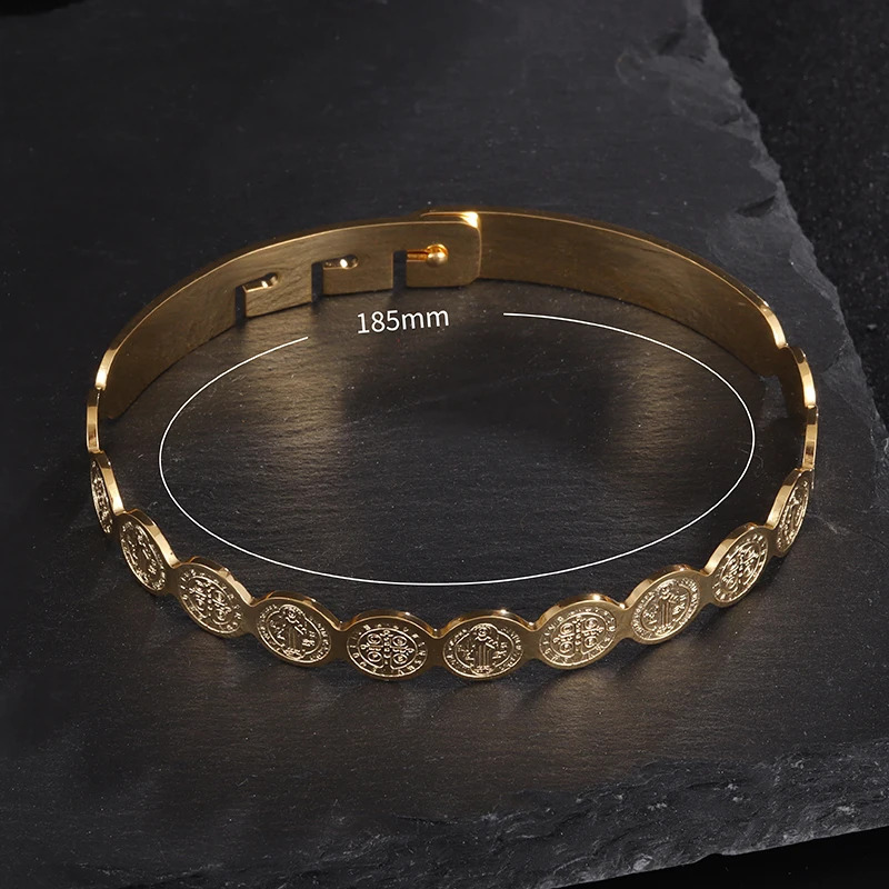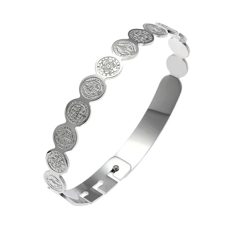 精致不锈钢十字勋章袖口手链潮流圣本笃手镯男式回形卡扣珠宝礼物