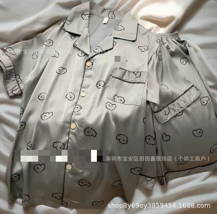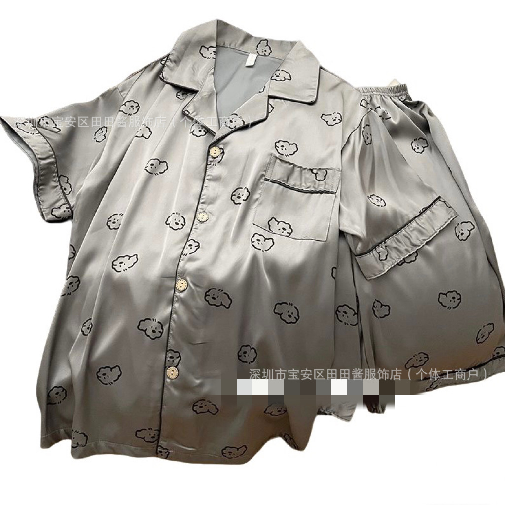 新款翻领卡通印花网红休闲短袖短裤简约开衫宽松套装男士家居服