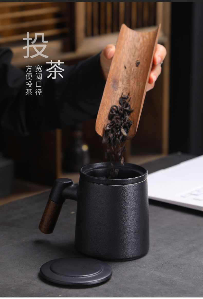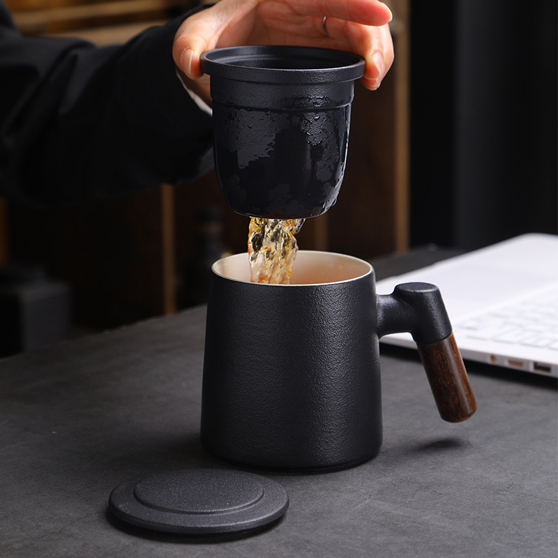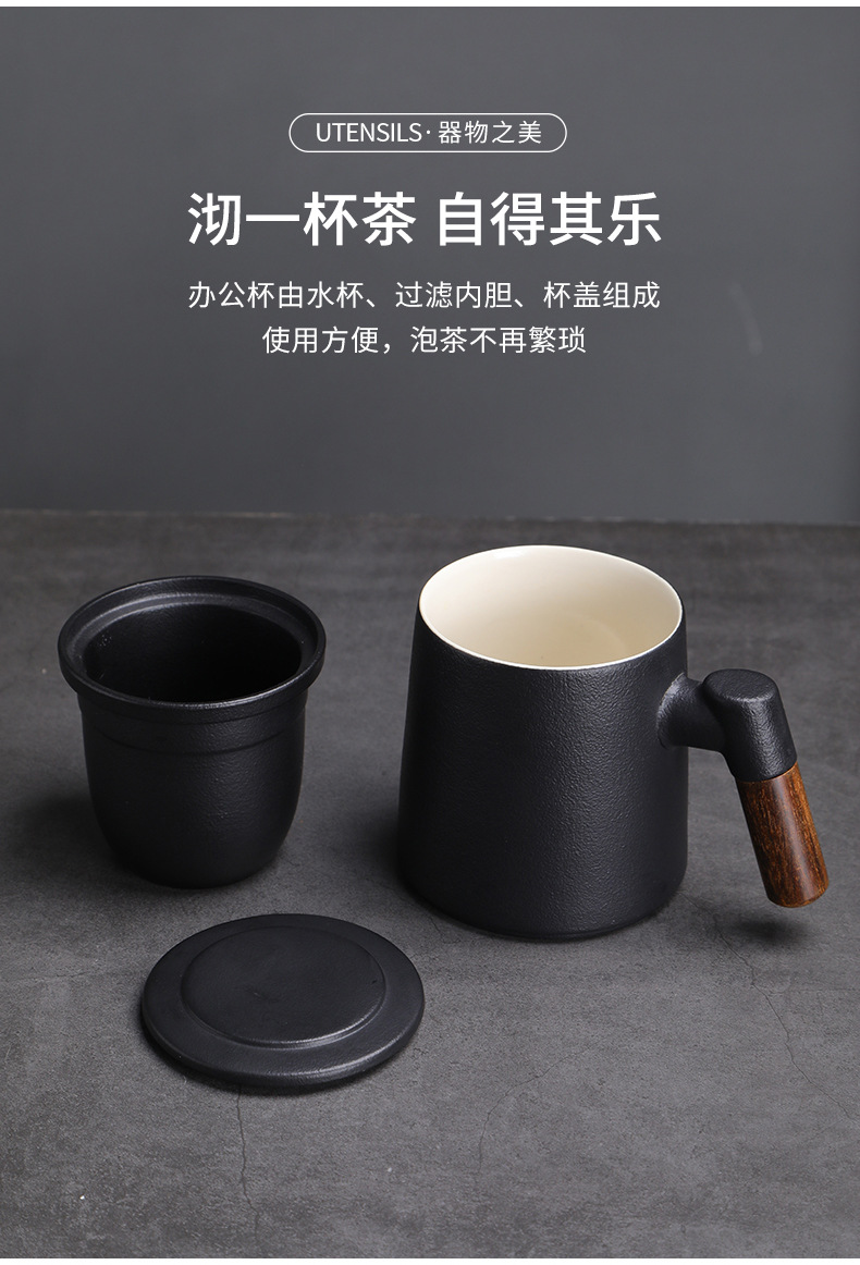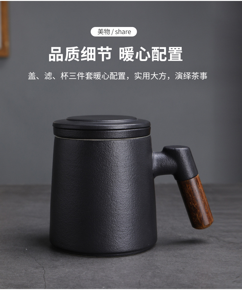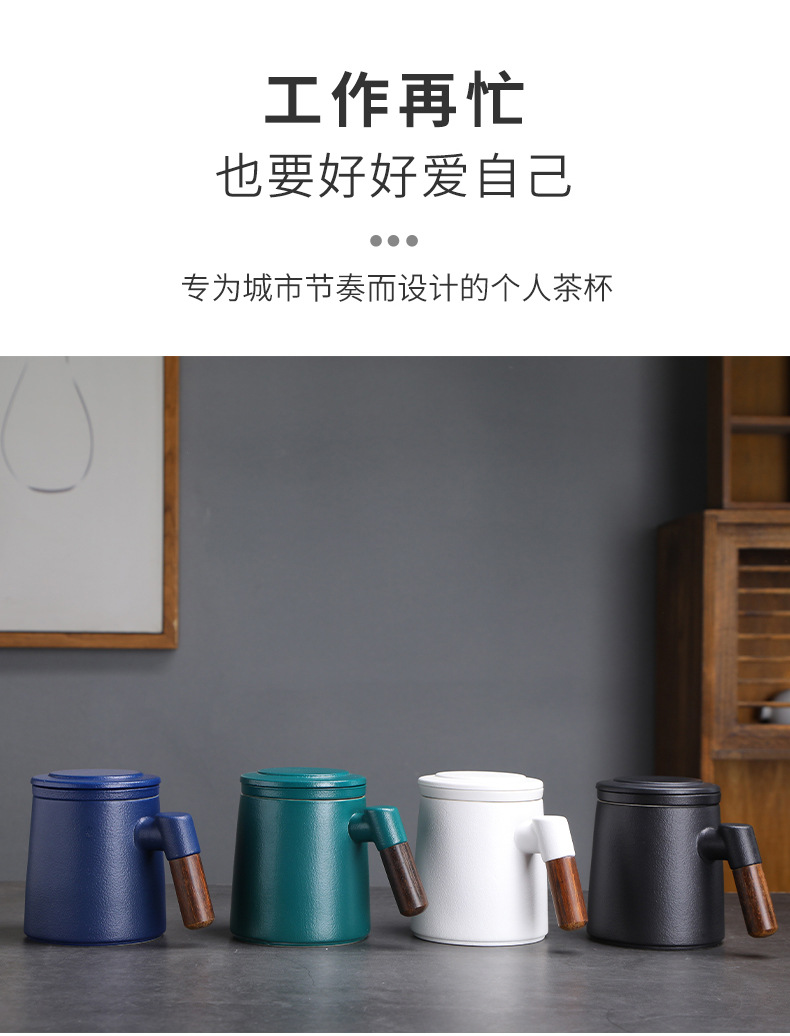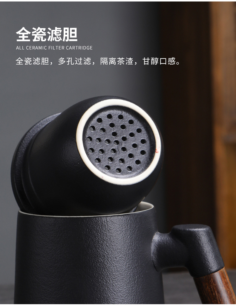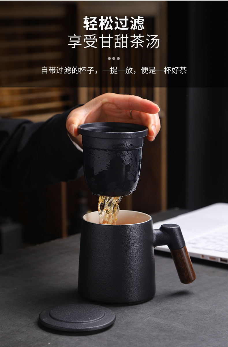 陶瓷茶水分离茶杯马克杯带盖过滤木柄水杯办公杯商务伴手礼印logo