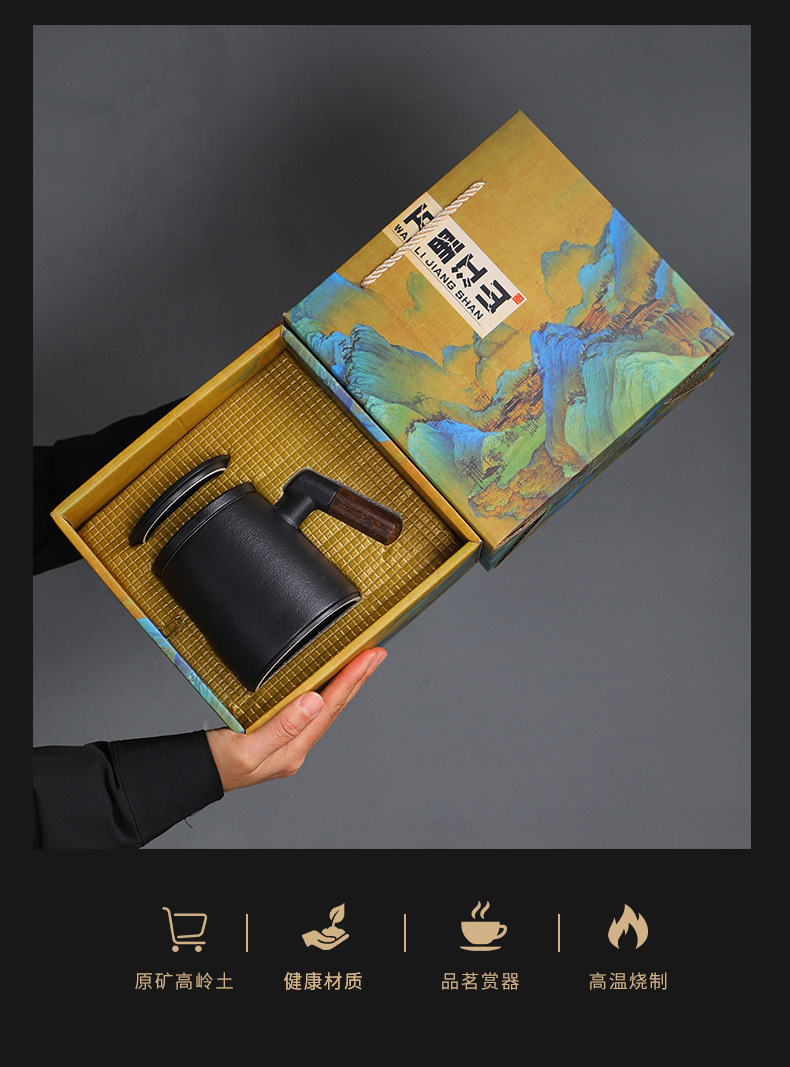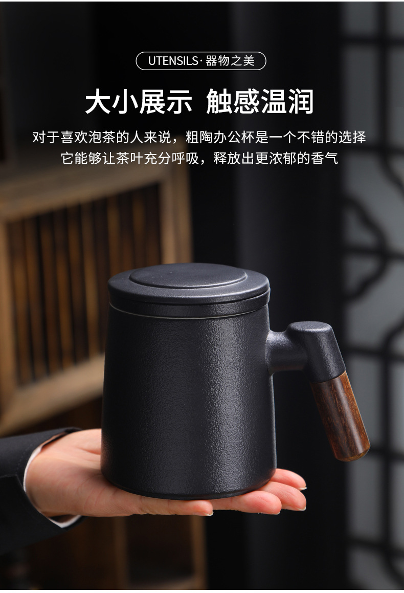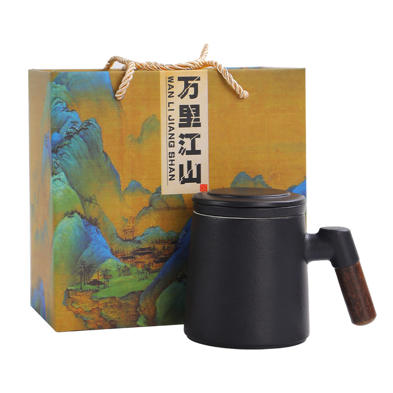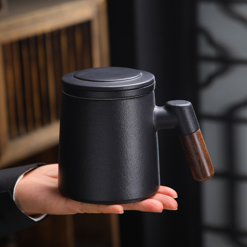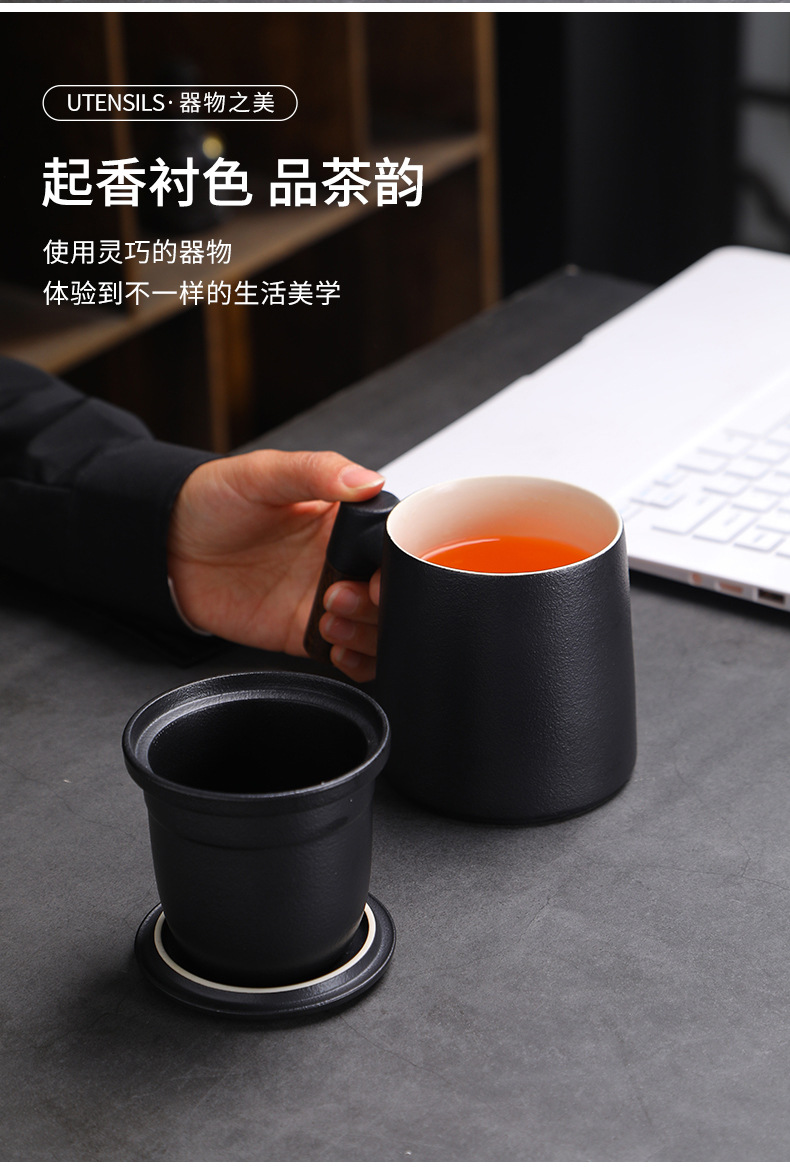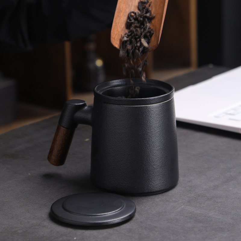 陶瓷茶水分离茶杯马克杯带盖过滤木柄水杯办公杯商务伴手礼印logo