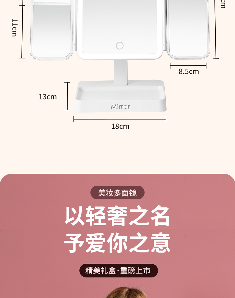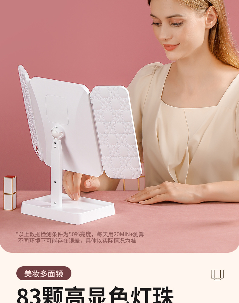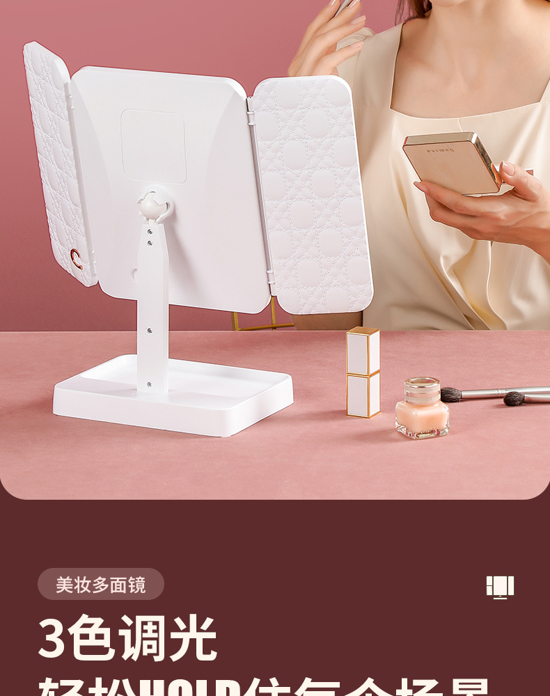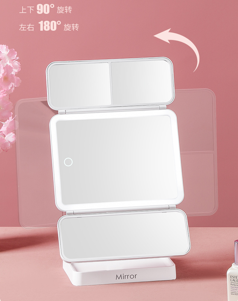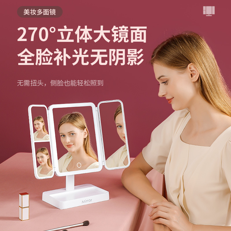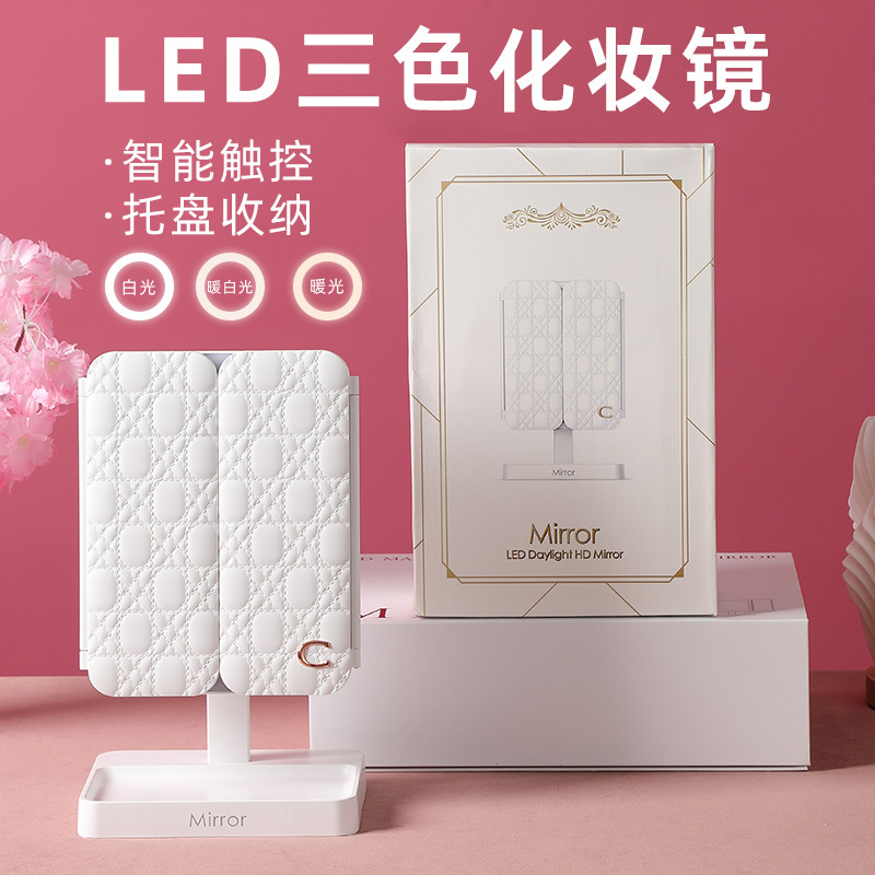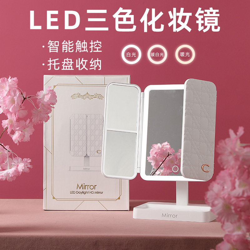 台式led化妆镜收纳盒二合一体贝壳三面折叠梳妆镜可调节镜子跨境