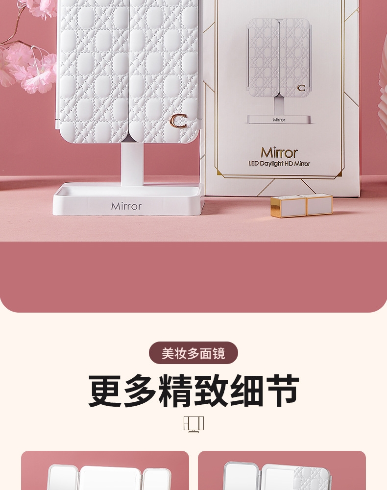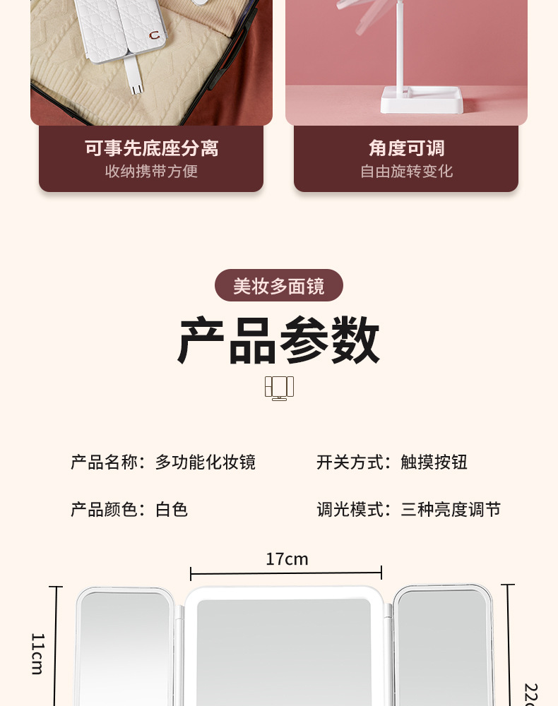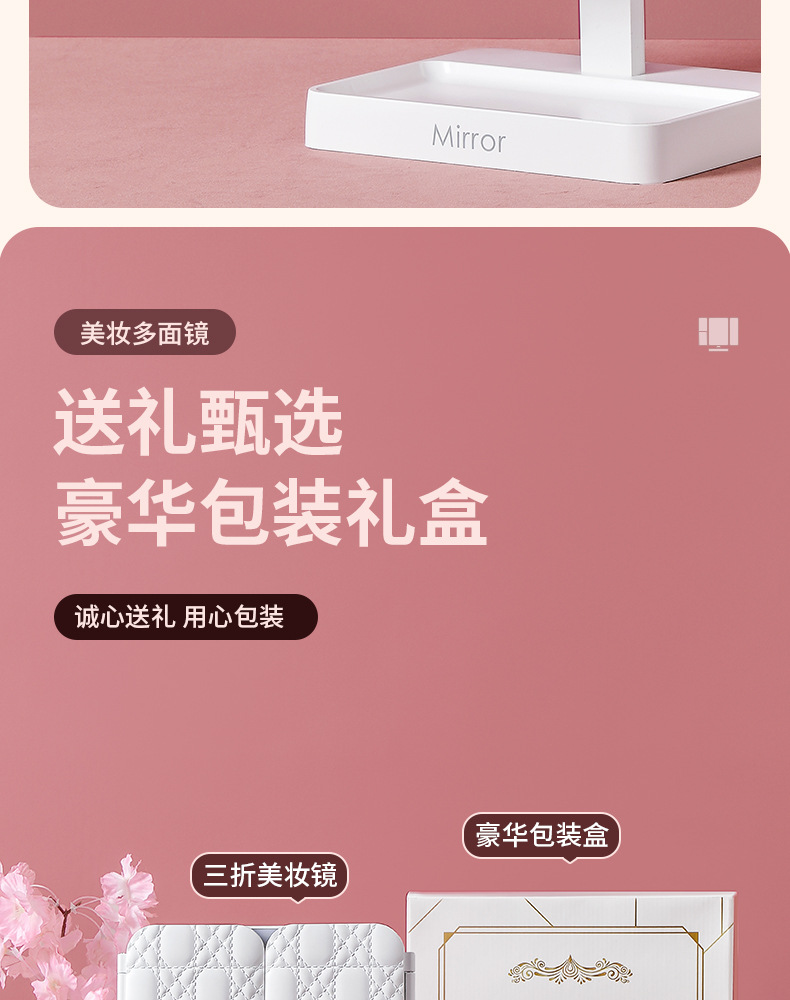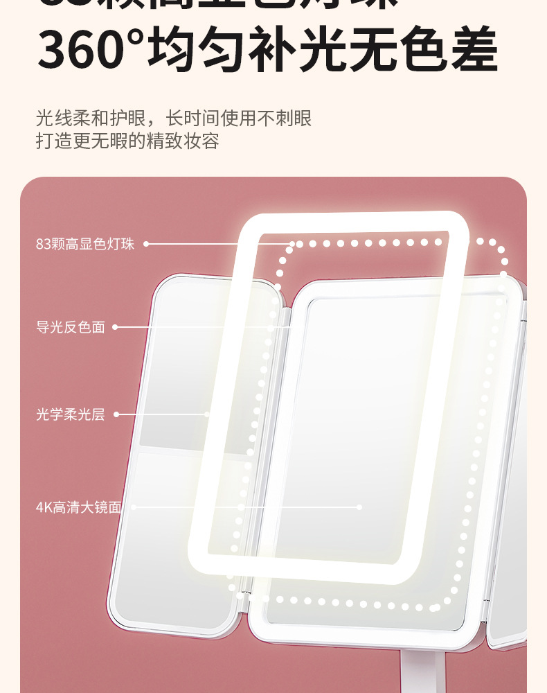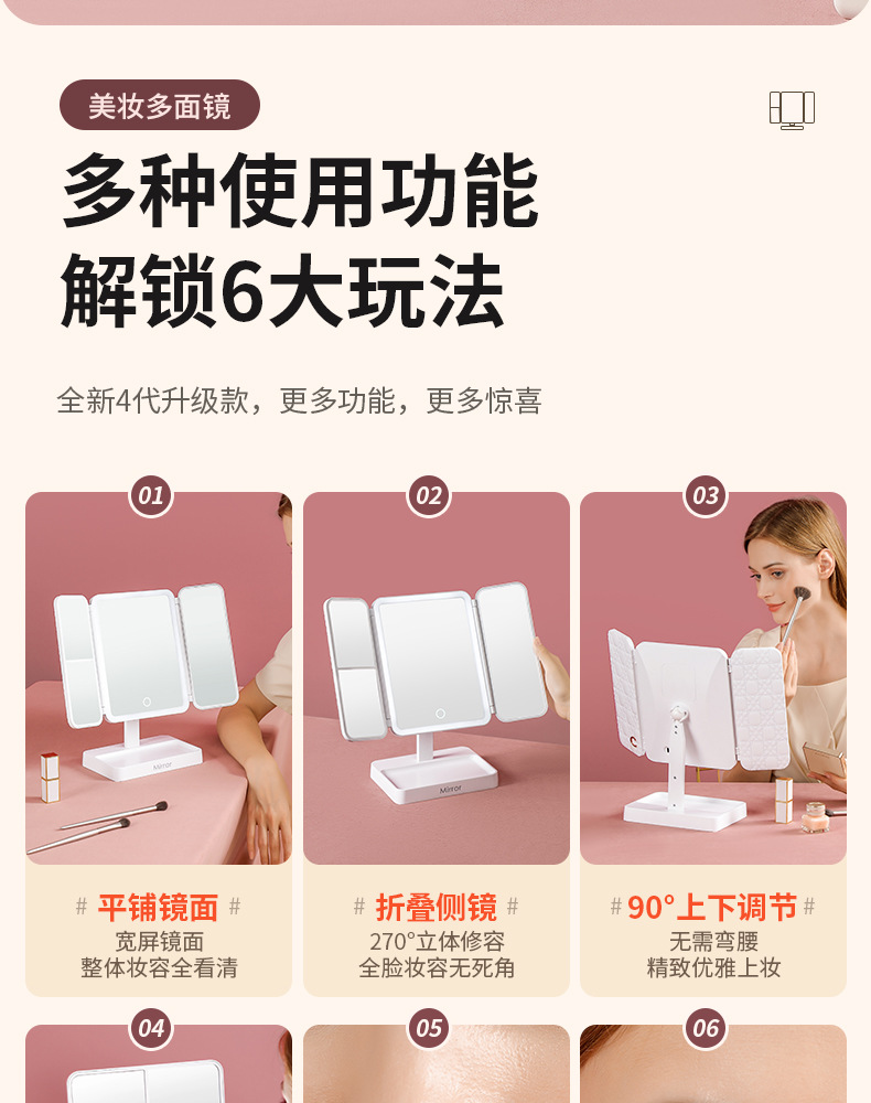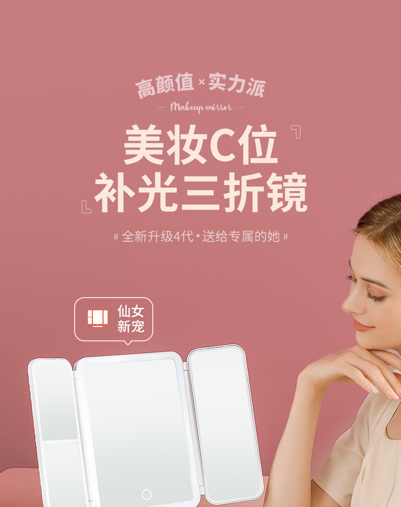 台式led化妆镜收纳盒二合一体贝壳三面折叠梳妆镜可调节镜子跨境