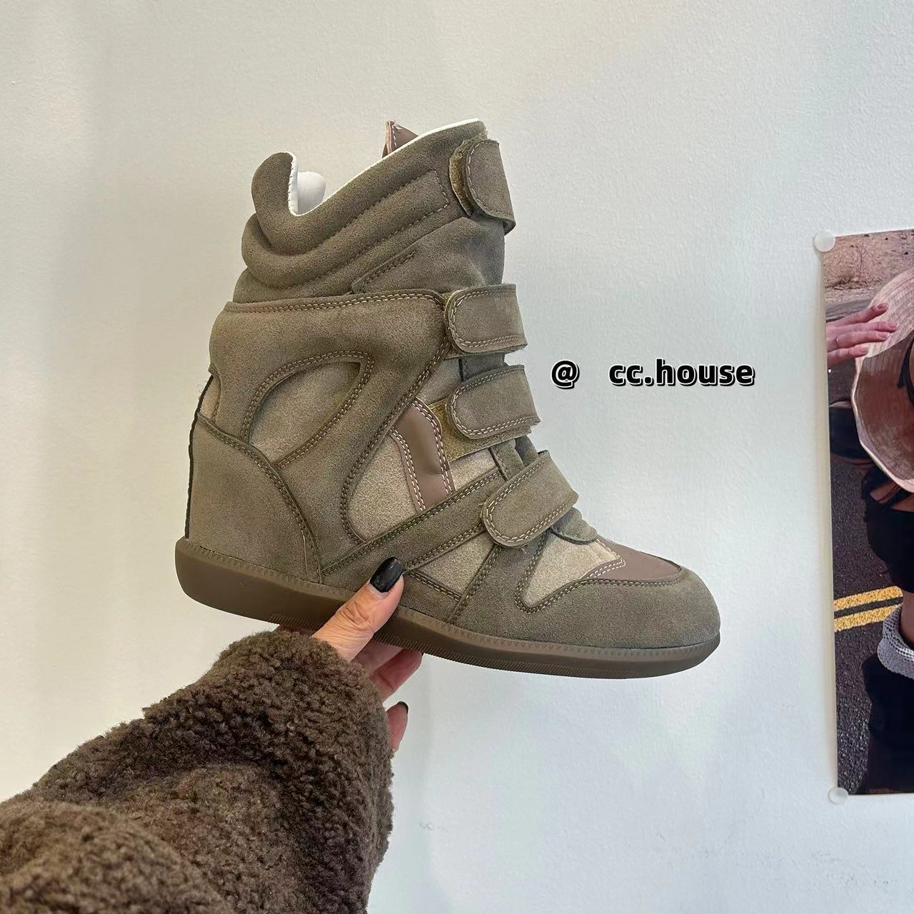 新款2025内增高鞋女高帮拼色圆头平底休闲鞋百搭款魔术贴运动鞋女
