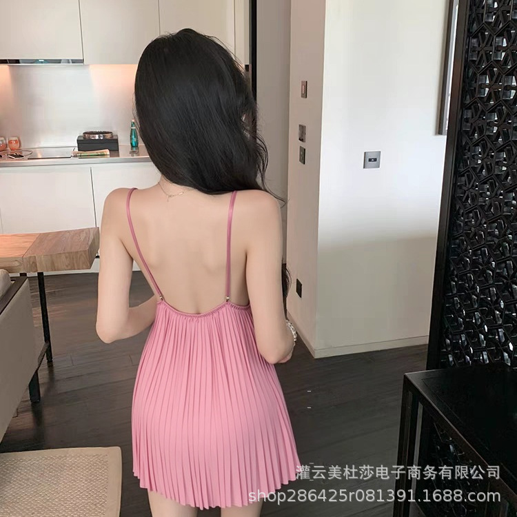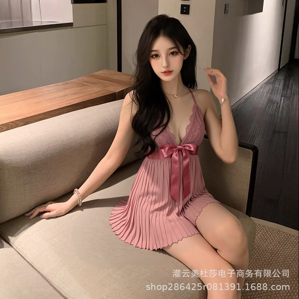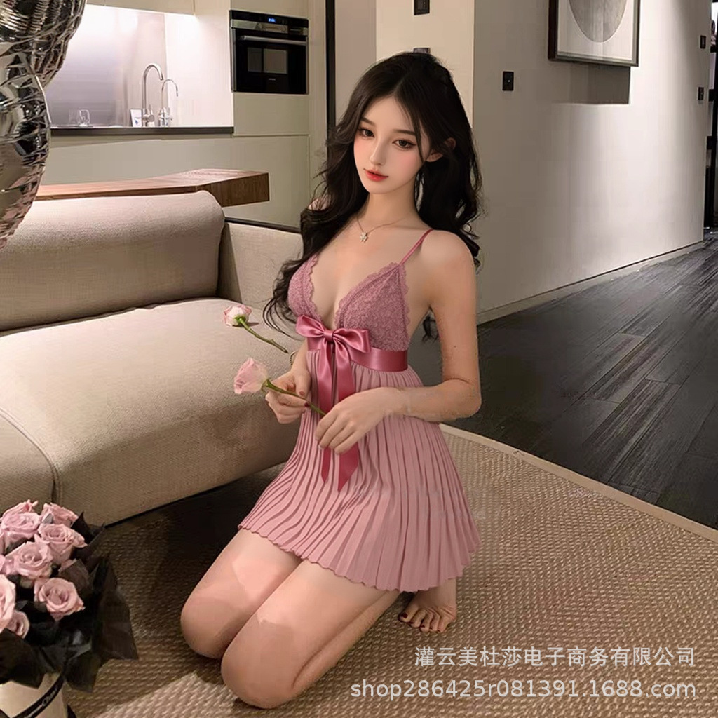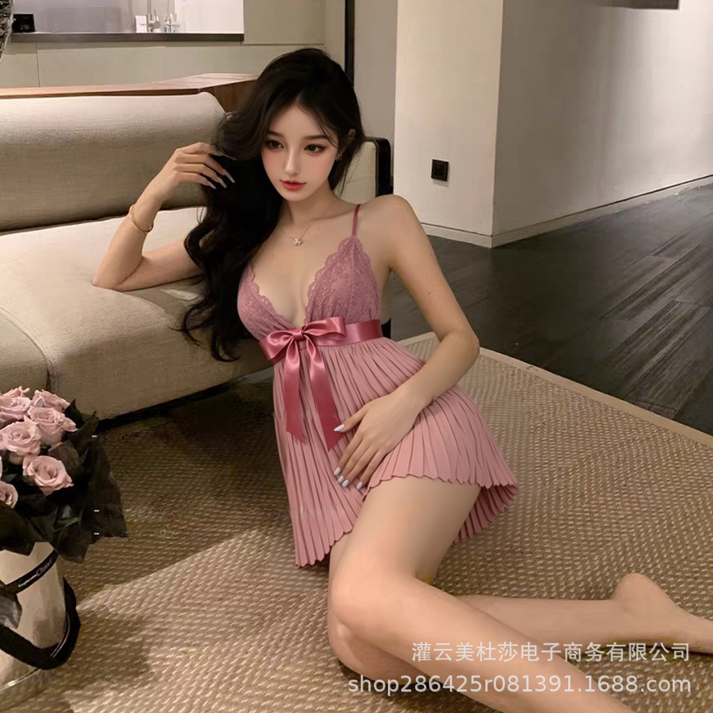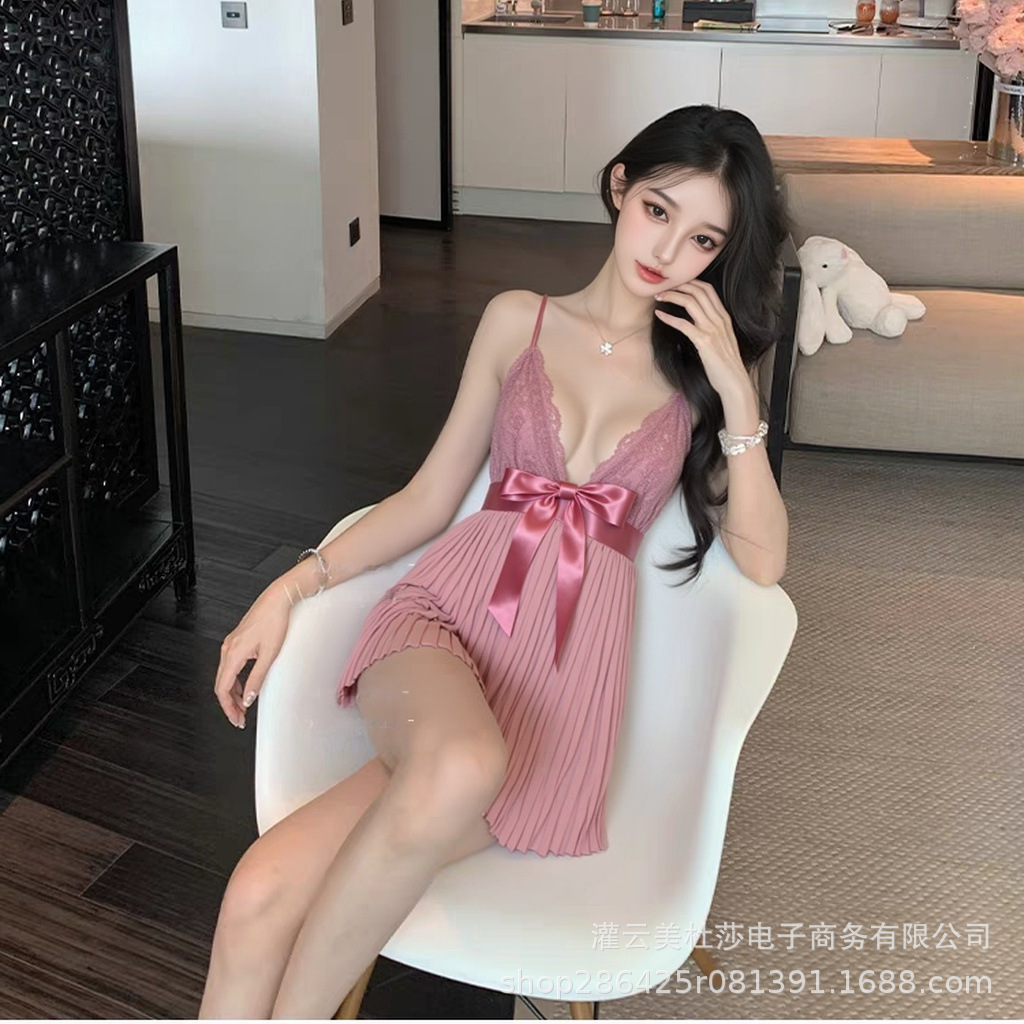 美杜莎新款深V吊带睡裙粉色性感蕾丝蝴蝶结带胸垫女家居细褶睡裙