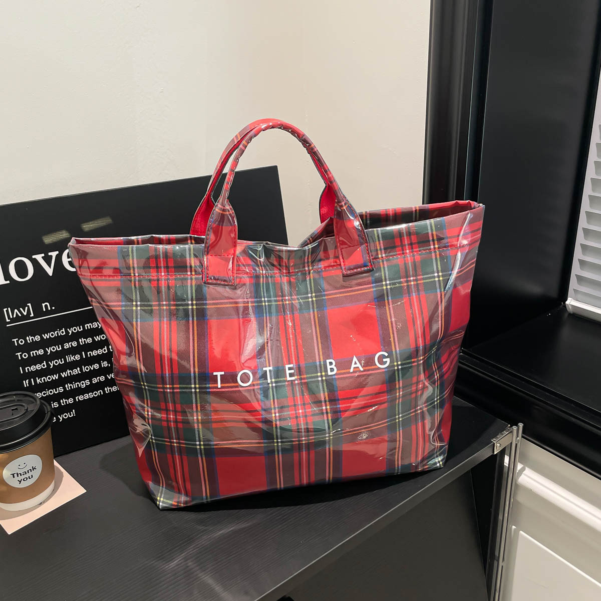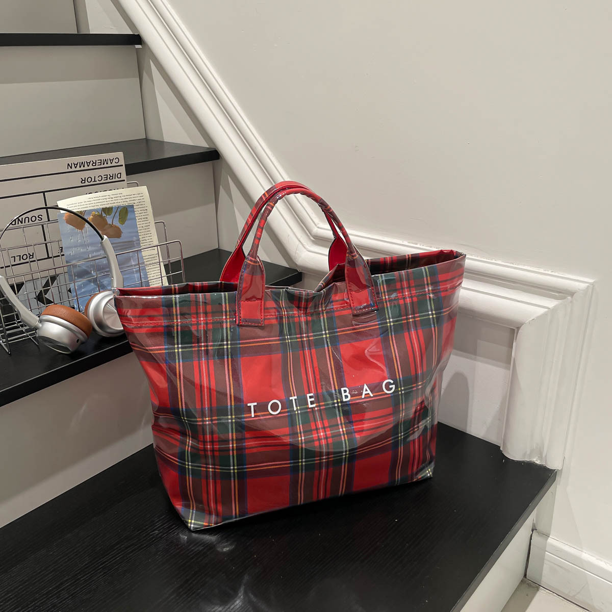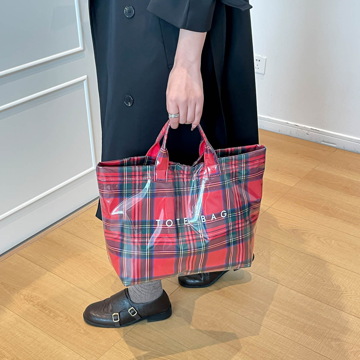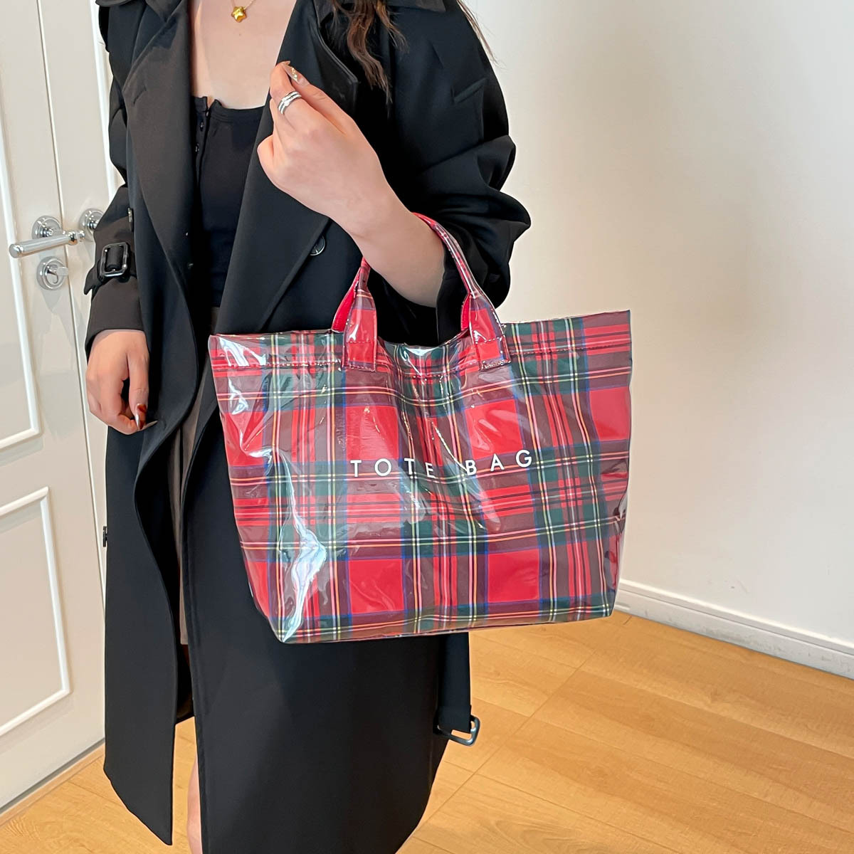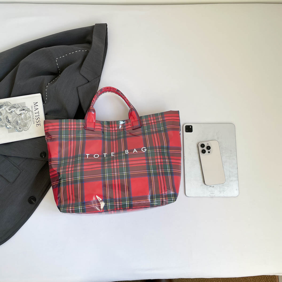 跨境爆款字母托特包2026新款透明简约大容量手提包复古格子女包