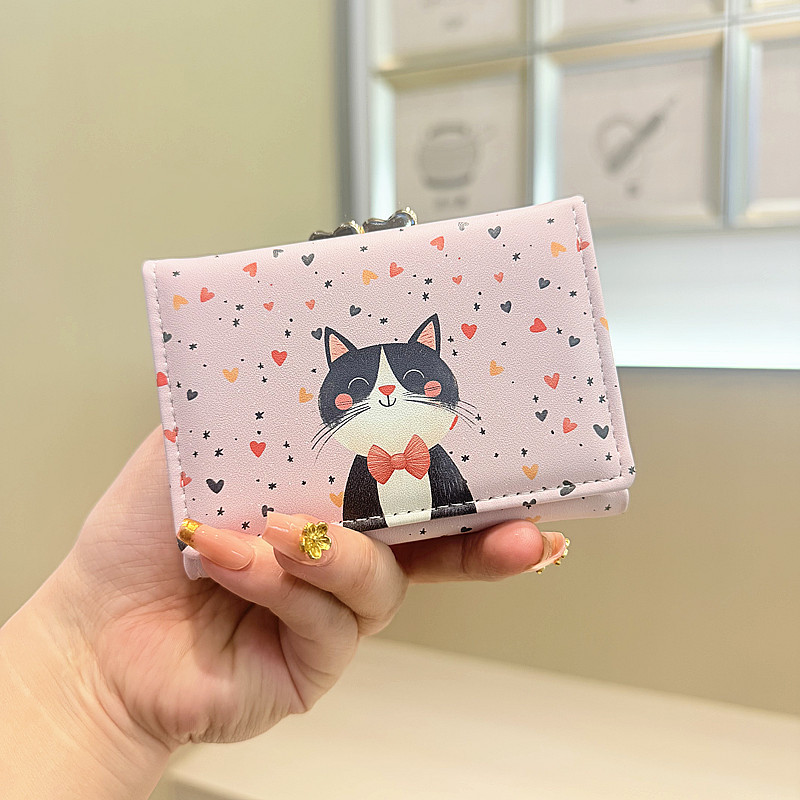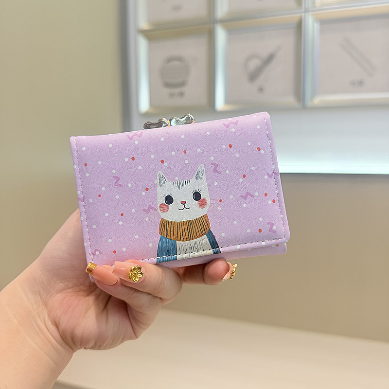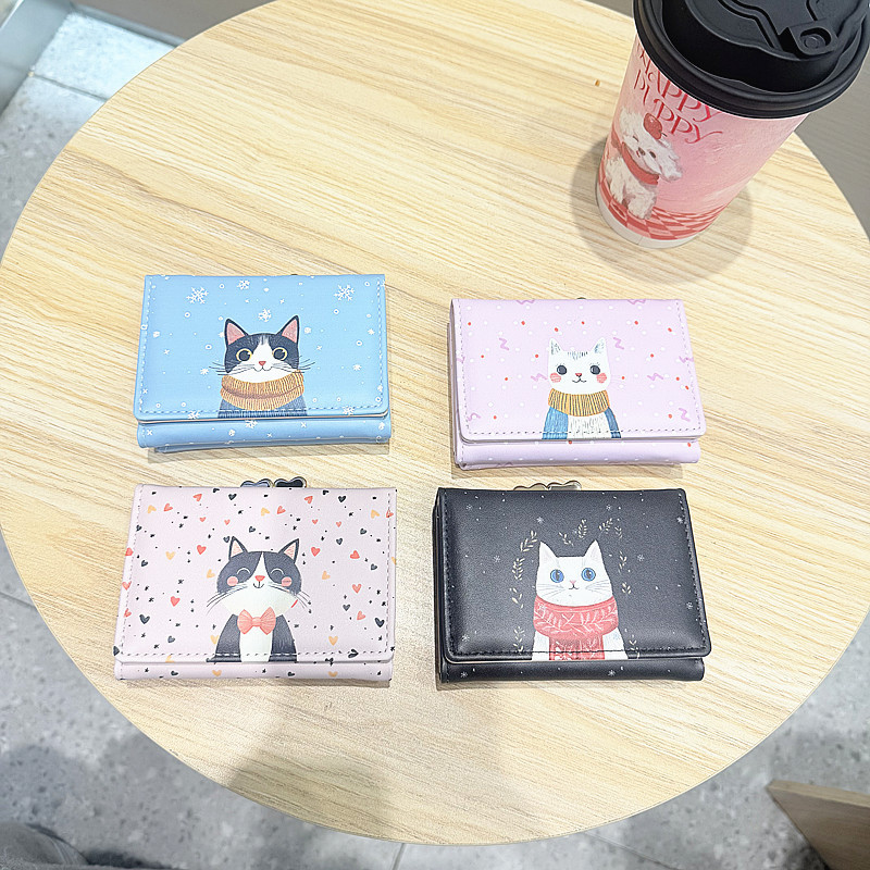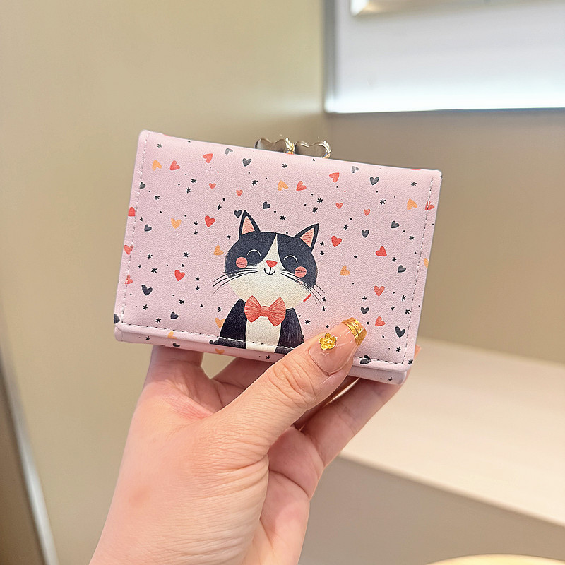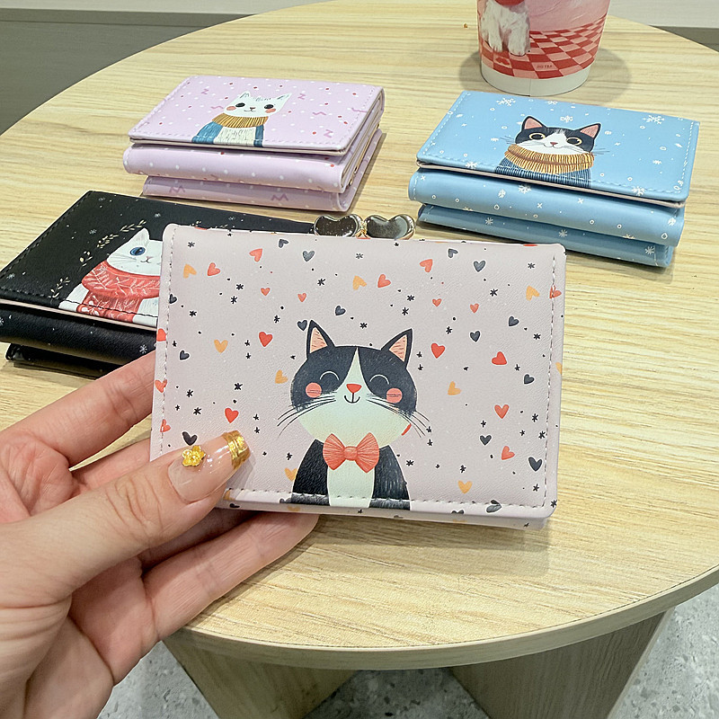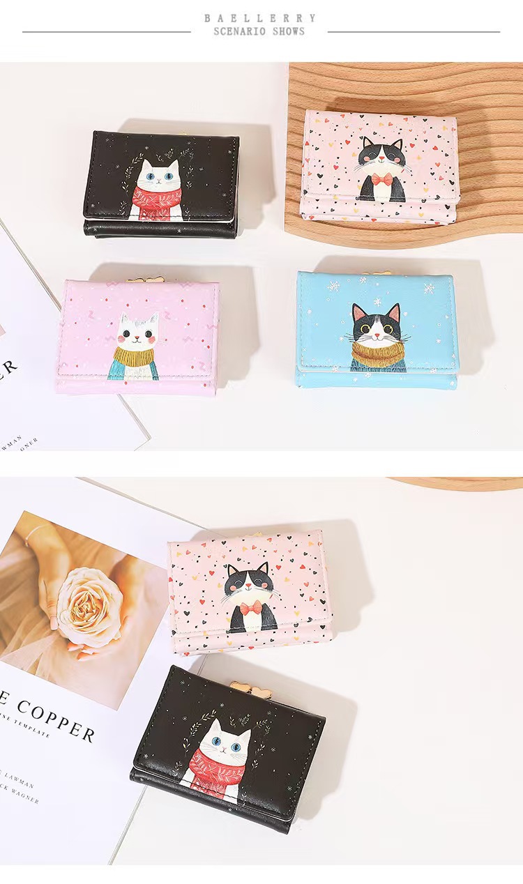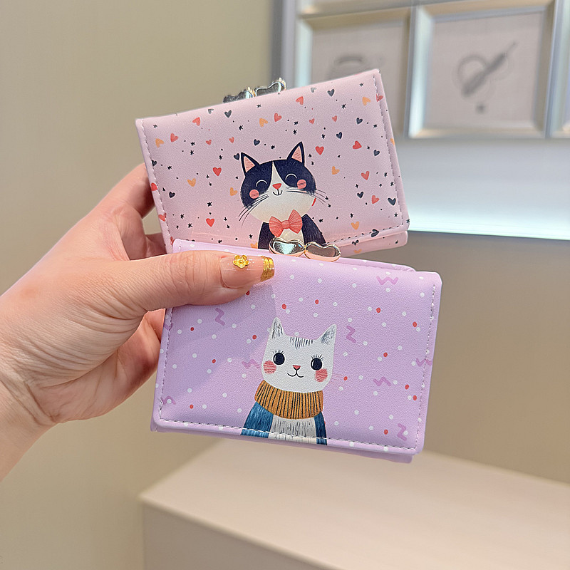 韩版新款萌趣可爱卡通猫咪印花三折铁夹小巧短款零钱包女士钱包