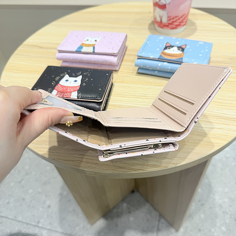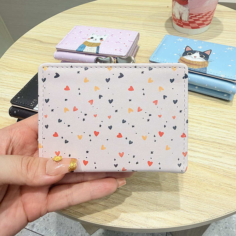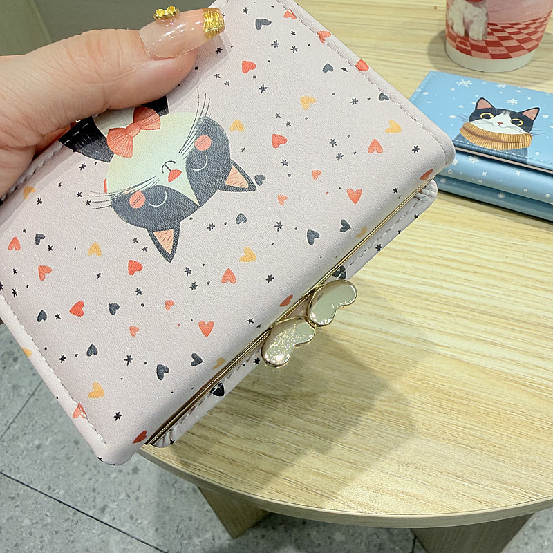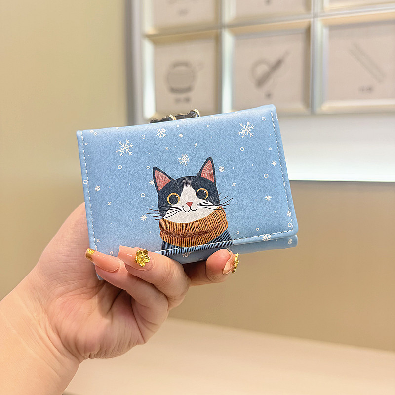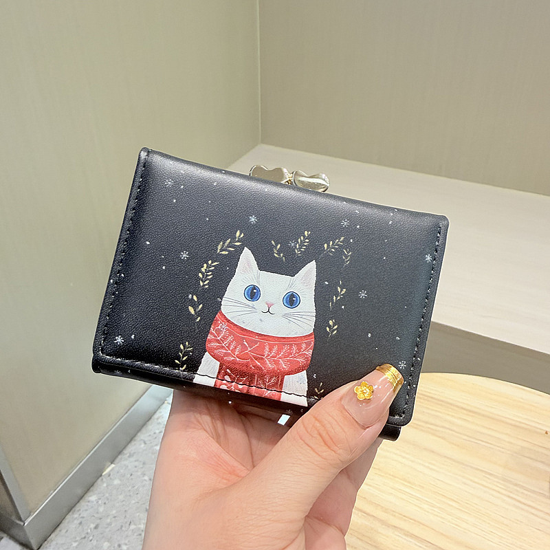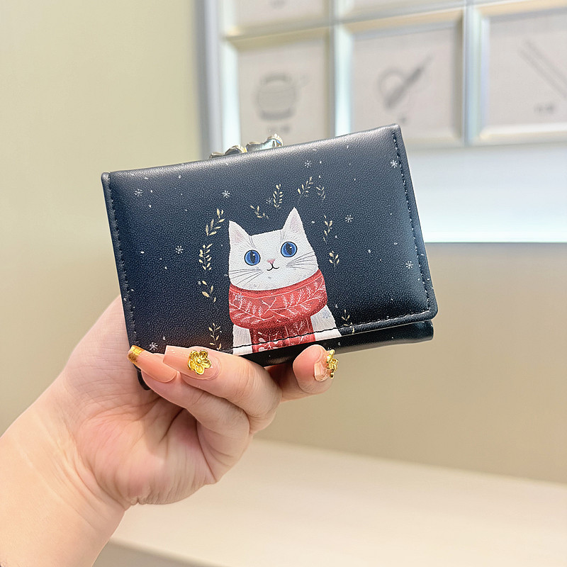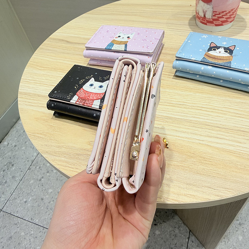 韩版新款萌趣可爱卡通猫咪印花三折铁夹小巧短款零钱包女士钱包