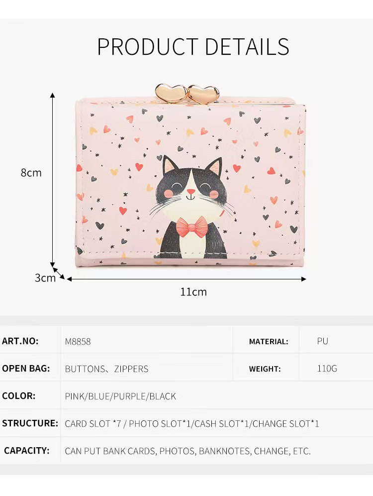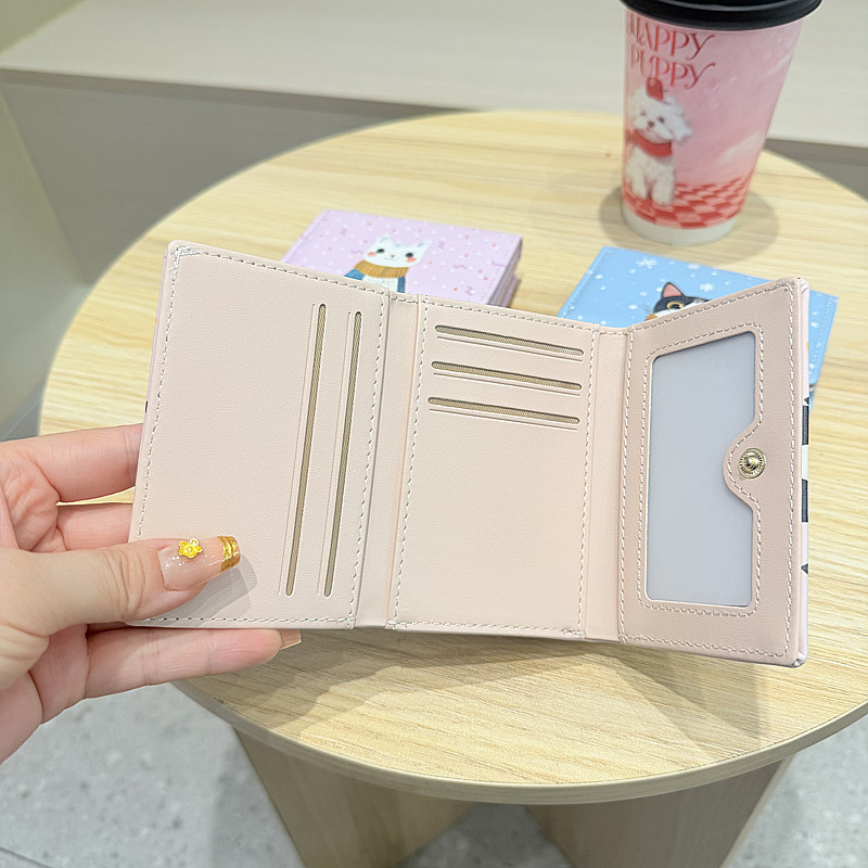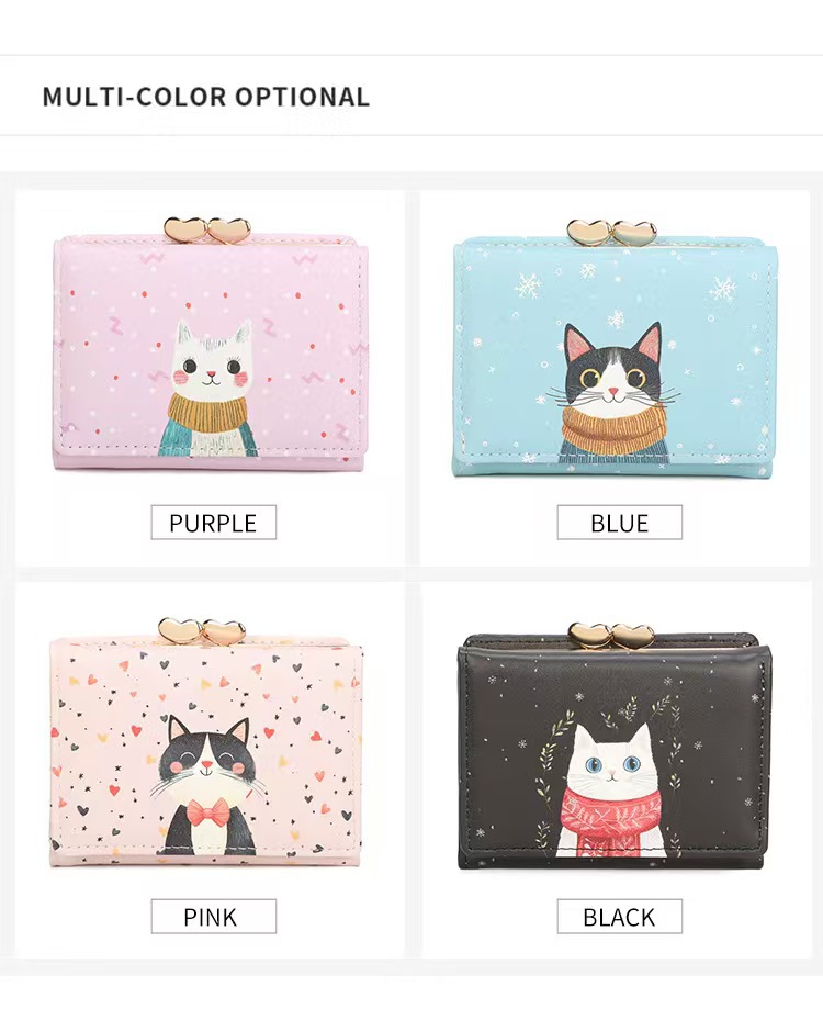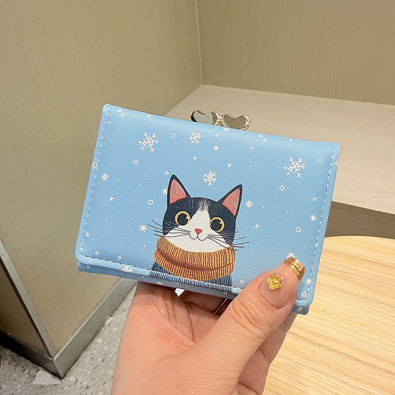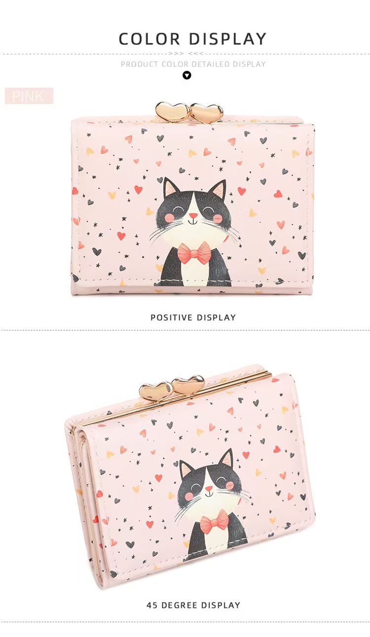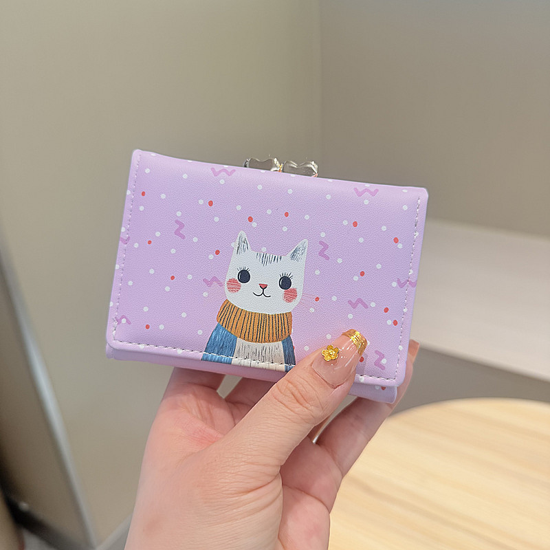 韩版新款萌趣可爱卡通猫咪印花三折铁夹小巧短款零钱包女士钱包
