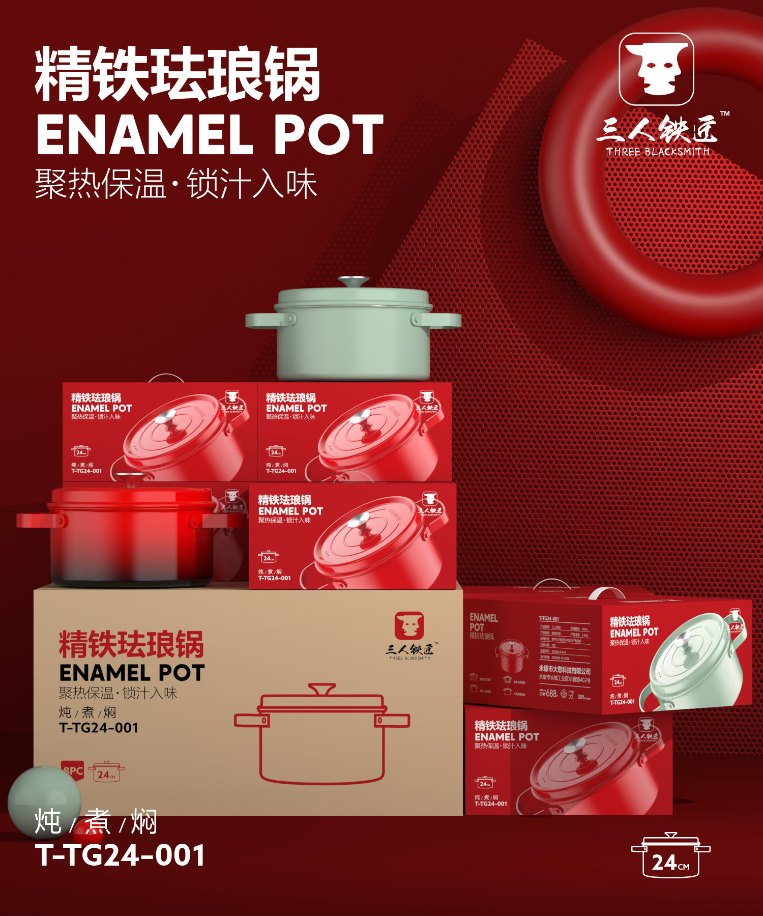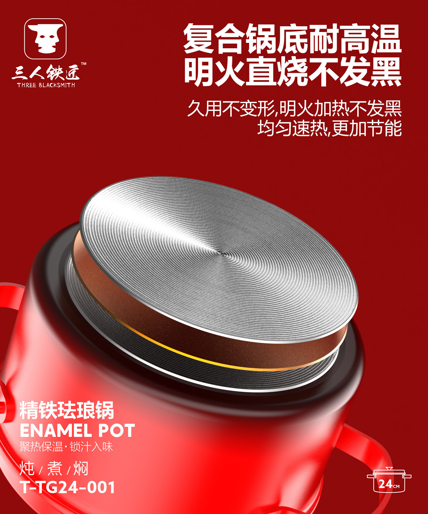 三人铁匠铸铁不粘锅家用大容量煲汤锅双耳珐琅锅加厚通用炖煮锅具