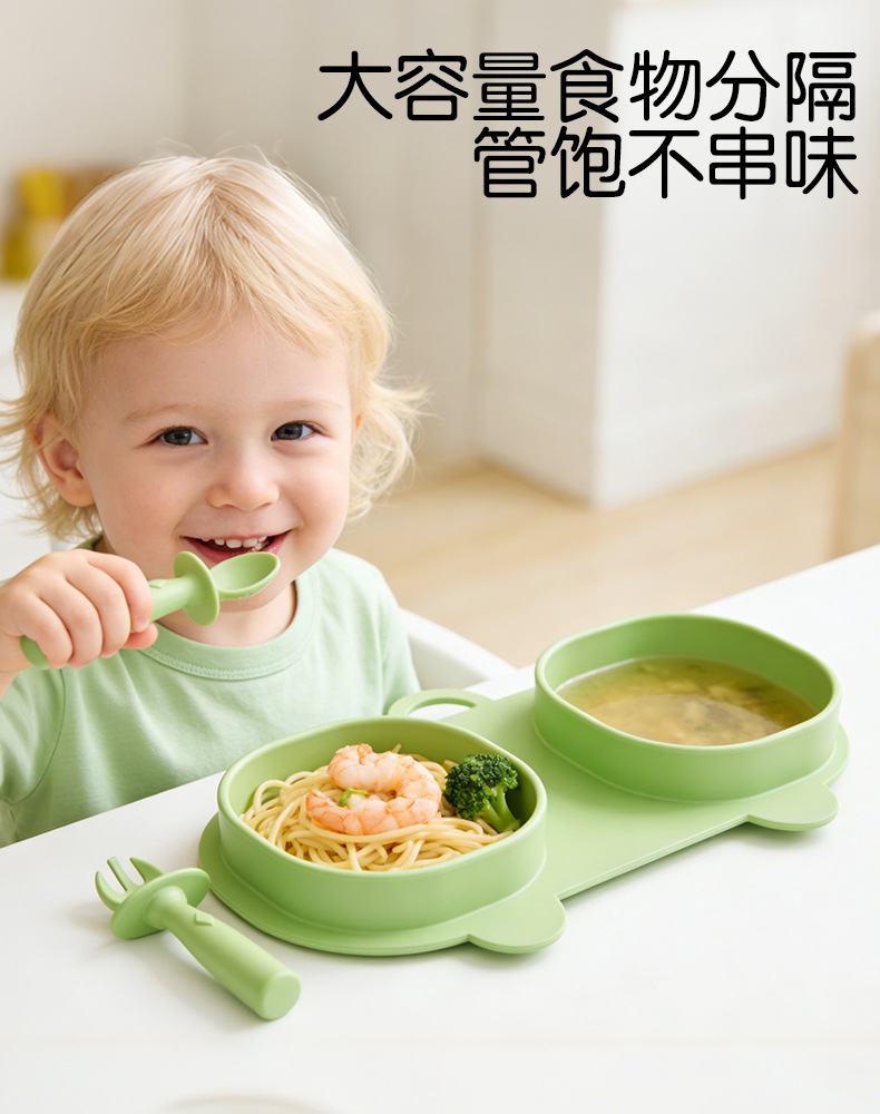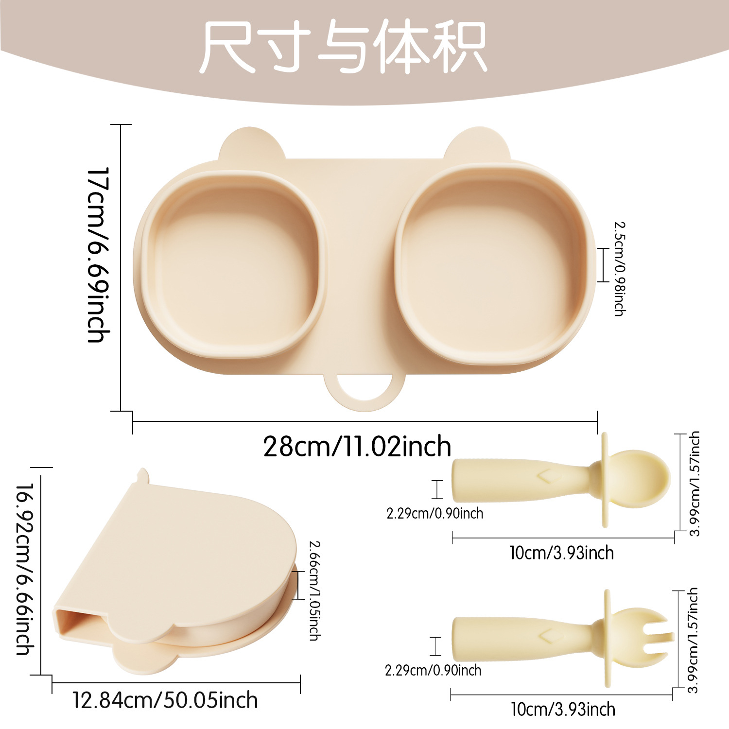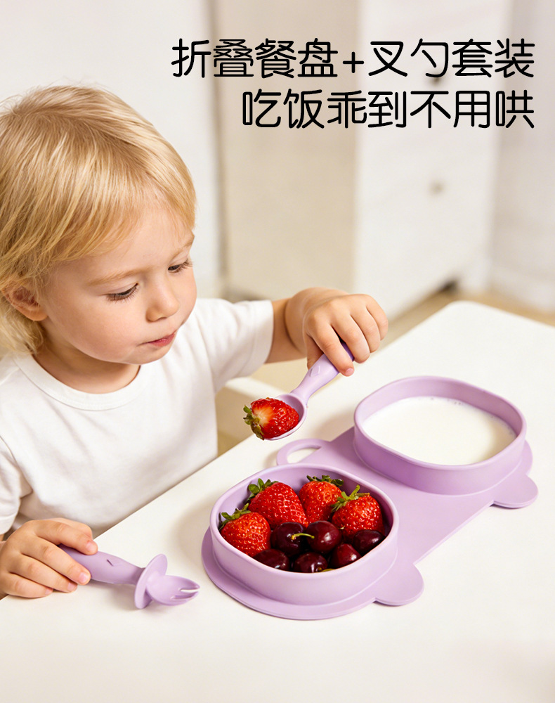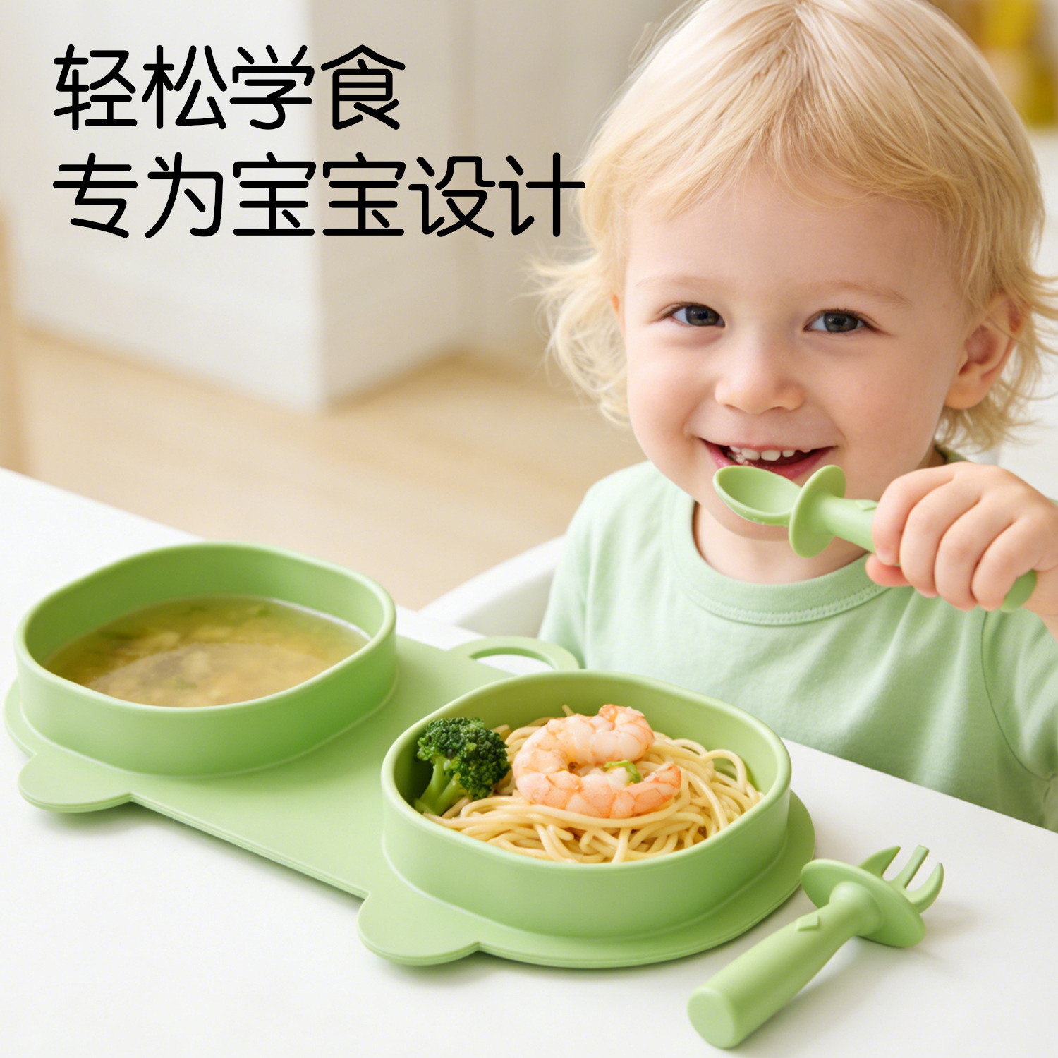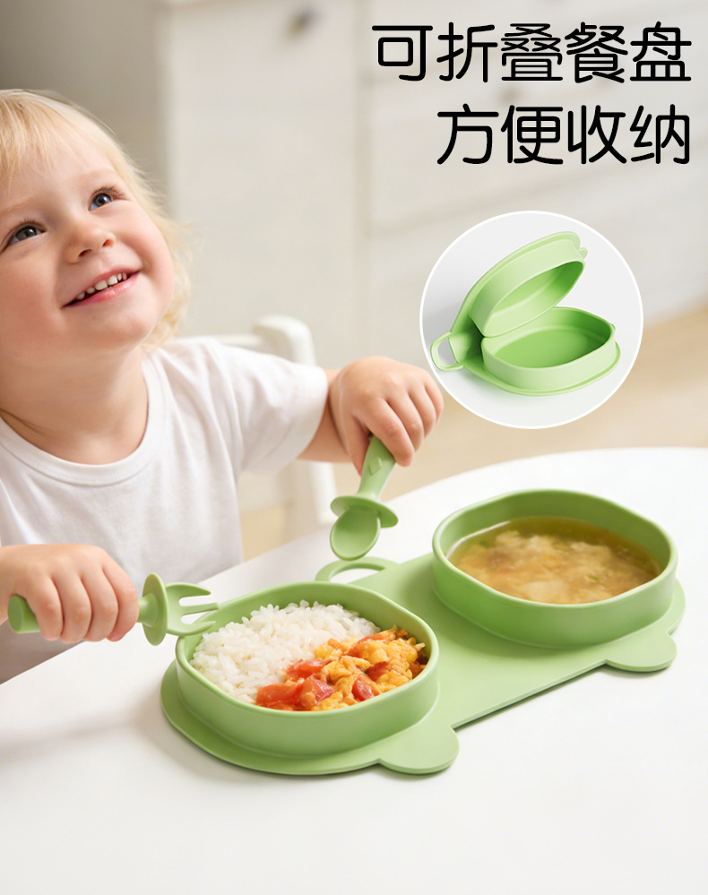 新品分格儿童餐具套装婴儿硅胶辅食碗便携可折叠叉勺动物卡通餐盘