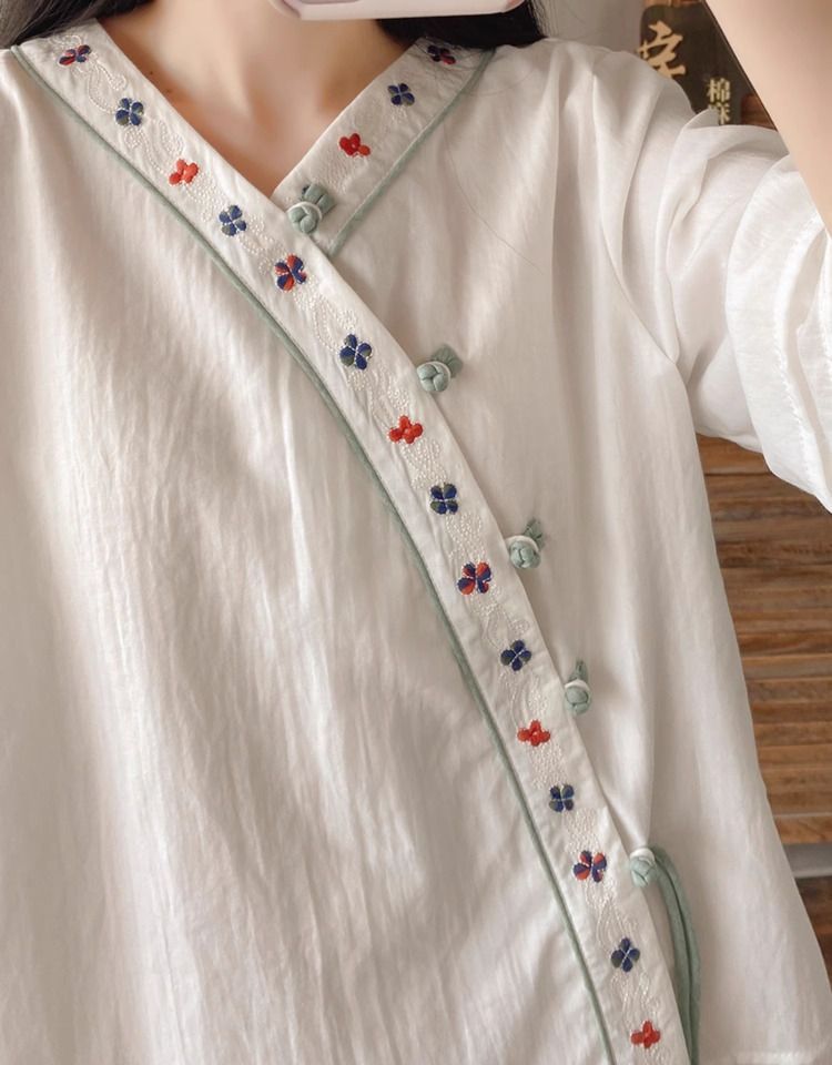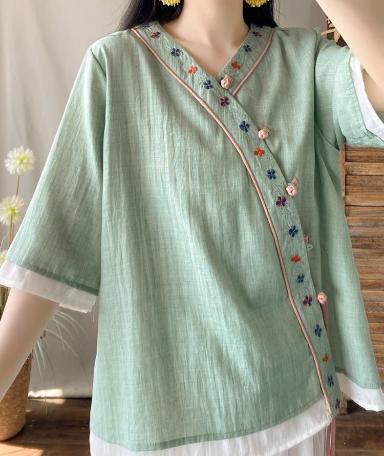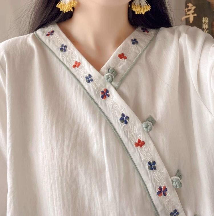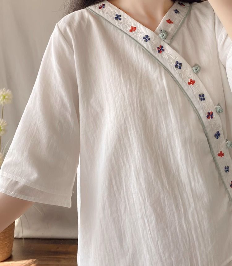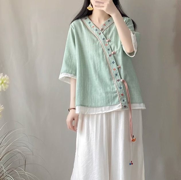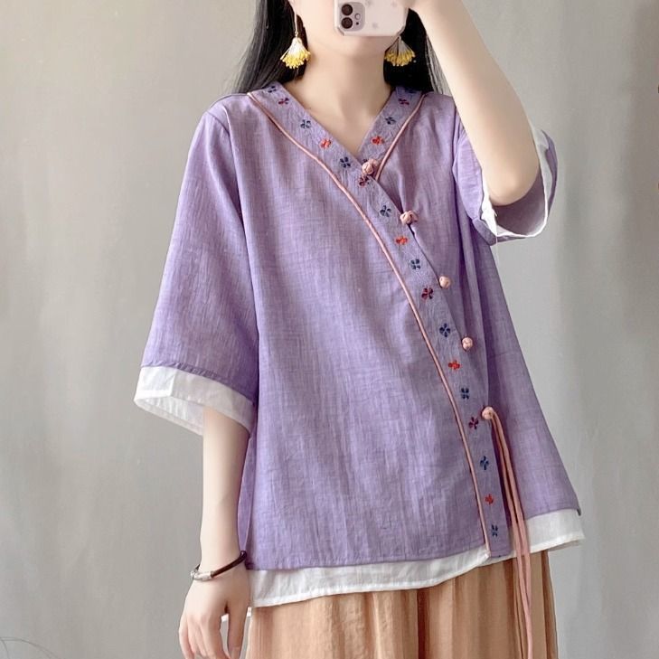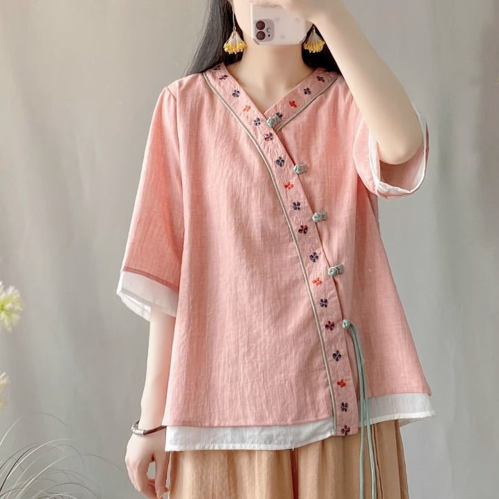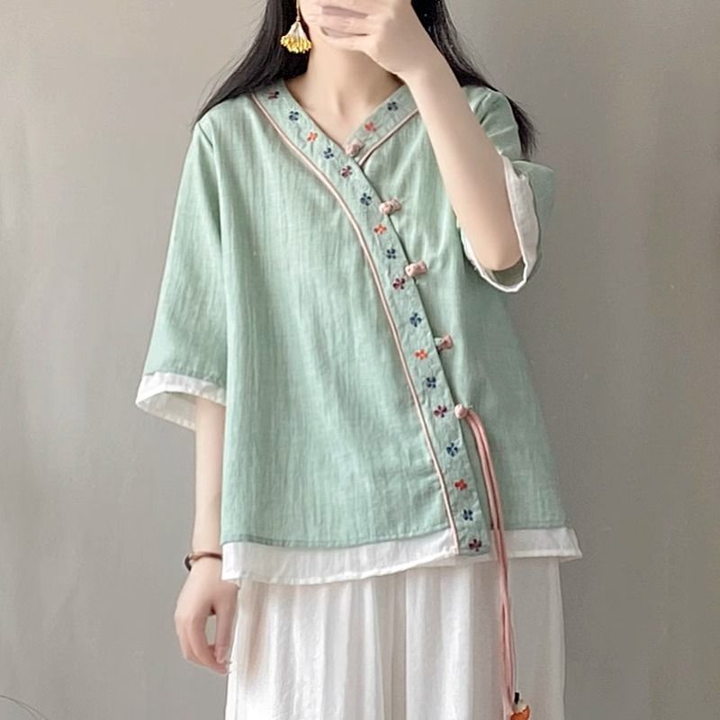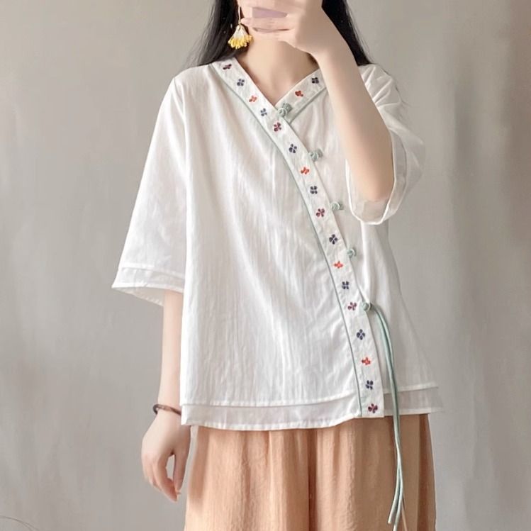 夏季中式复古棉麻斜襟盘扣汉服刺绣禅意衬衫改良茶服宽松V领上衣