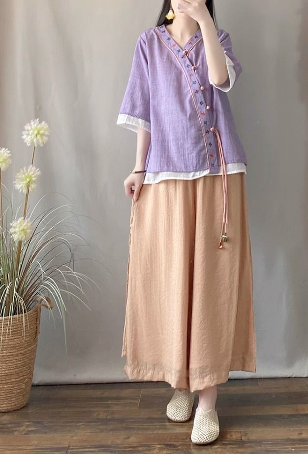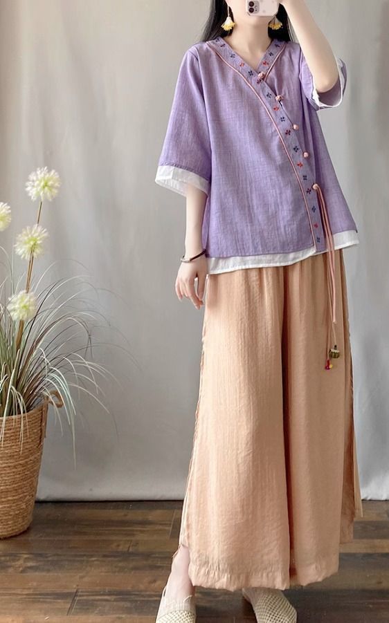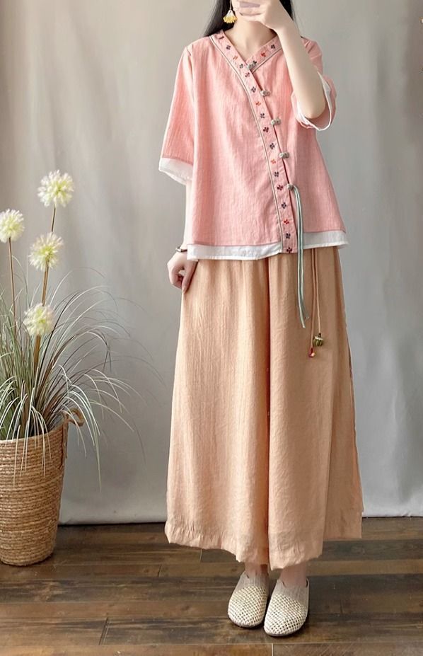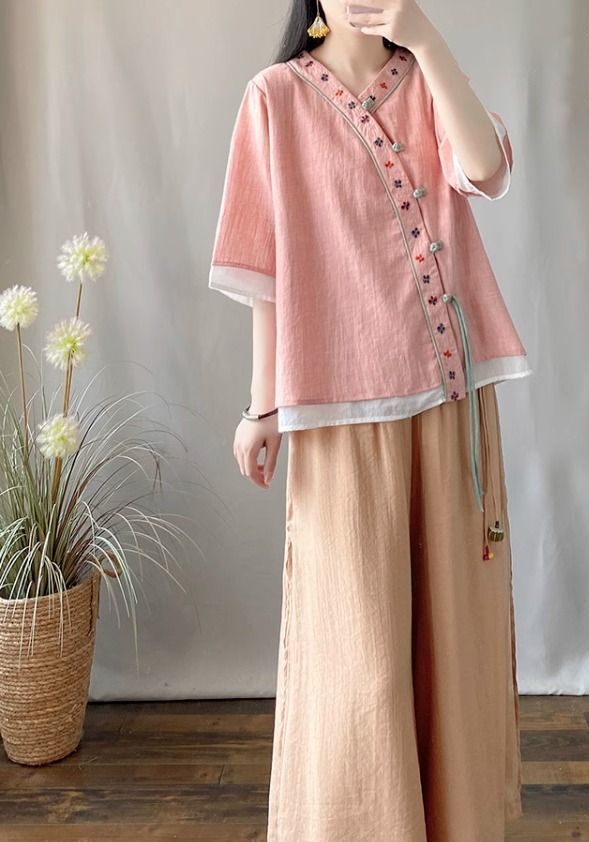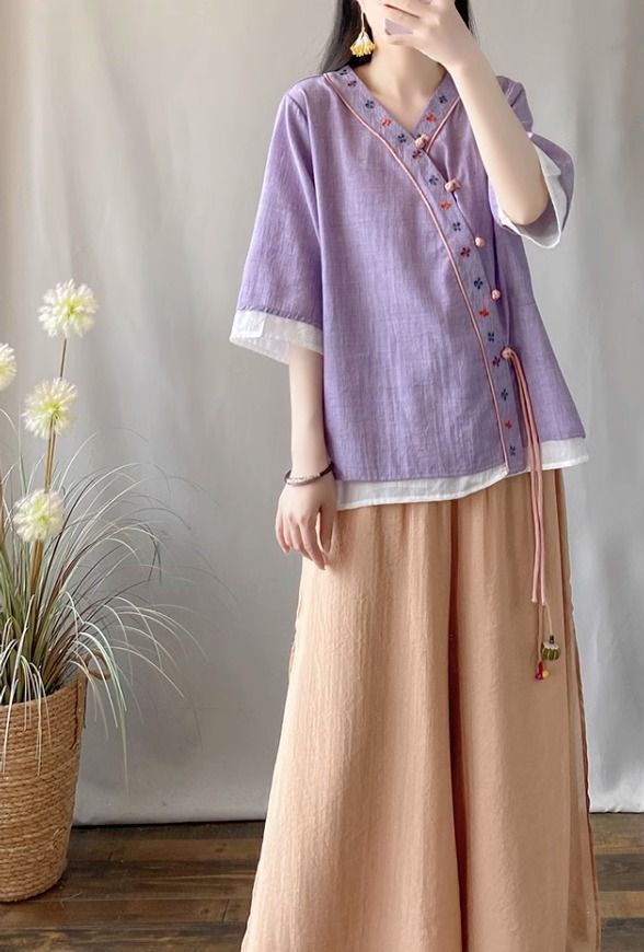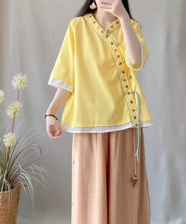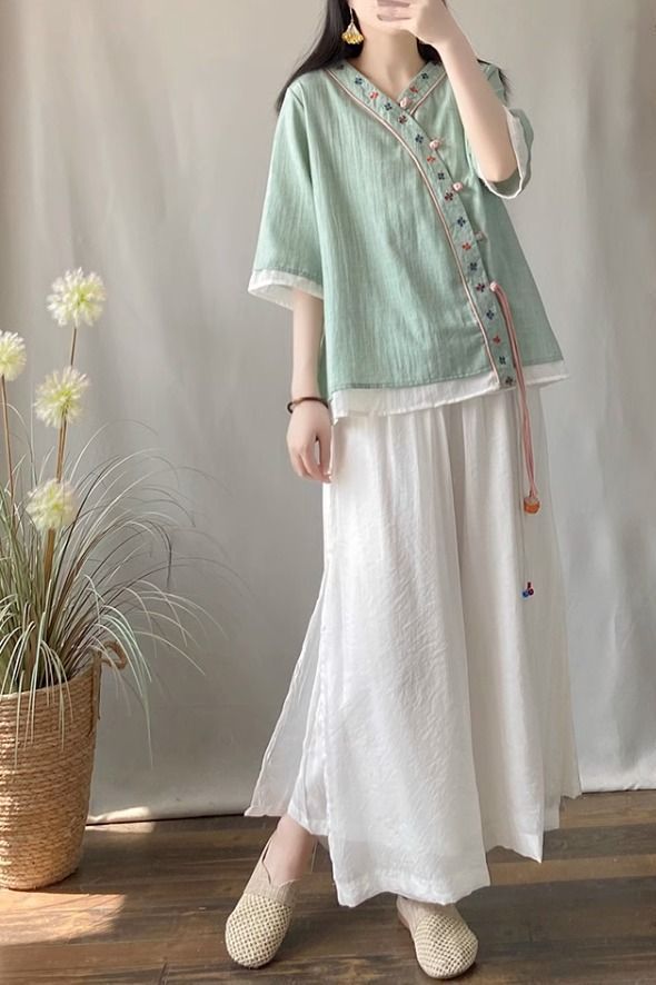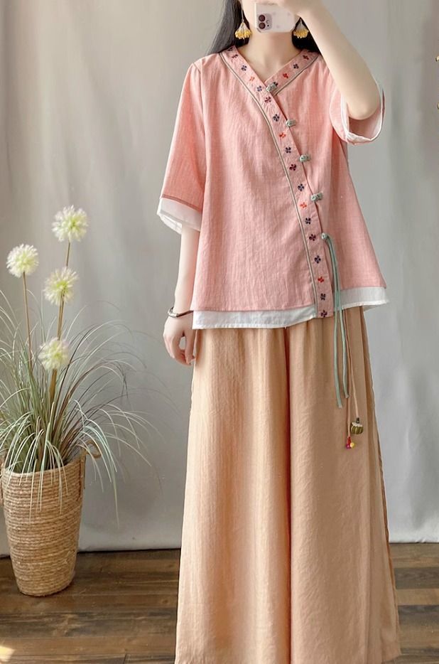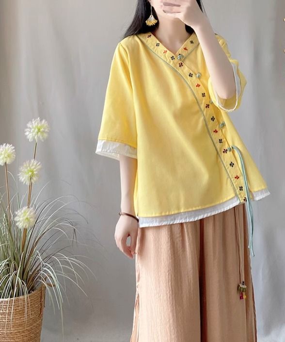 夏季中式复古棉麻斜襟盘扣汉服刺绣禅意衬衫改良茶服宽松V领上衣