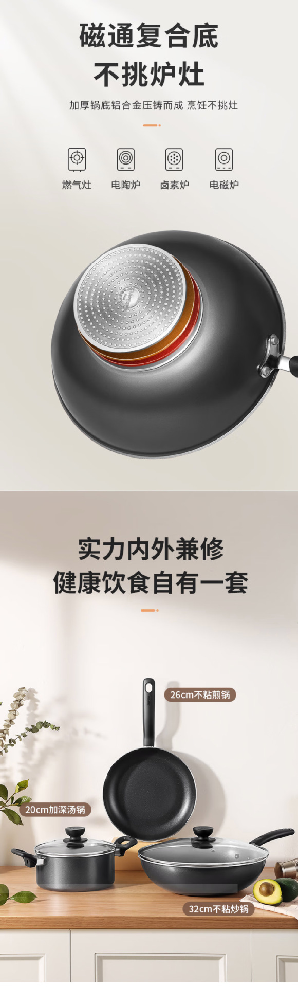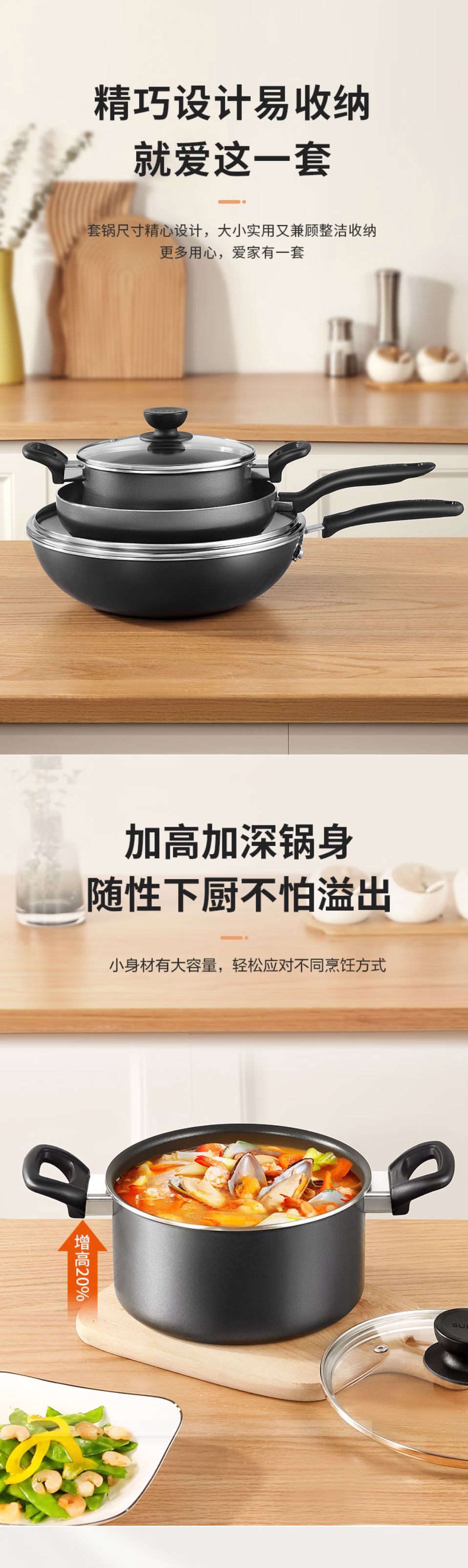 苏泊尔(SUPOR)锅具套装不粘炒锅煎锅汤锅三件套TP2314K玻璃盖