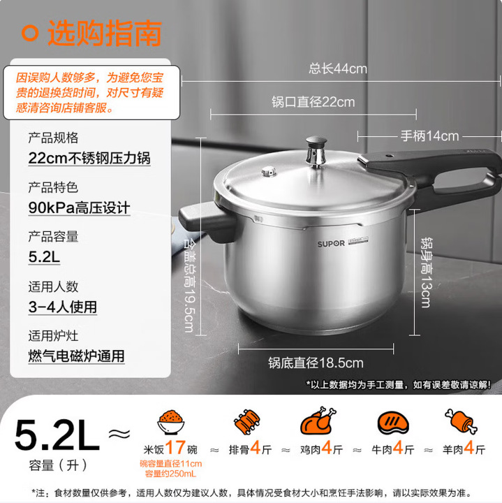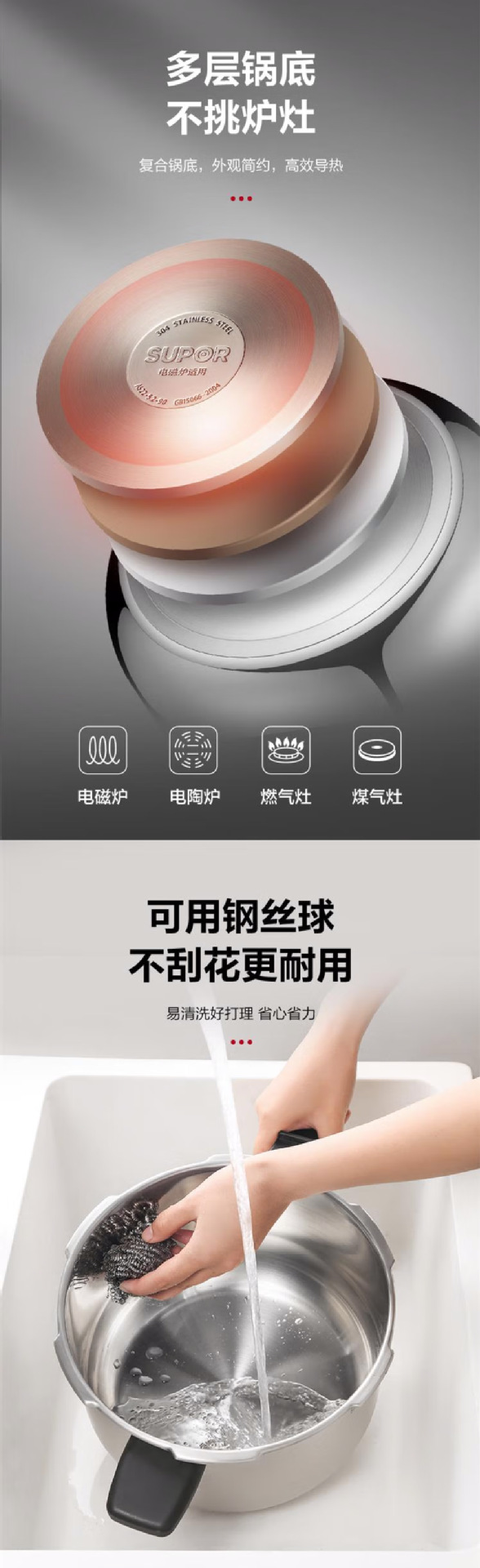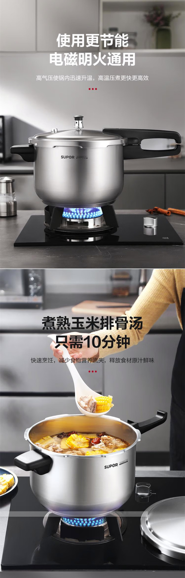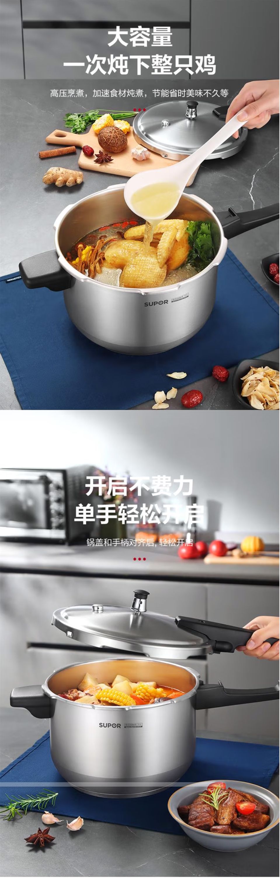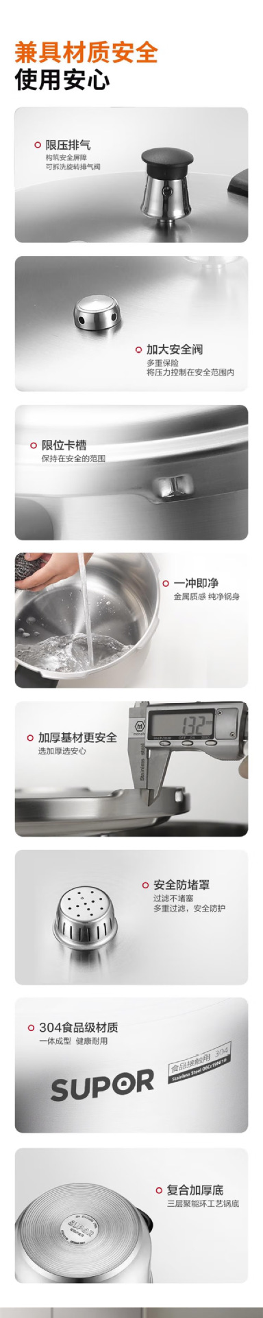 苏泊尔(SUPOR)家用高压锅304不锈钢22cm压力锅燃气通用YW223FB1