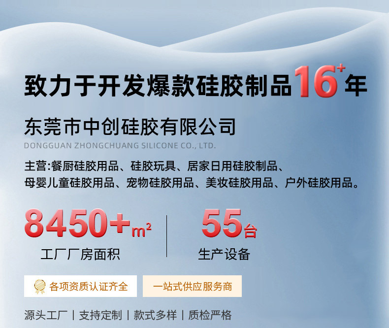 主营:餐厨硅胶用品、硅胶玩具、居家日用硅胶制品、母婴儿童硅胶用品、宠物硅胶用品、美妆硅胶用品、户外硅胶用品