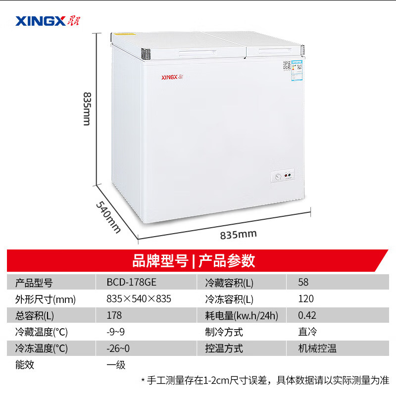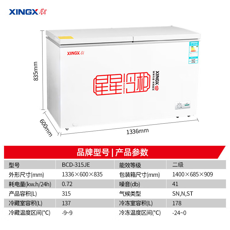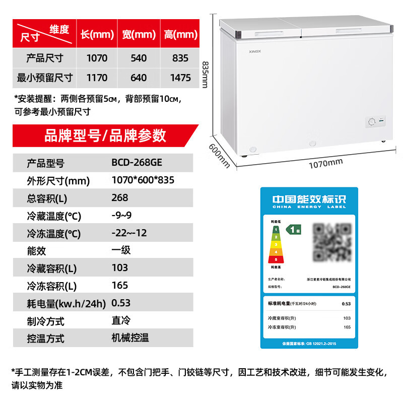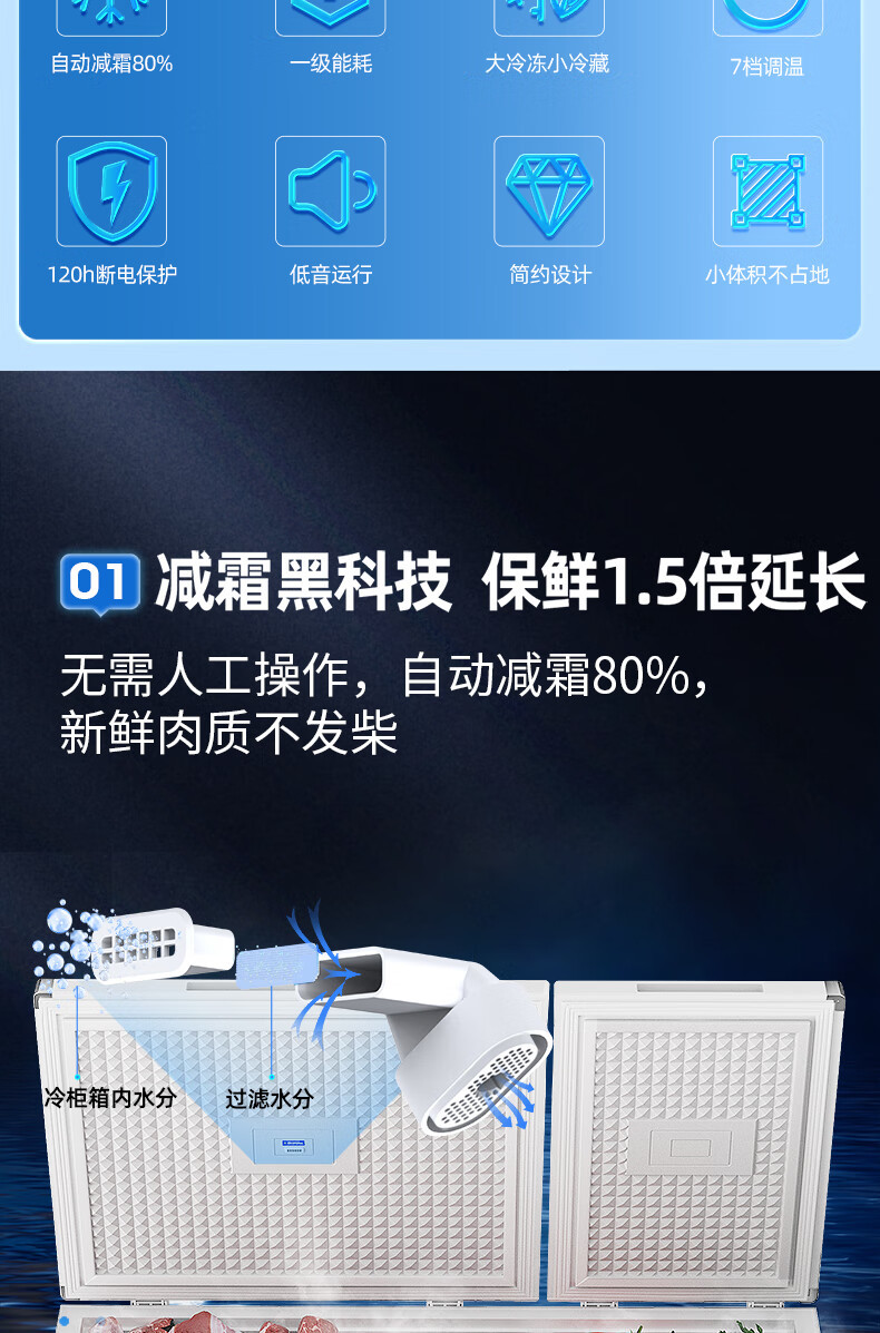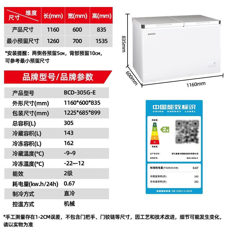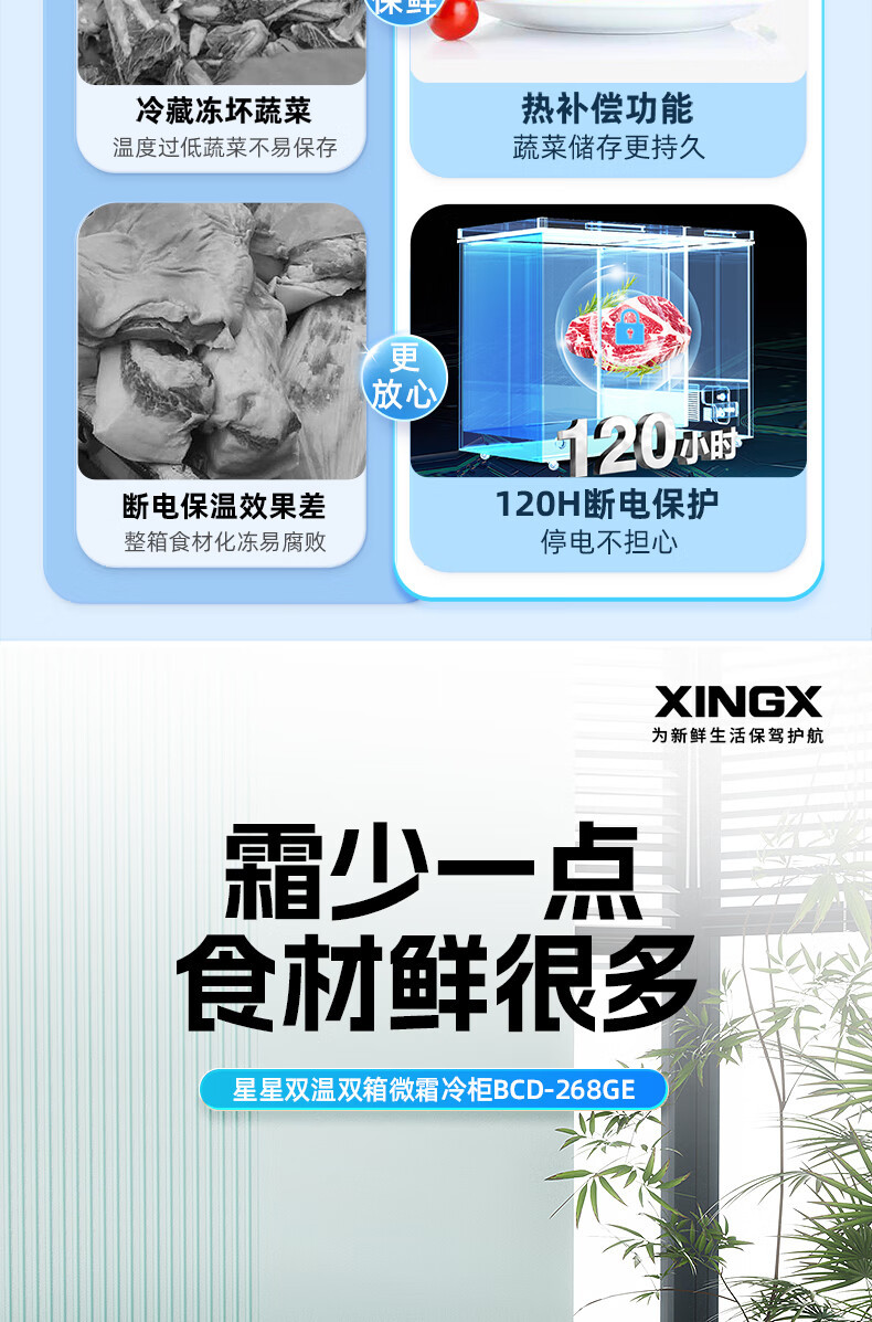 星星冰柜家用冷藏保鲜冷冻两用双温大容量卧式小冷柜268L双门商用