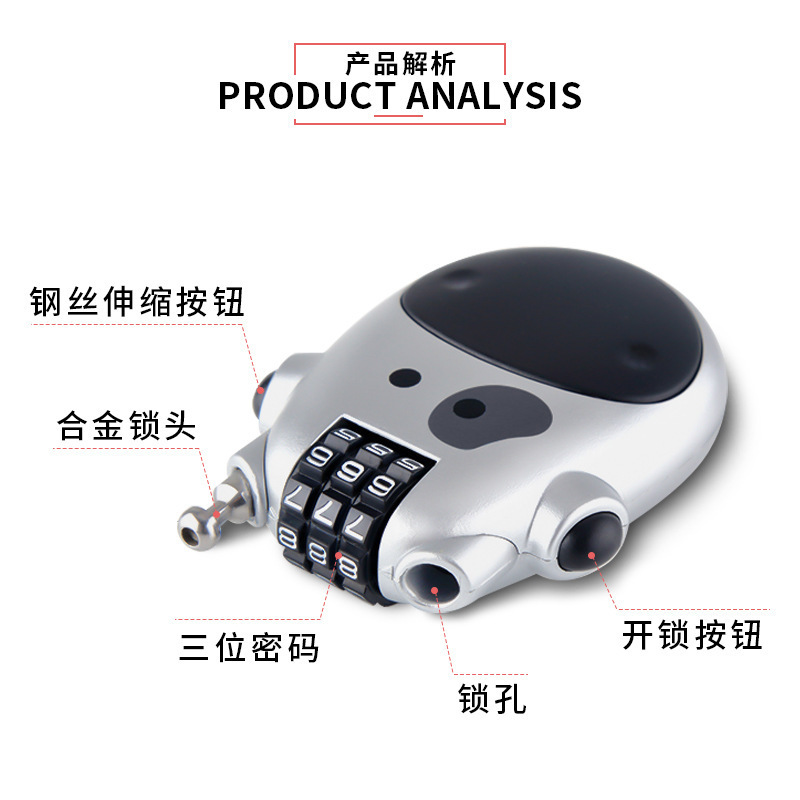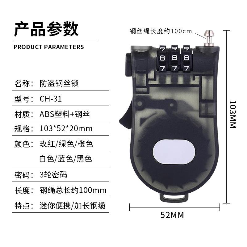 CH-35厂家生产旅行ABS3位密码钢丝绳登山包锁头盔锁奶牛锁
