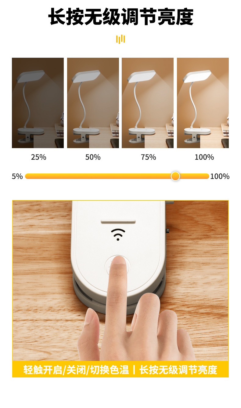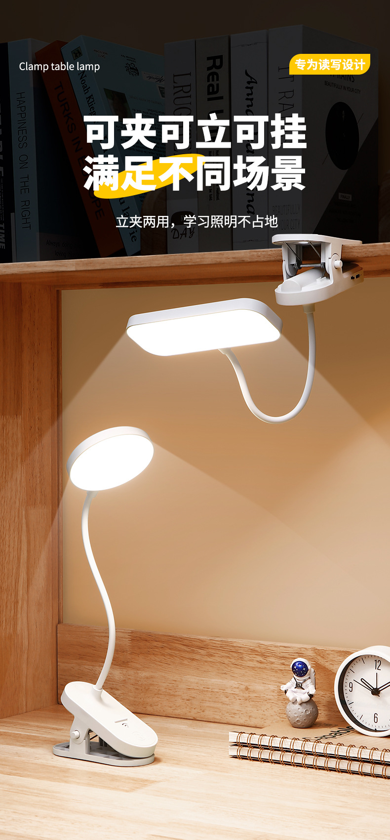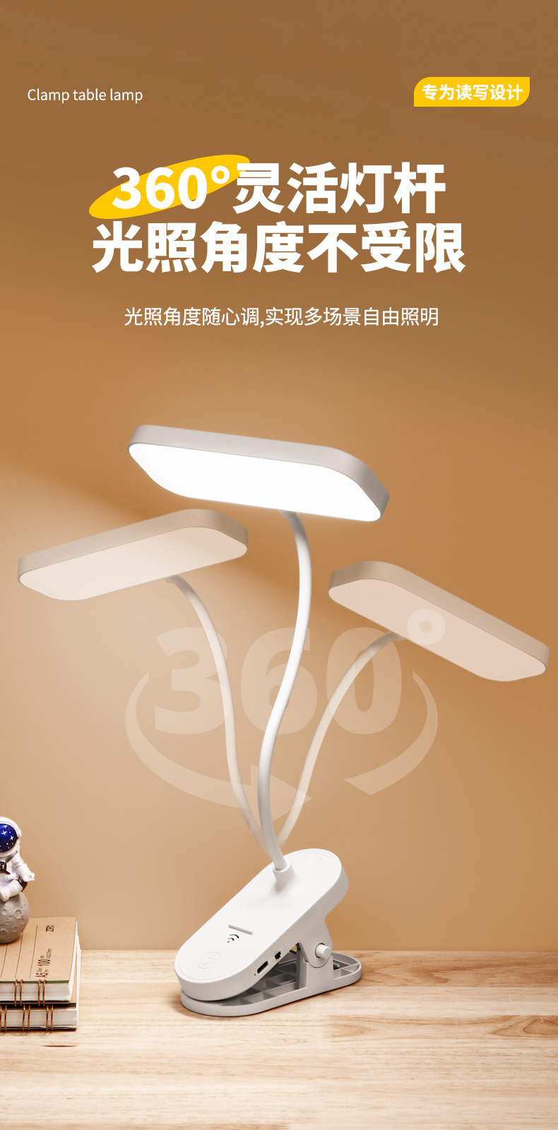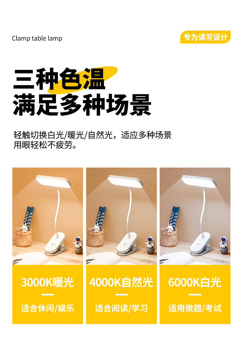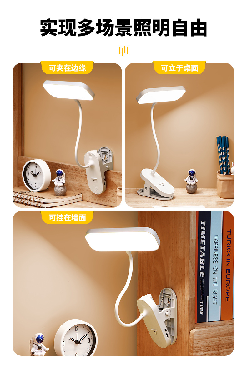 跨境方头夹式小台灯床头灯学习用学生宿舍led护眼充电卧室可夹灯