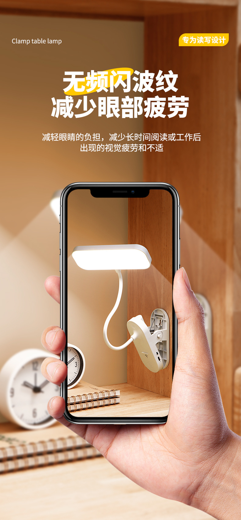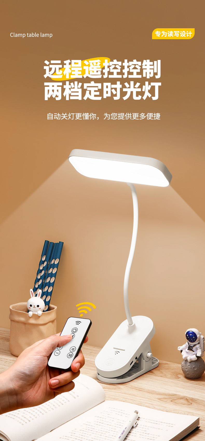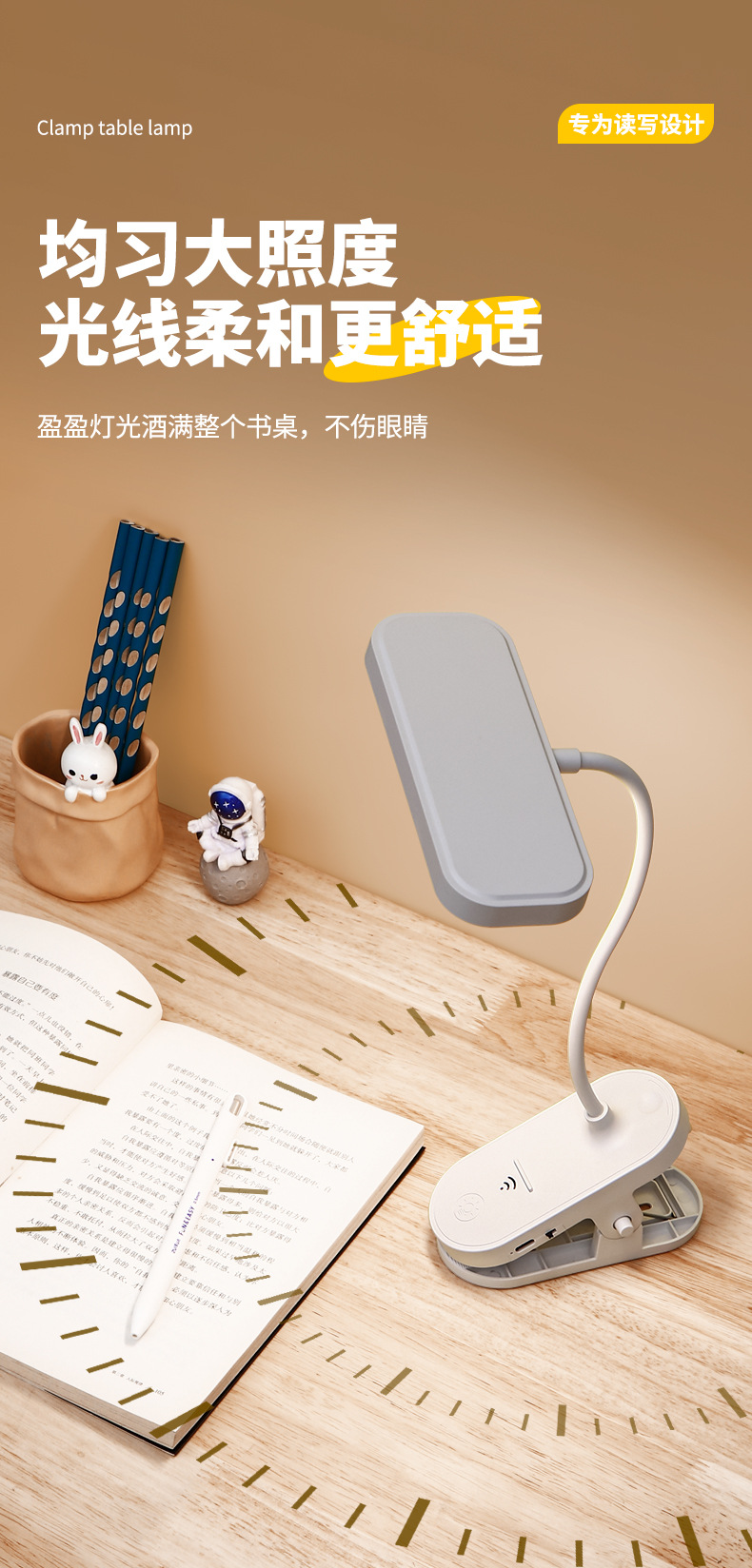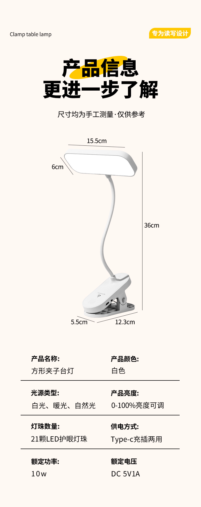 跨境方头夹式小台灯床头灯学习用学生宿舍led护眼充电卧室可夹灯