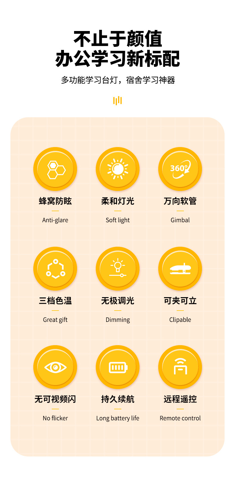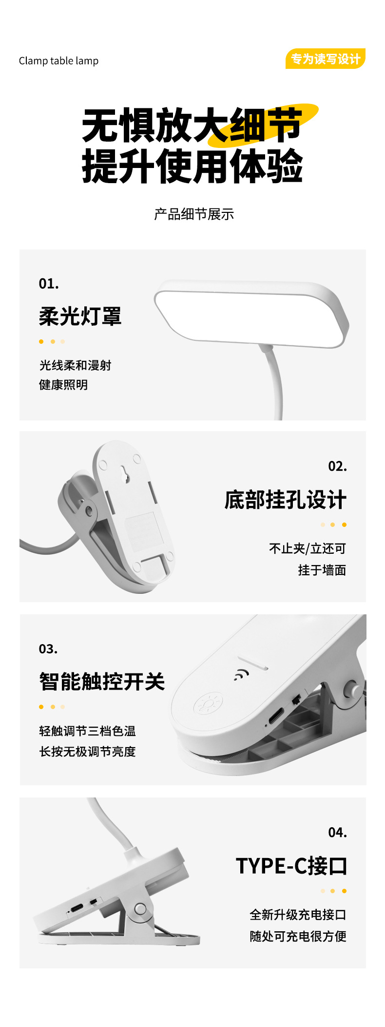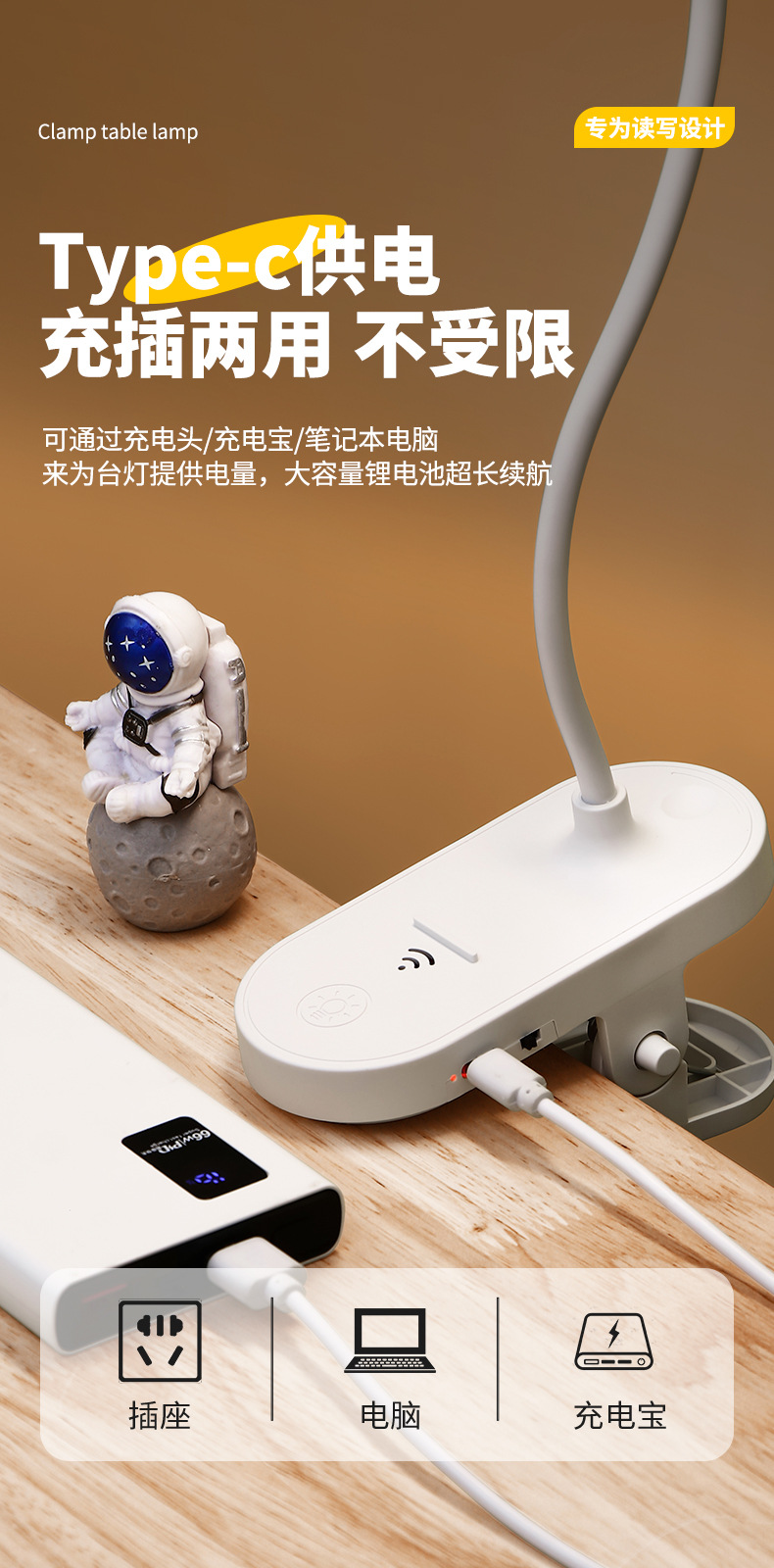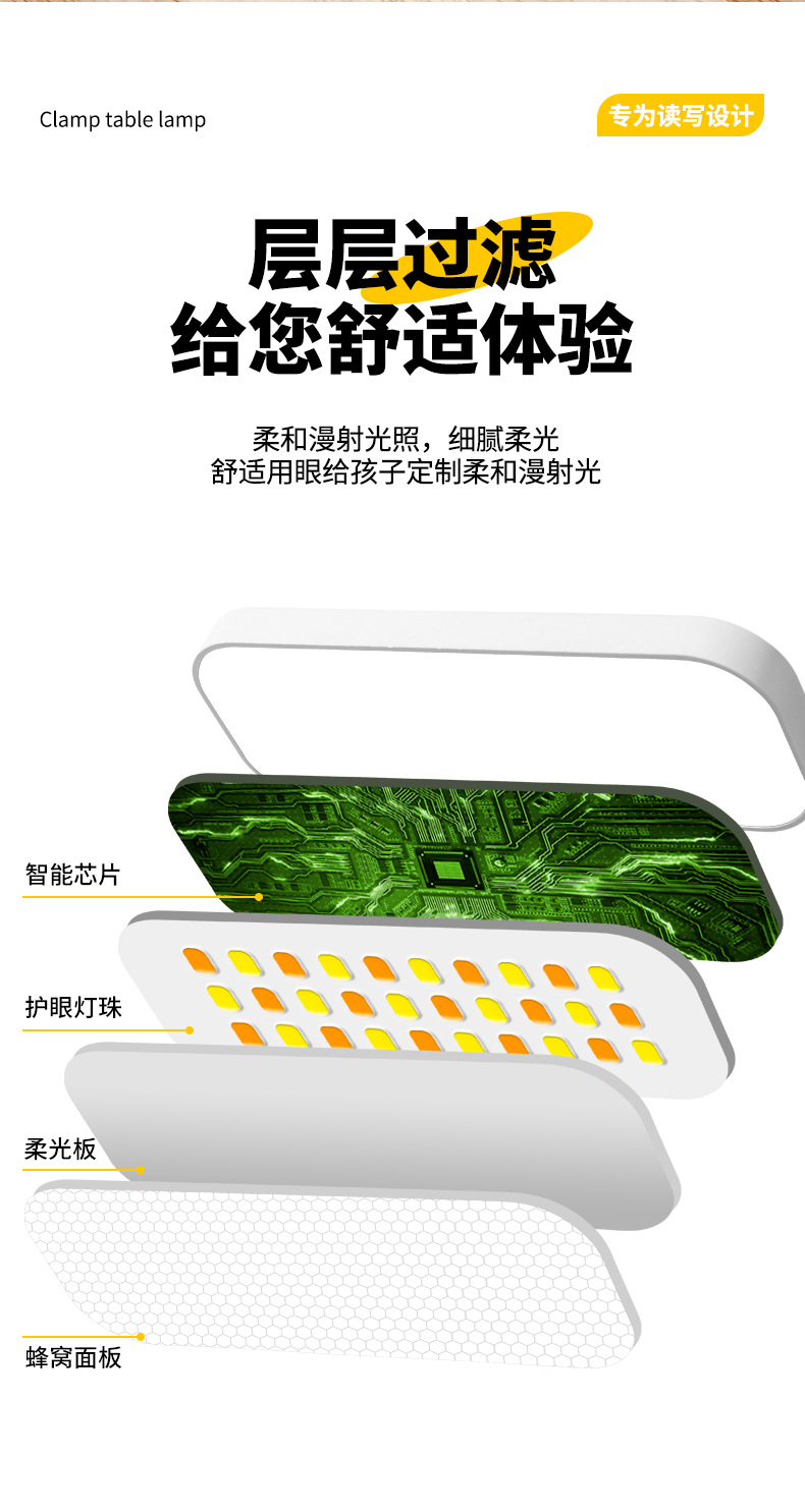 跨境方头夹式小台灯床头灯学习用学生宿舍led护眼充电卧室可夹灯