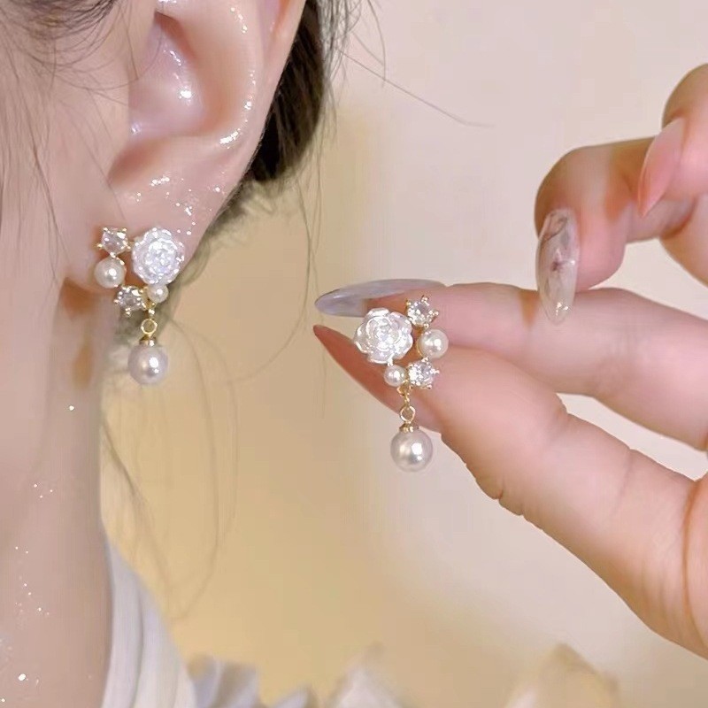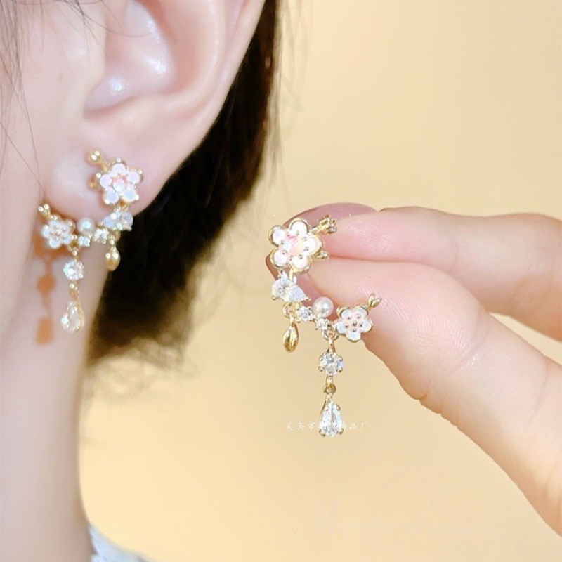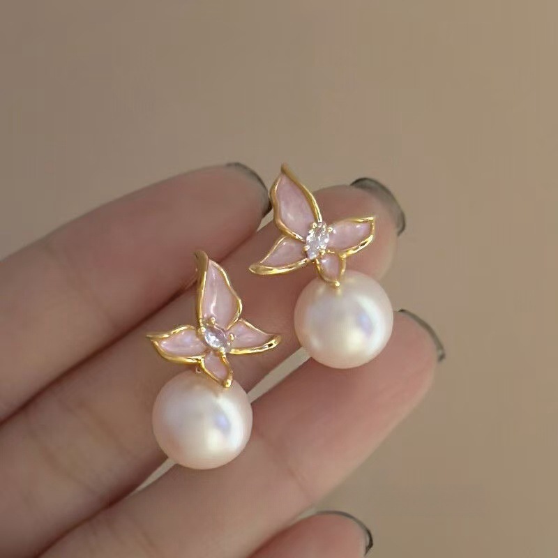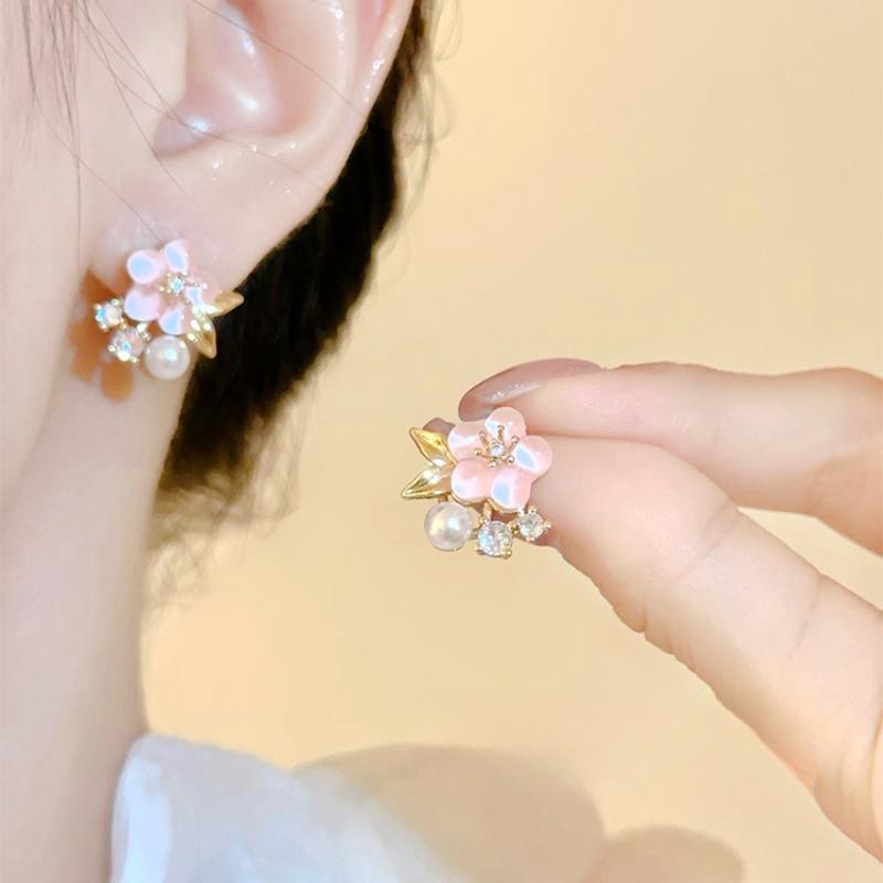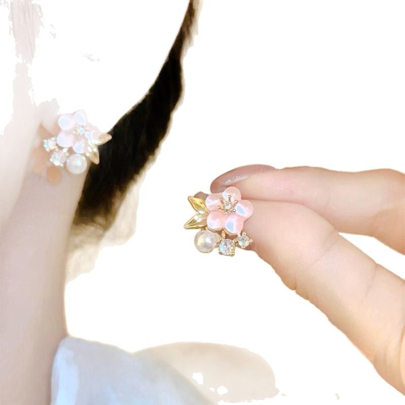 清新甜美粉色珍珠花朵春天耳钉气质超仙百搭高级感无耳洞耳夹女