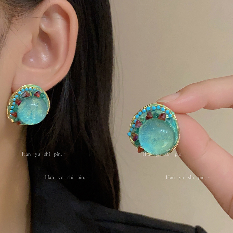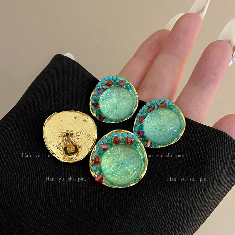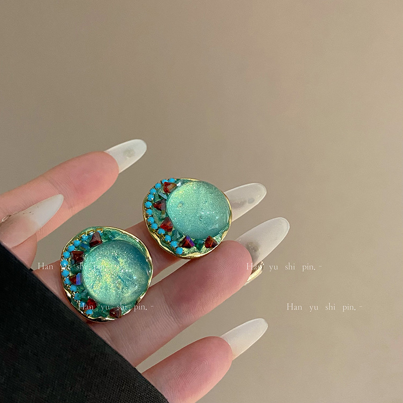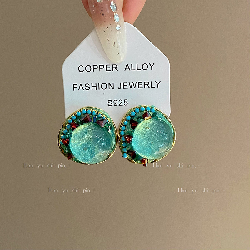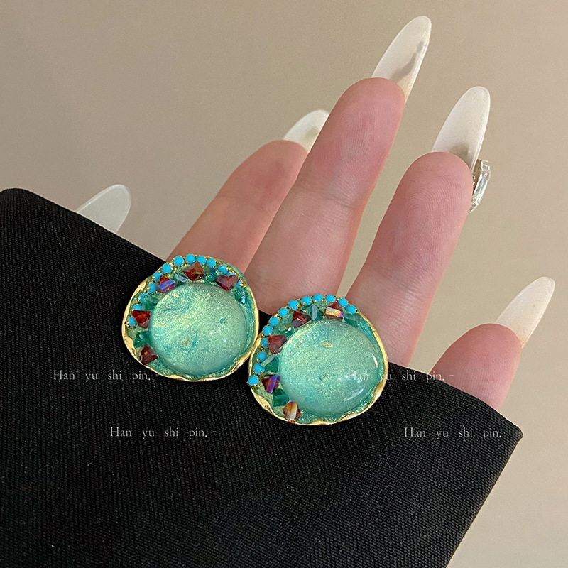 宫廷风彩色米珠水钻耳环时尚轻奢大气绿色琉璃几何耳钉女绿色琉璃