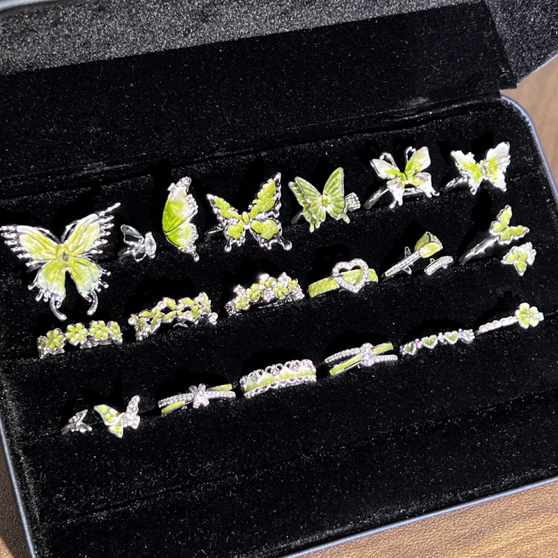 法式淡绿珐琅蝴蝶花朵开口戒指女ins冷淡风精致高级感百搭食指戒