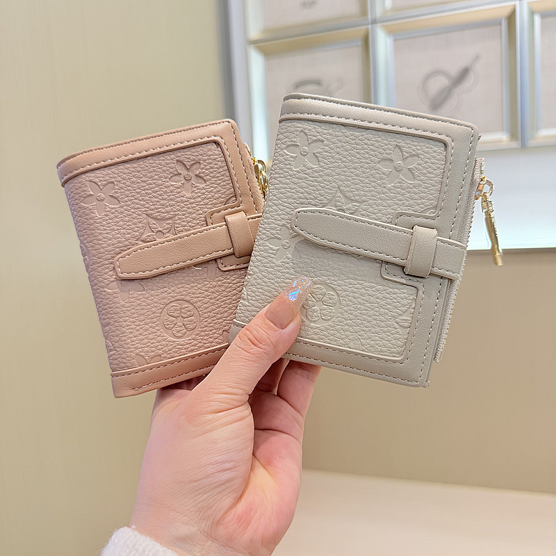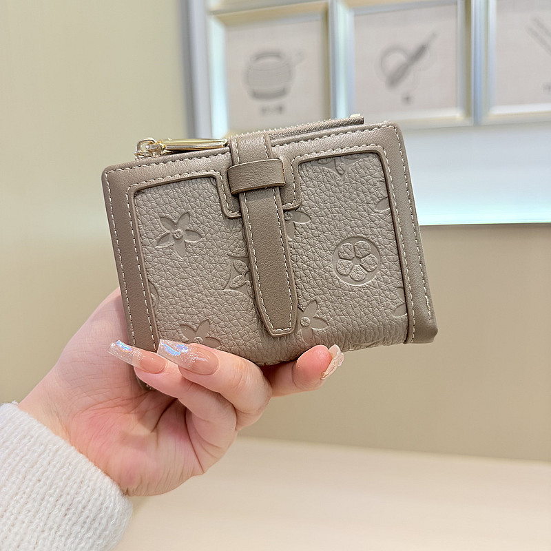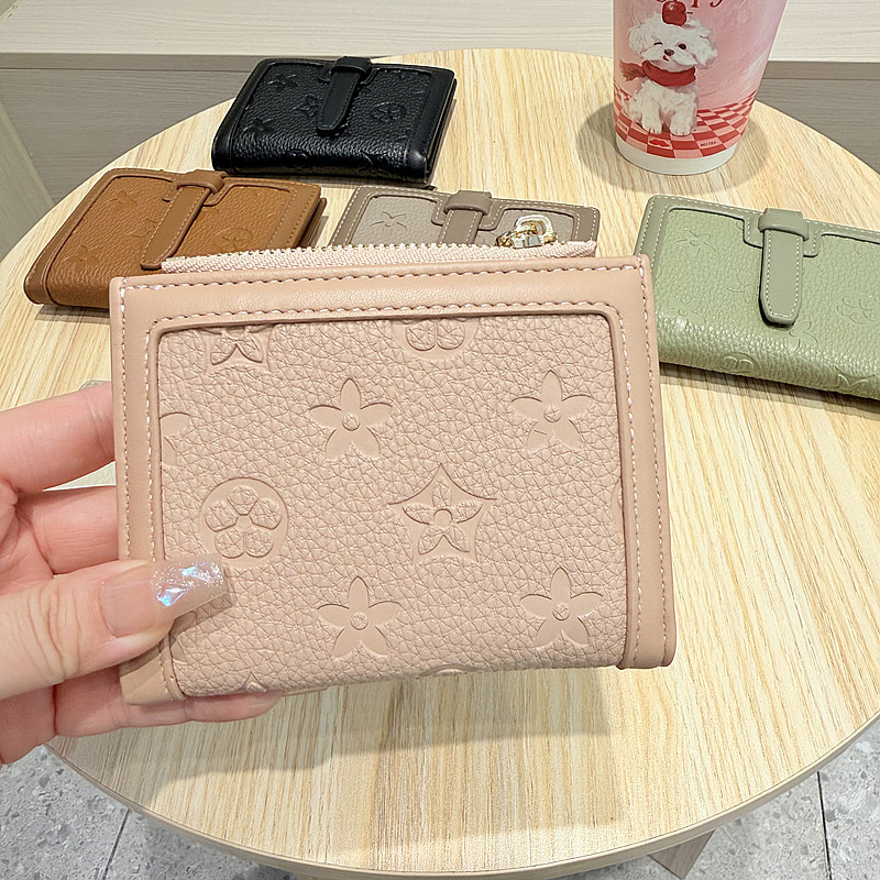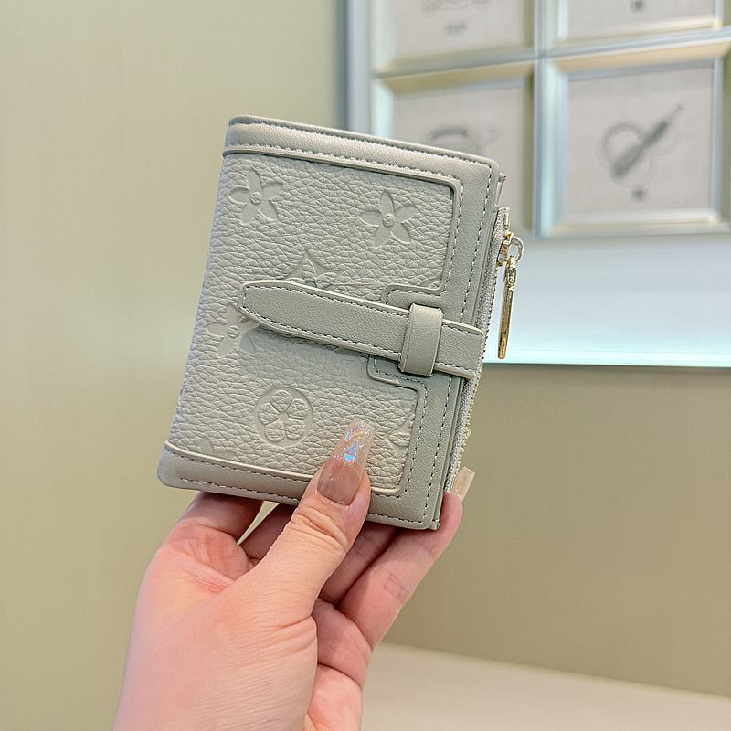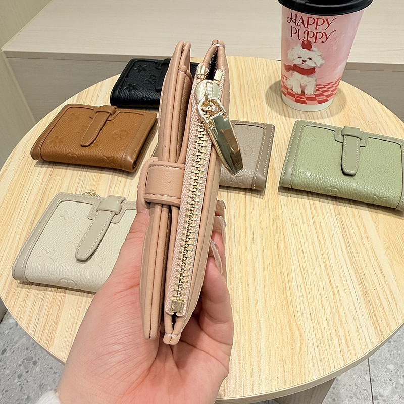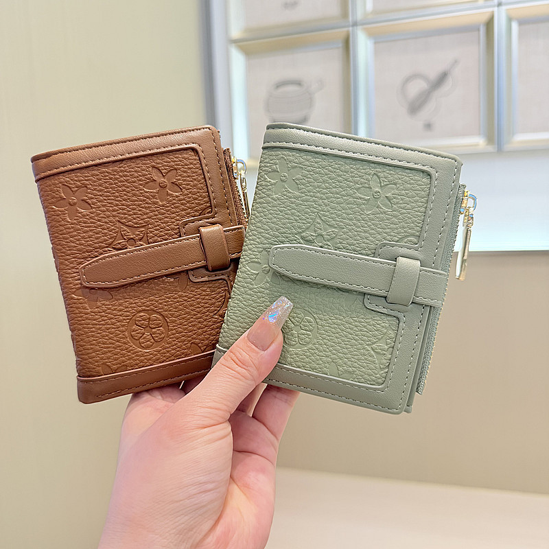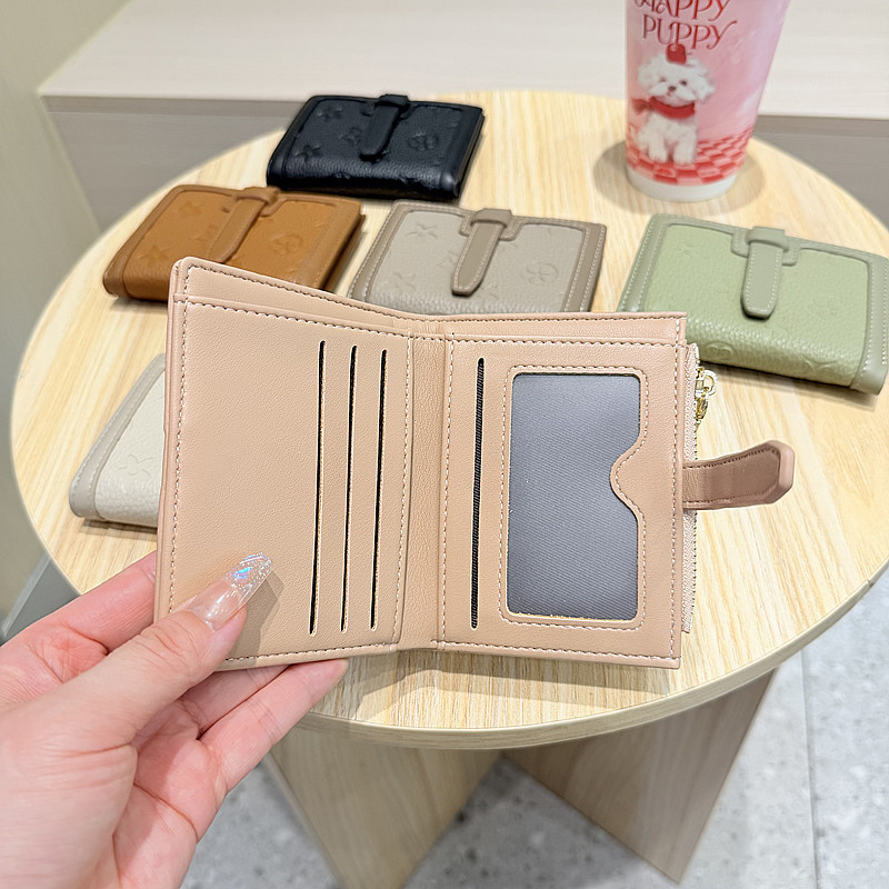 韩版简约纯色四叶草压花抽带高品质拉链搭扣两折短款钱包女