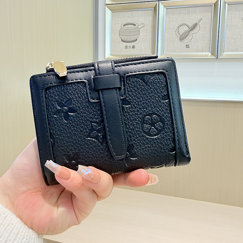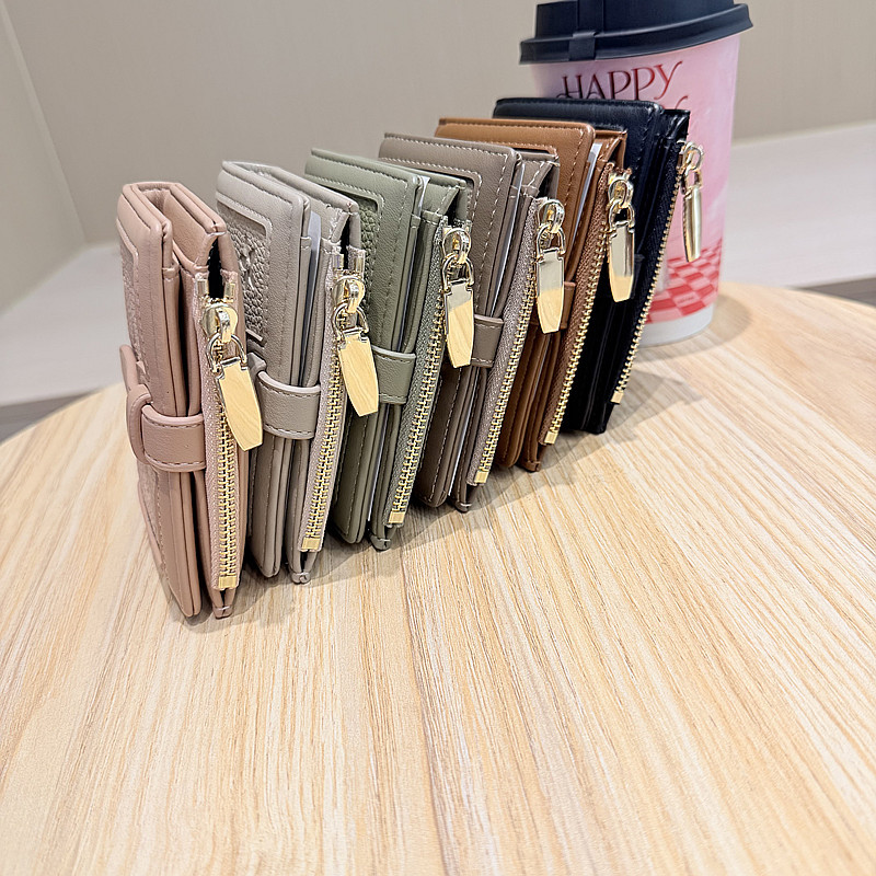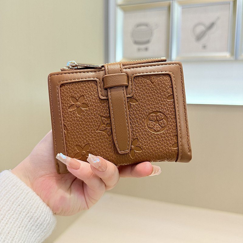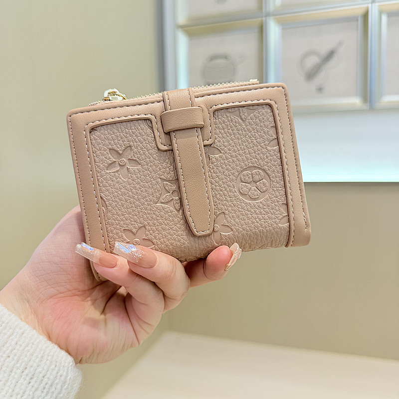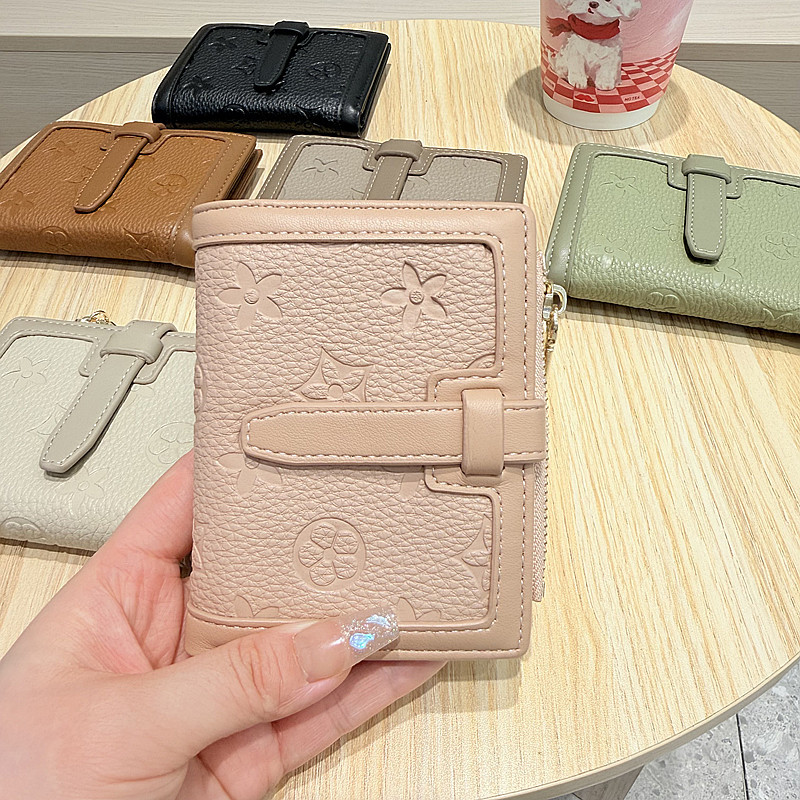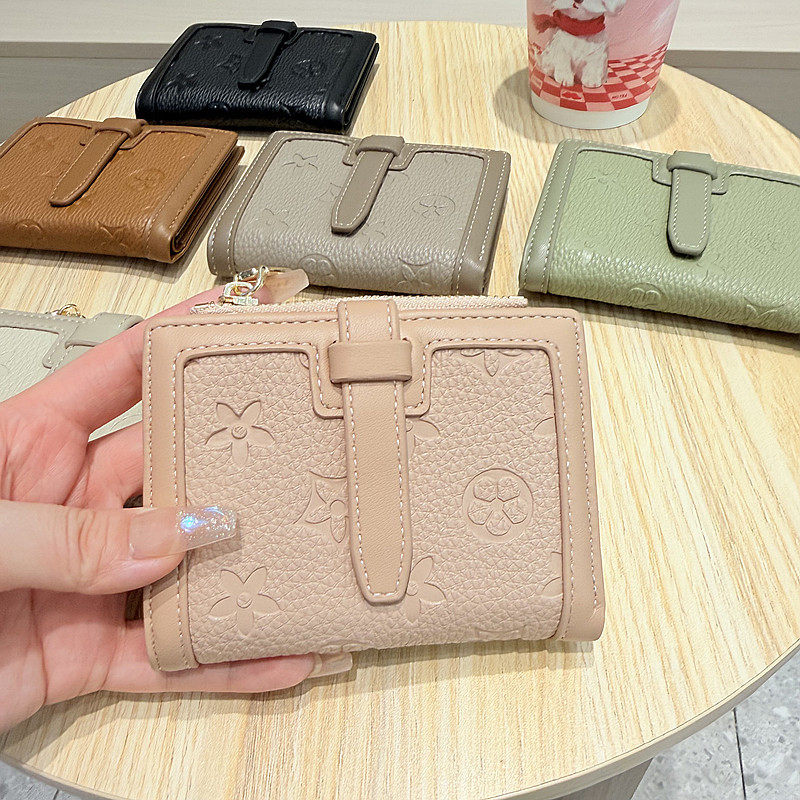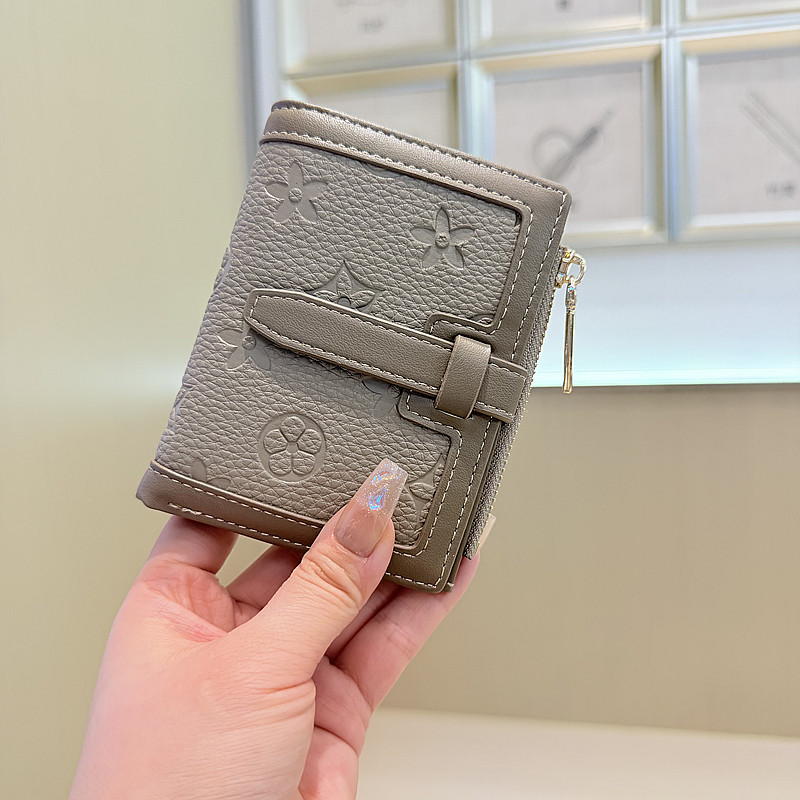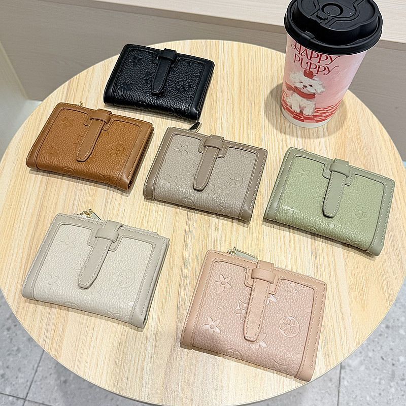 韩版简约纯色四叶草压花抽带高品质拉链搭扣两折短款钱包女