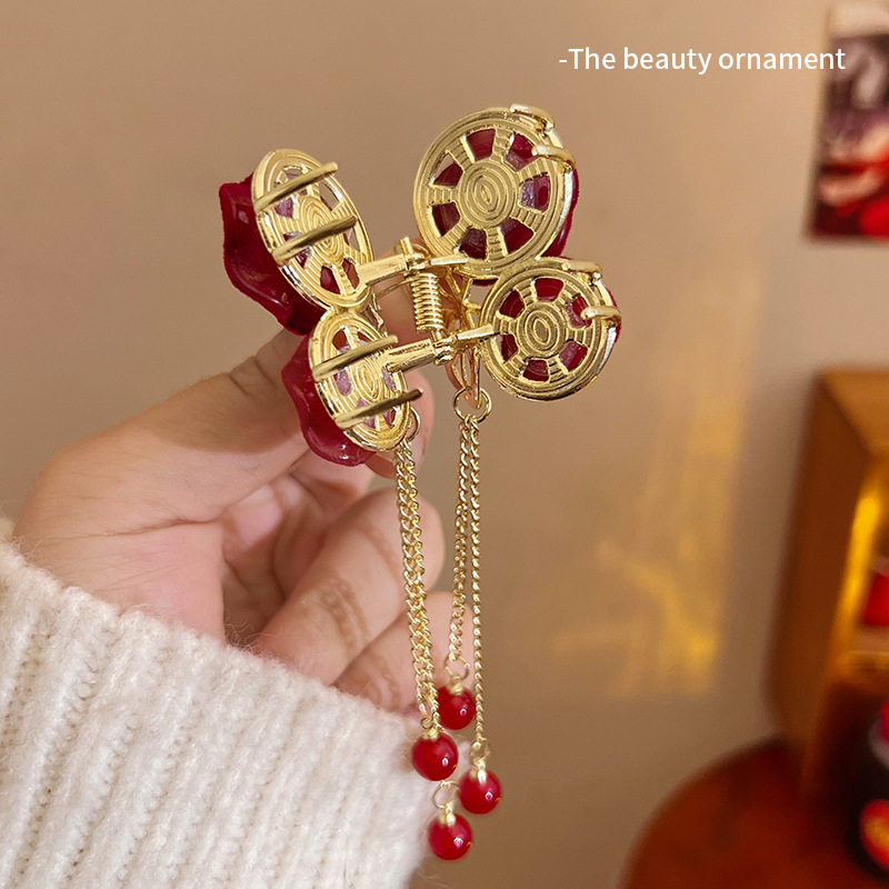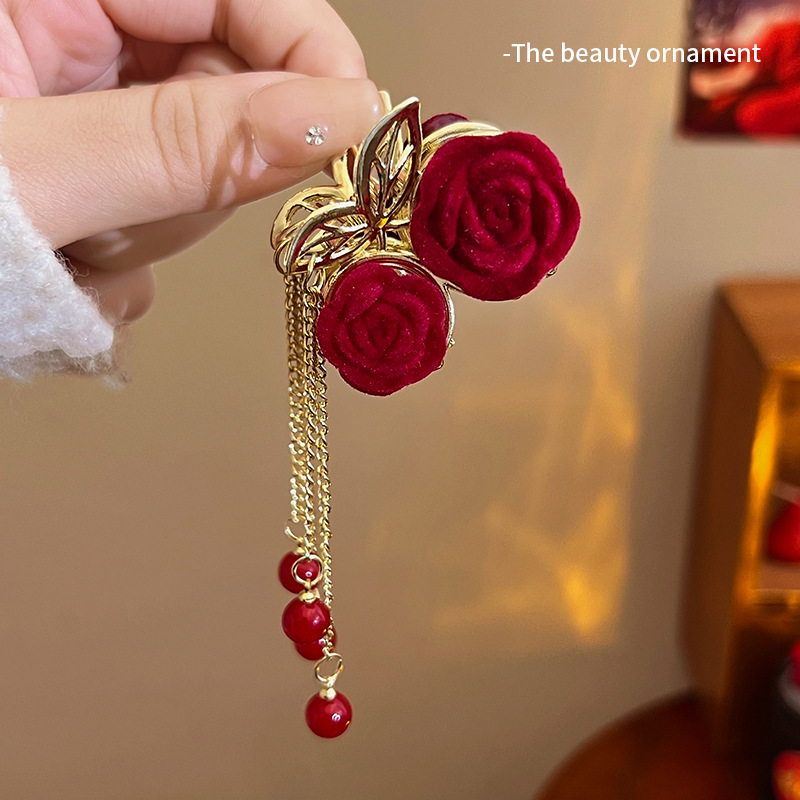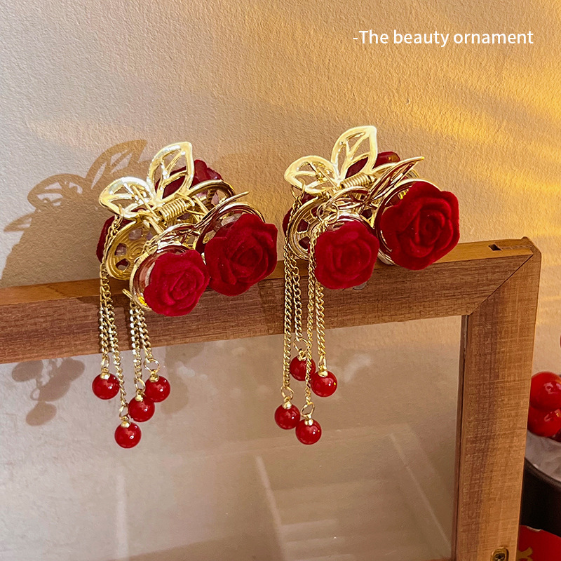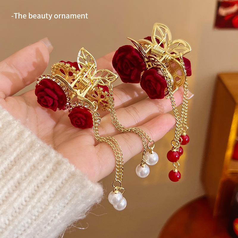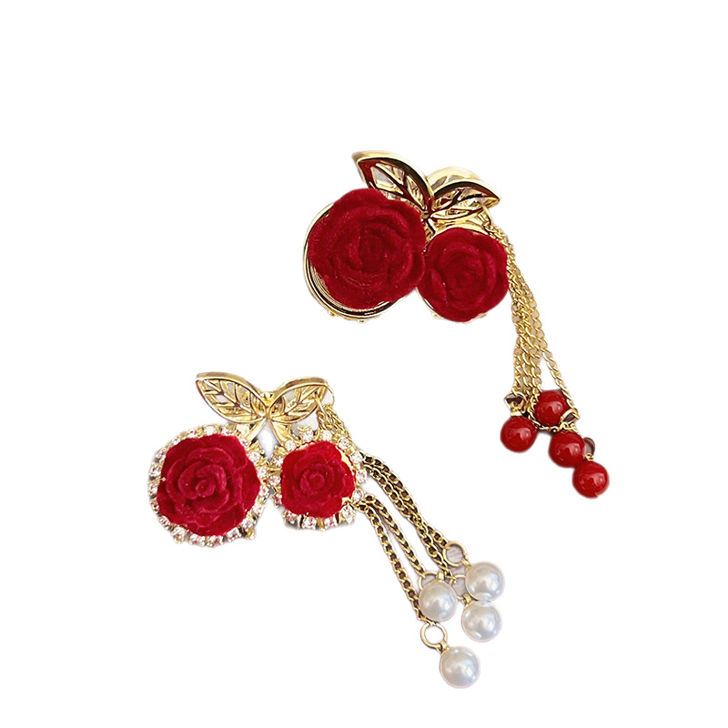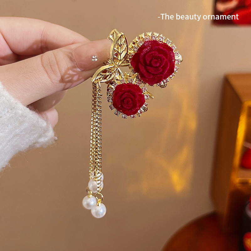 轻奢樱桃珍珠流苏半扎抓夹发量少红色植绒玫瑰花发夹新年发饰头饰