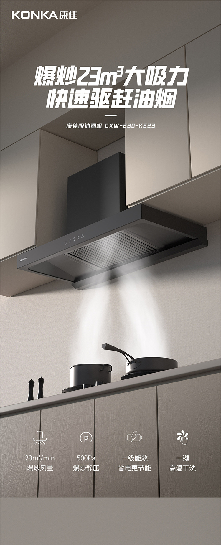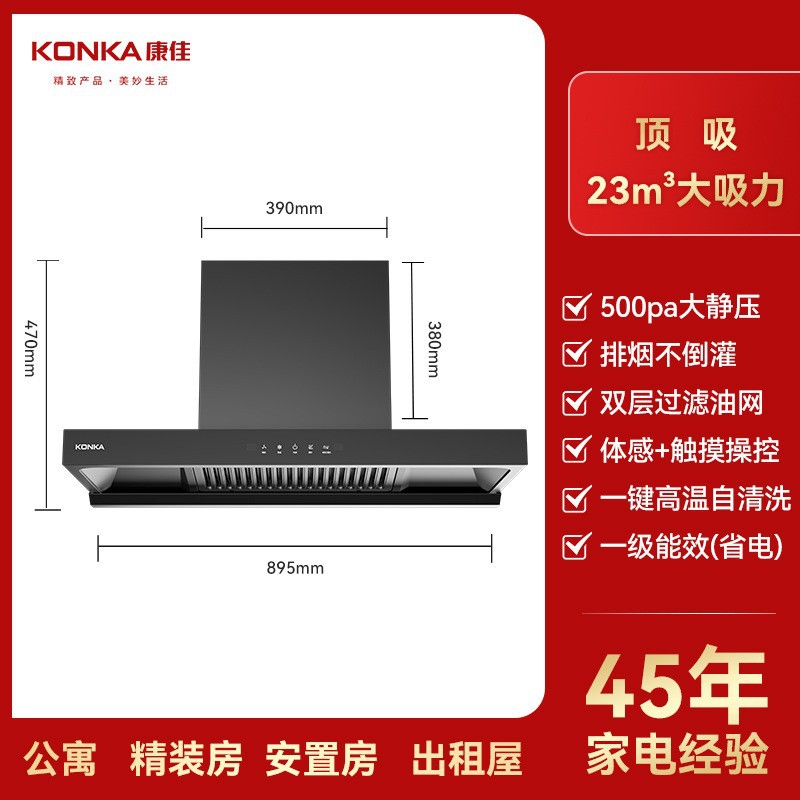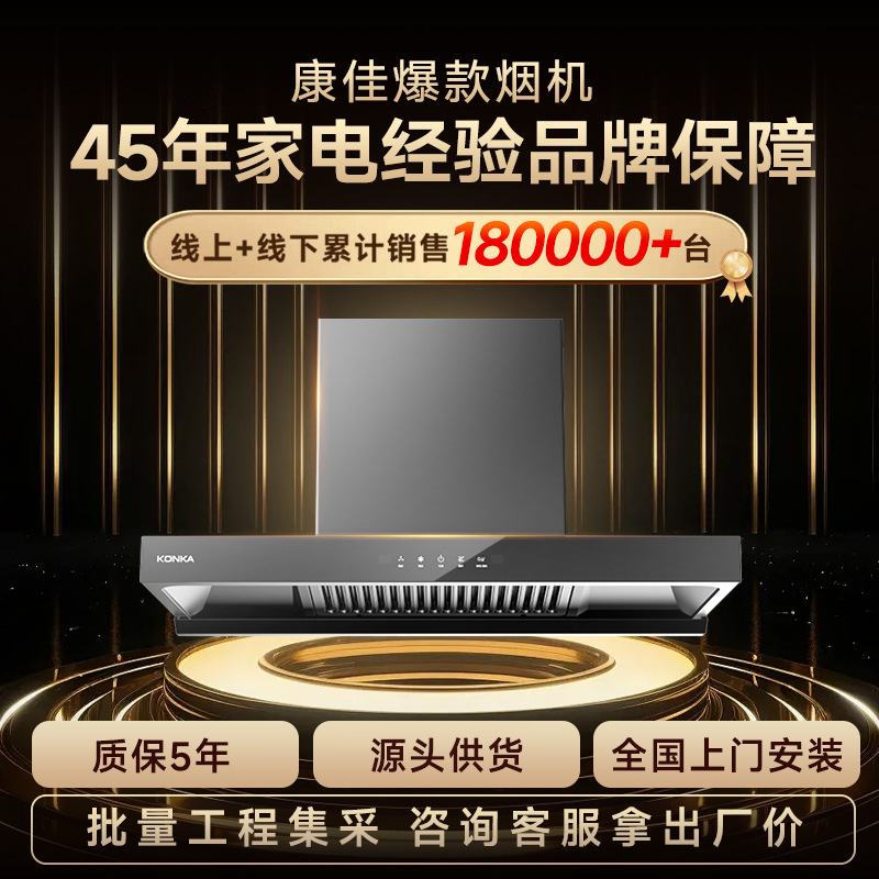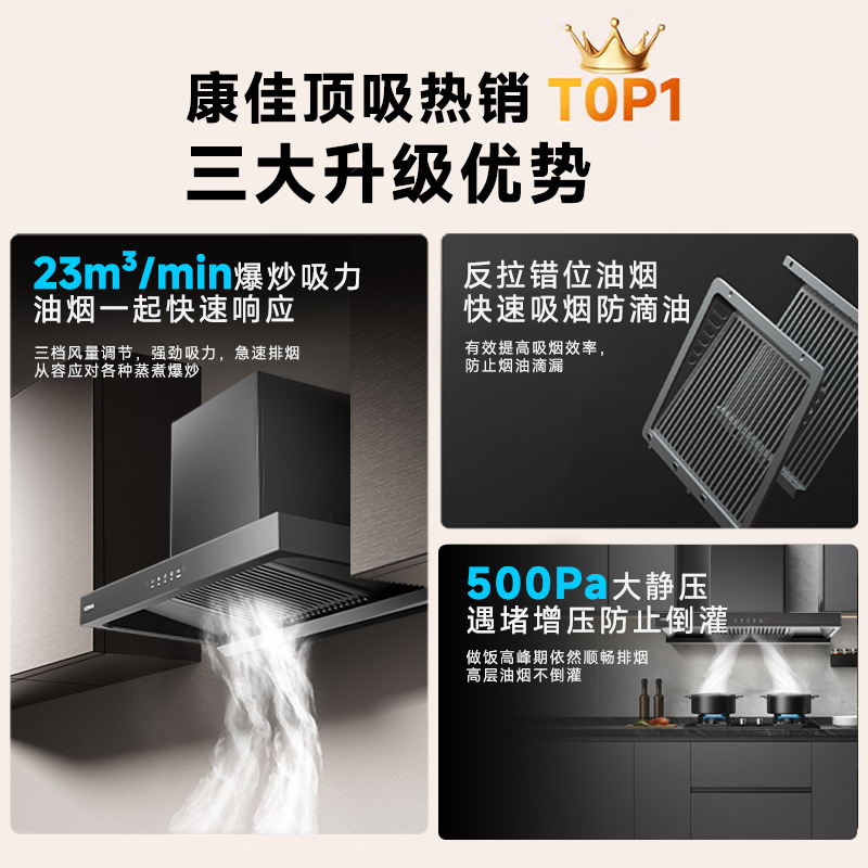 康佳厂家直销低噪音顶吸大吸力油烟机家用厨房自清洗抽油烟机批发